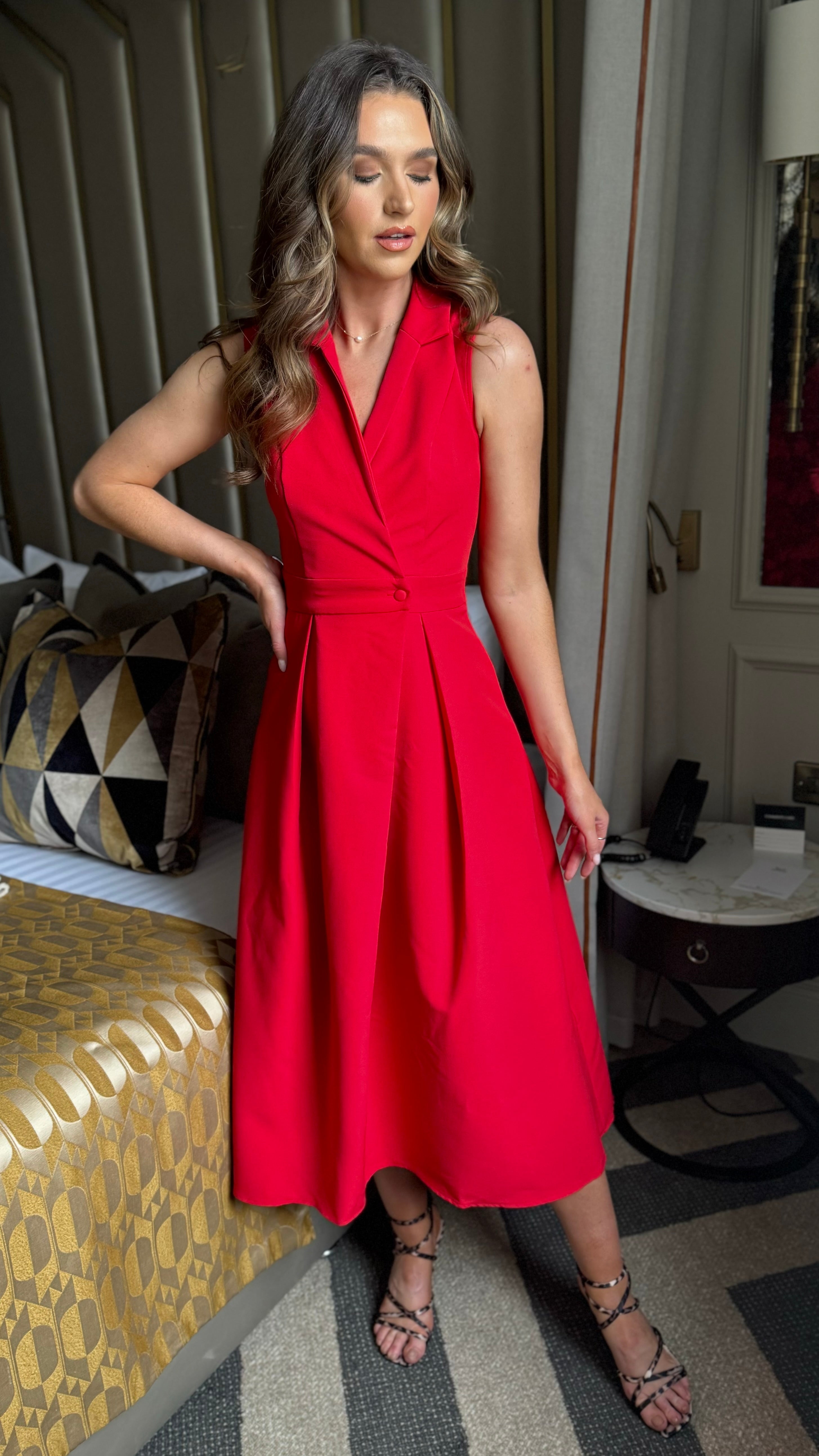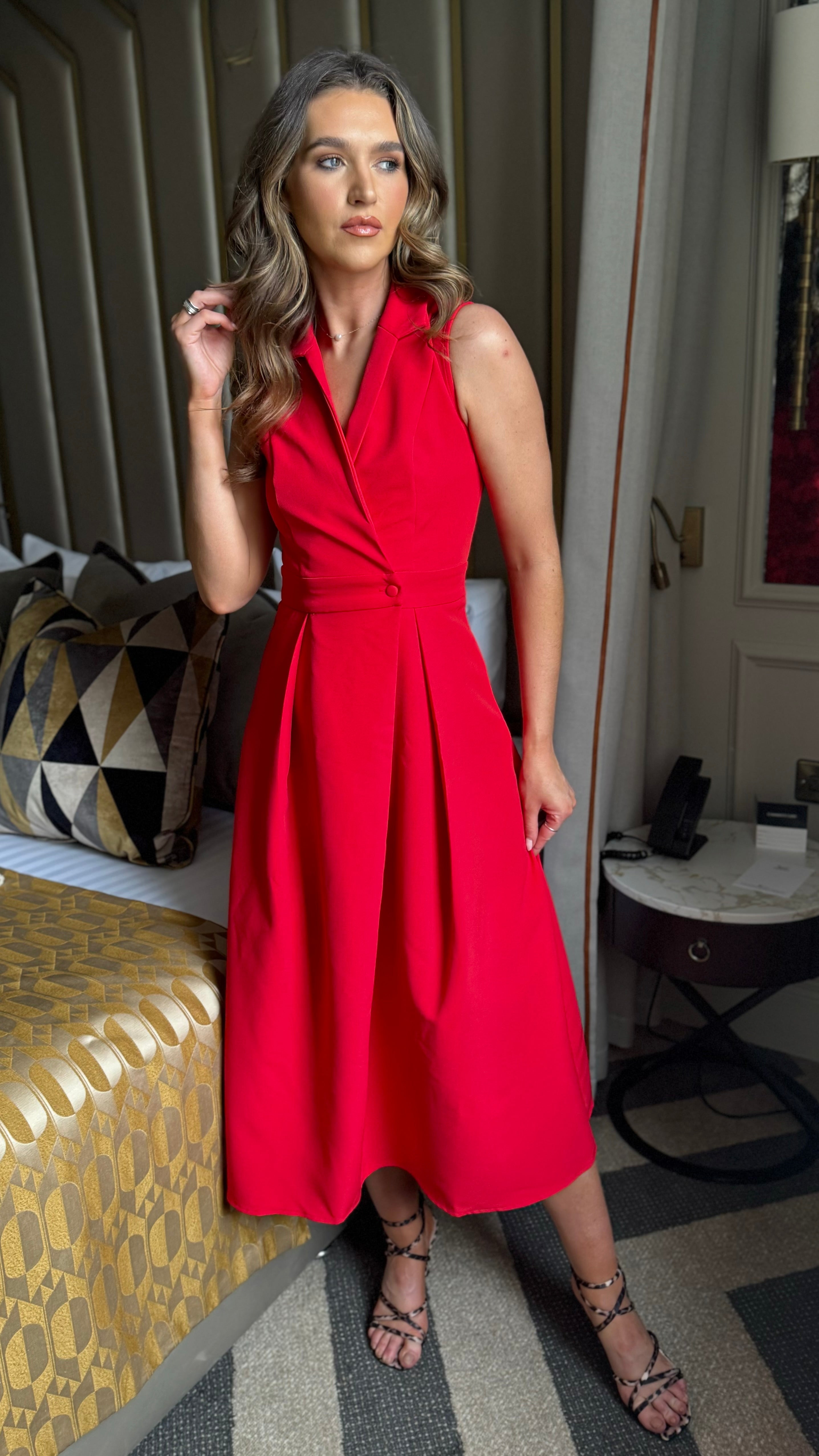 Makenna Red Collared Tailored Shirt Midi Dress