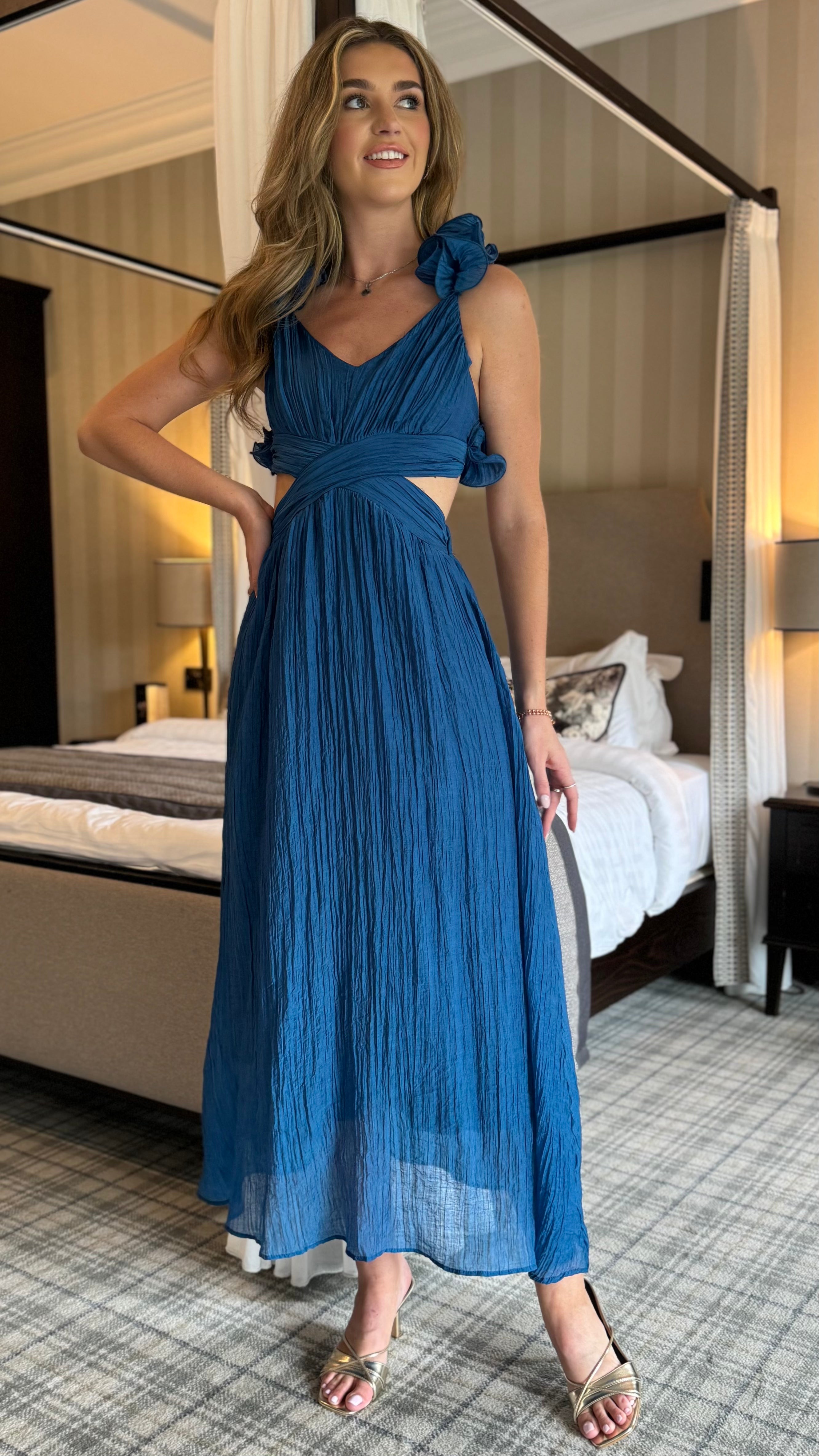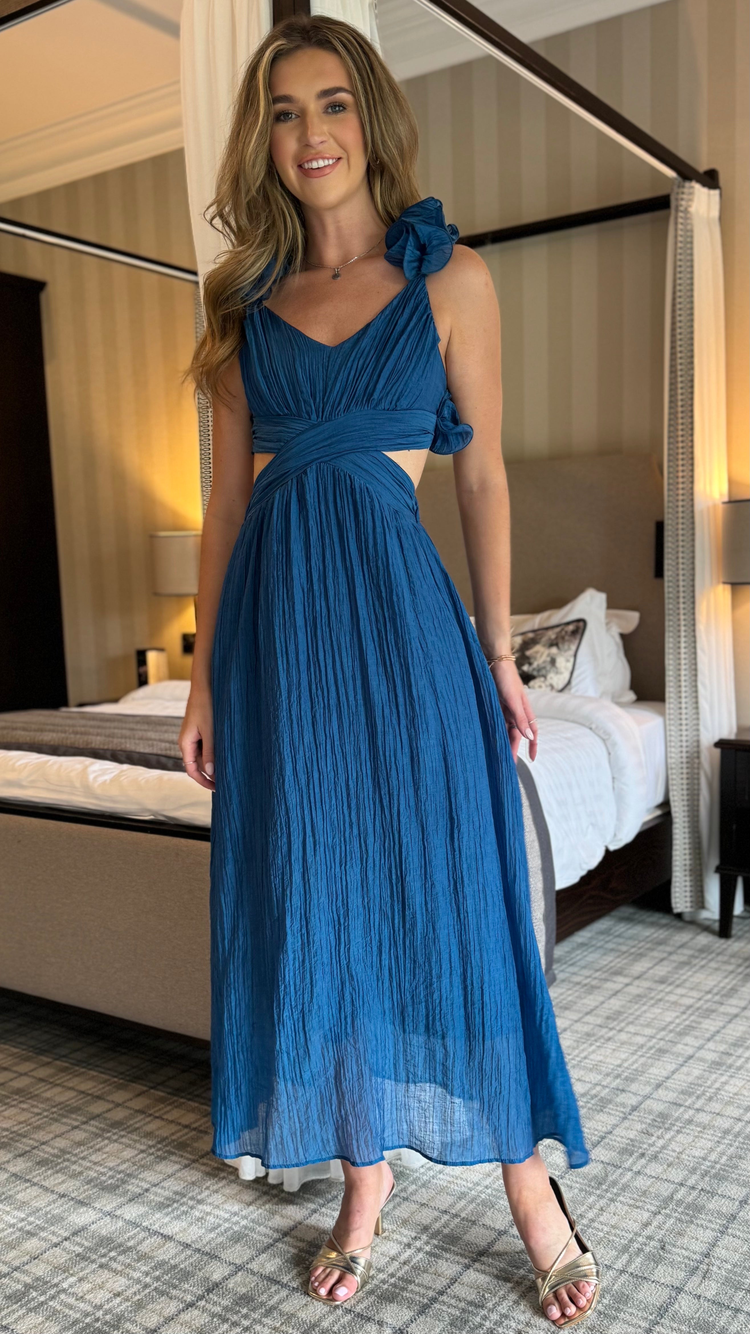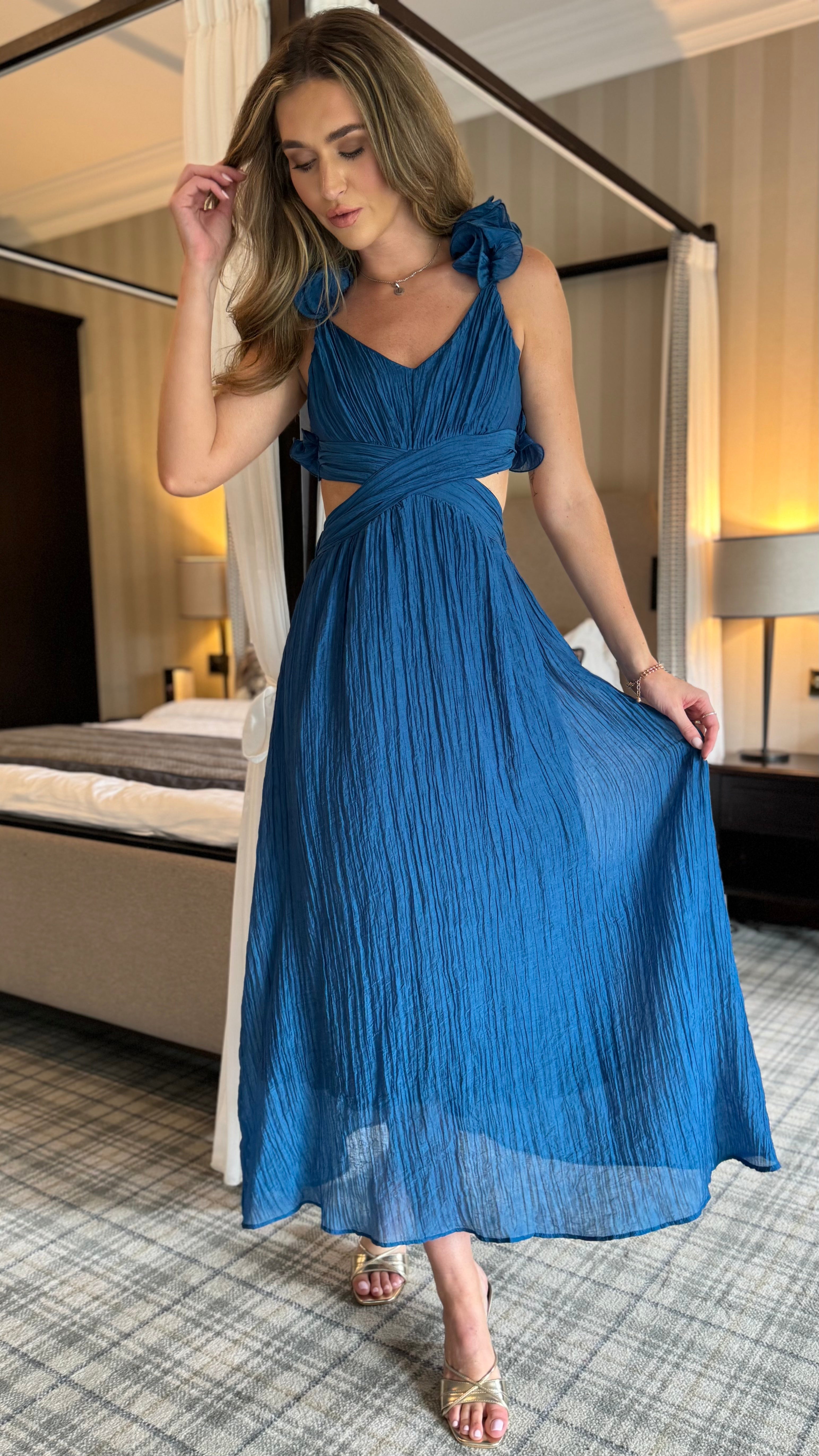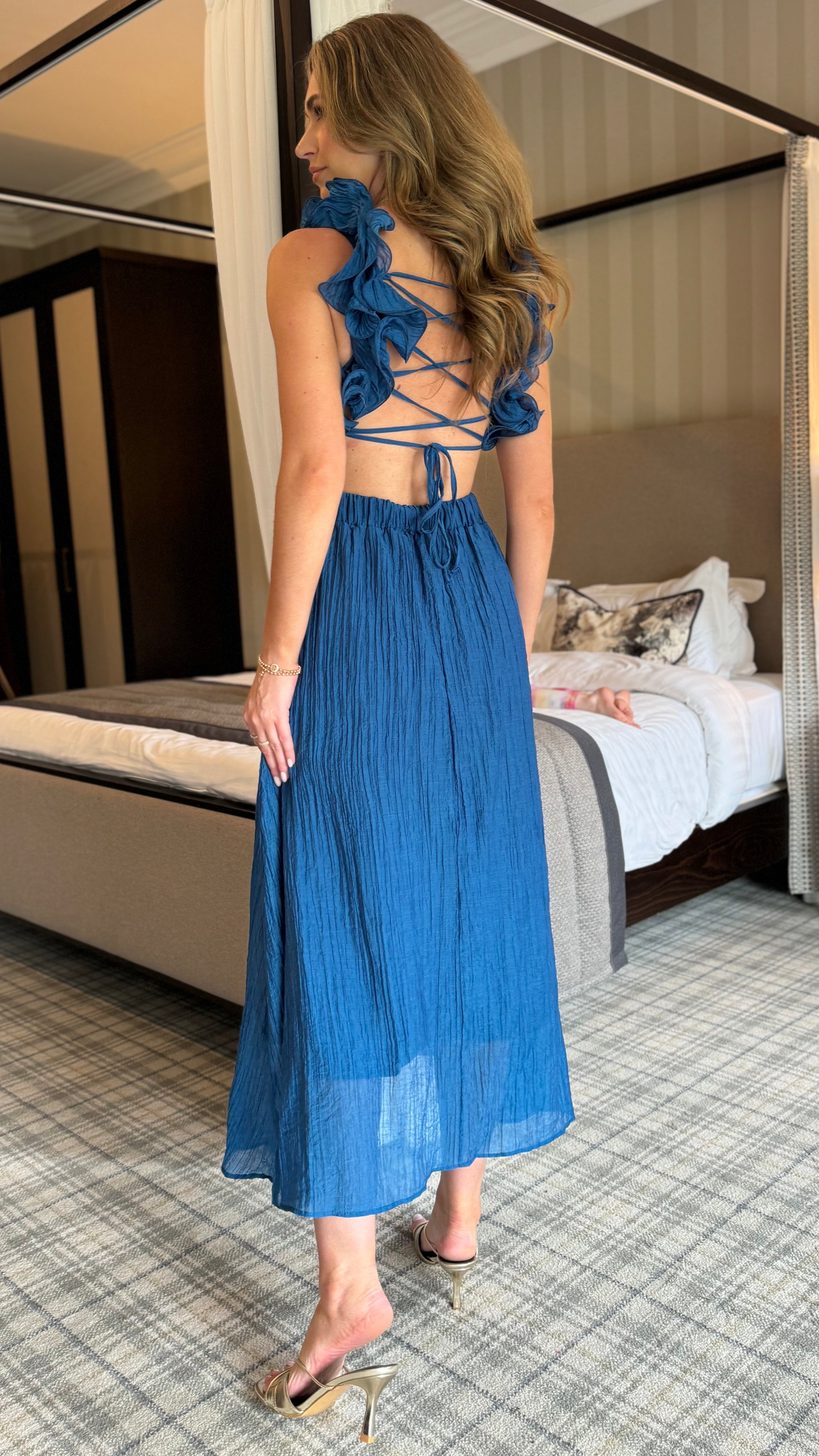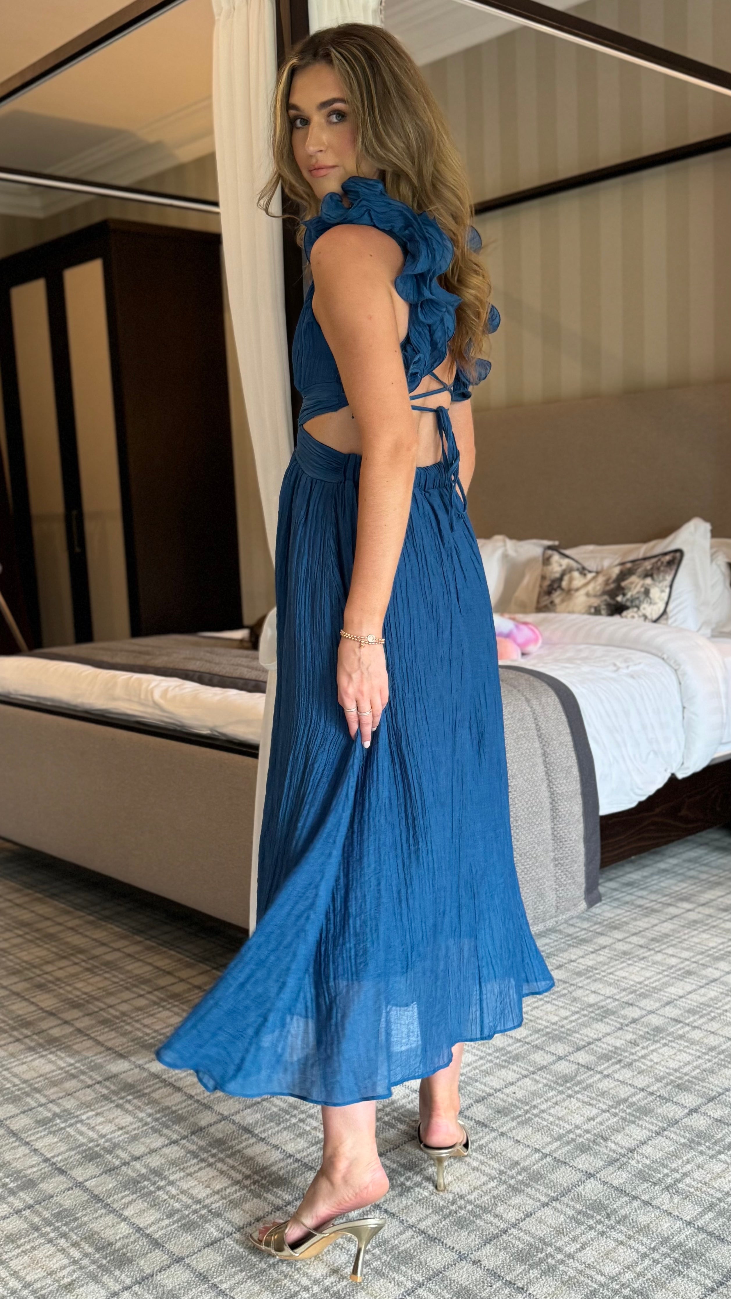 The Elsa Teal Ruffle Details Backless Midi Dress exudes timeless elegance with its flowing silhouette and delicate ruffle accents. Its backless design adds a touch of allure, while the rich navy colour ensures a sophisticated look. Perfect for formal events or evening occasions, this midi dress combines graceful style with refined charm.