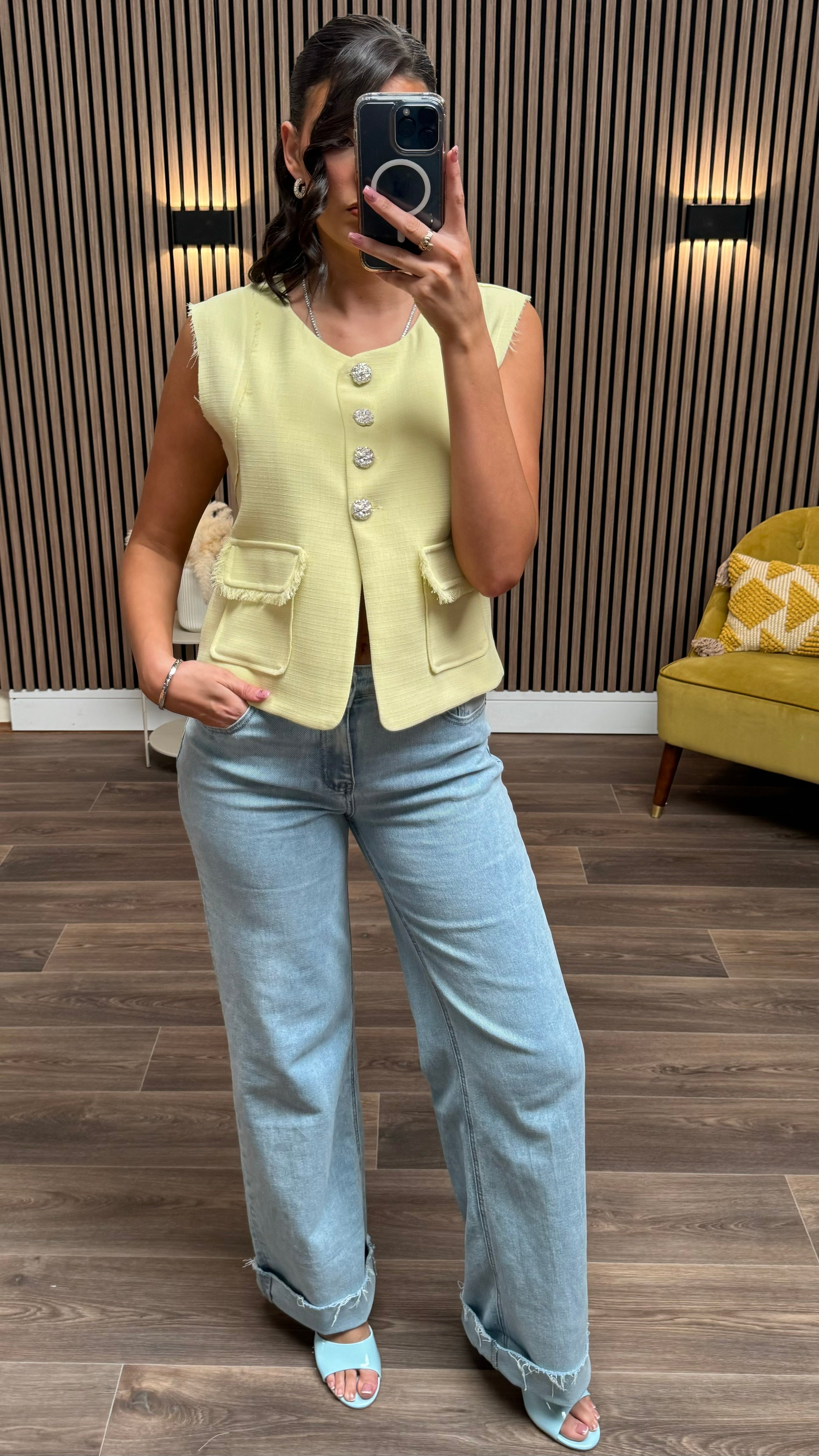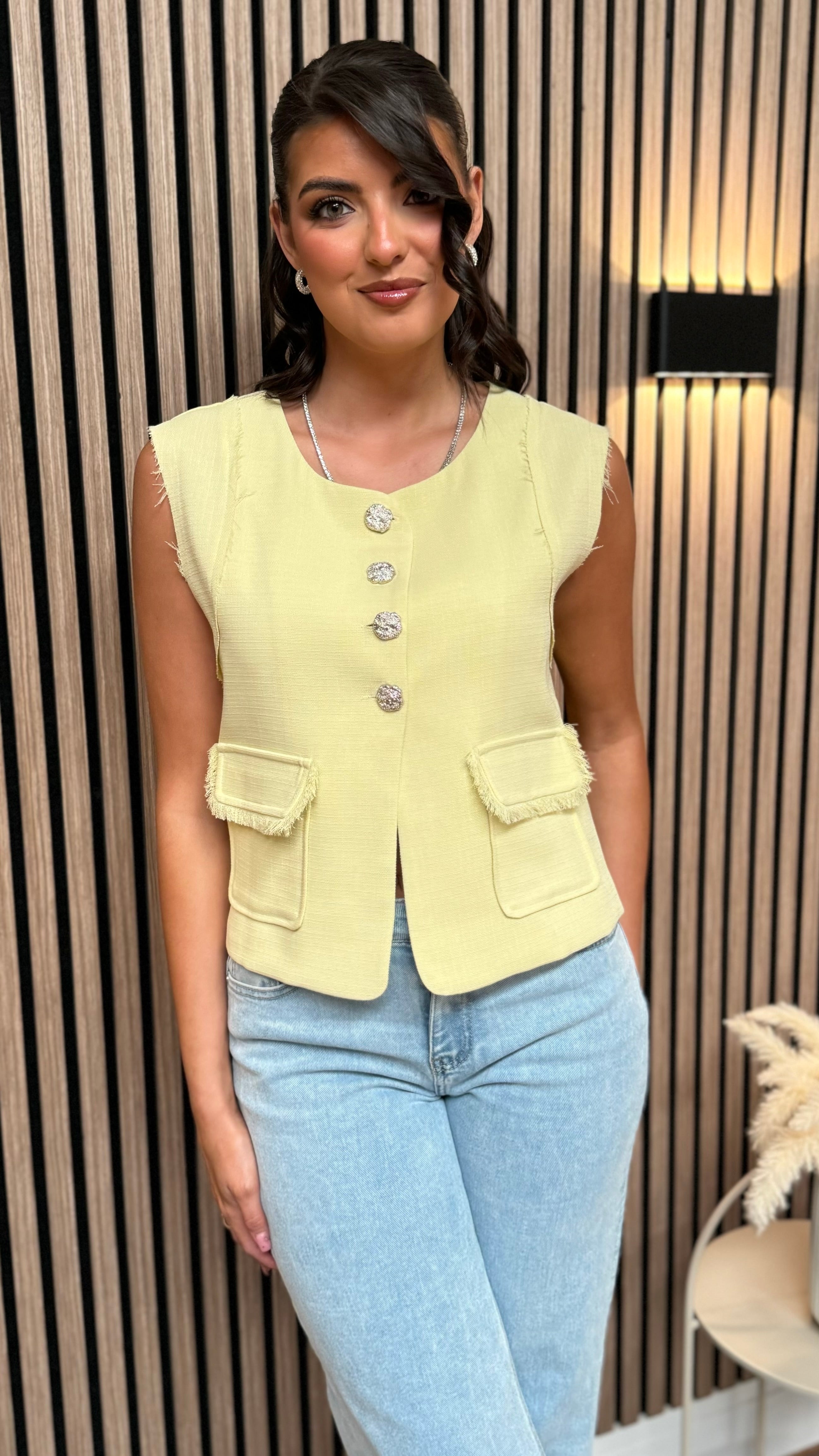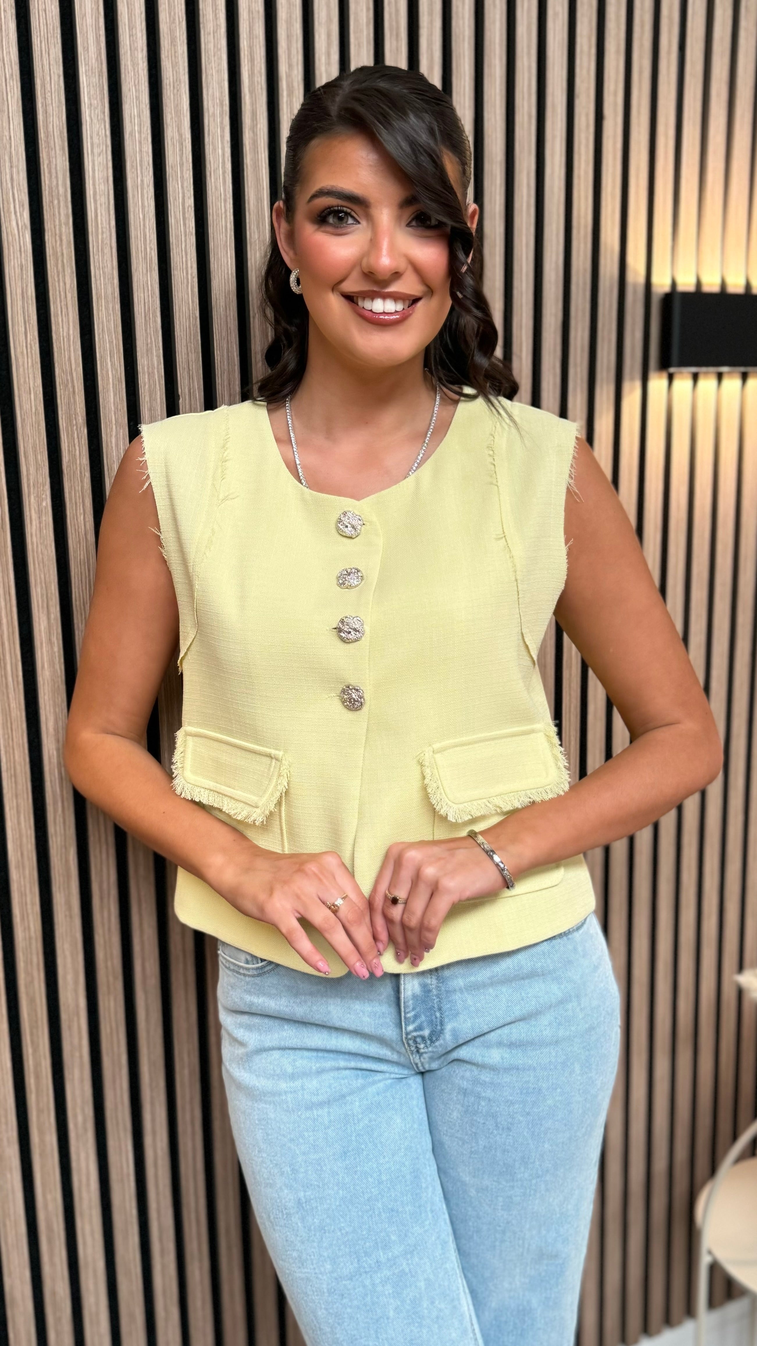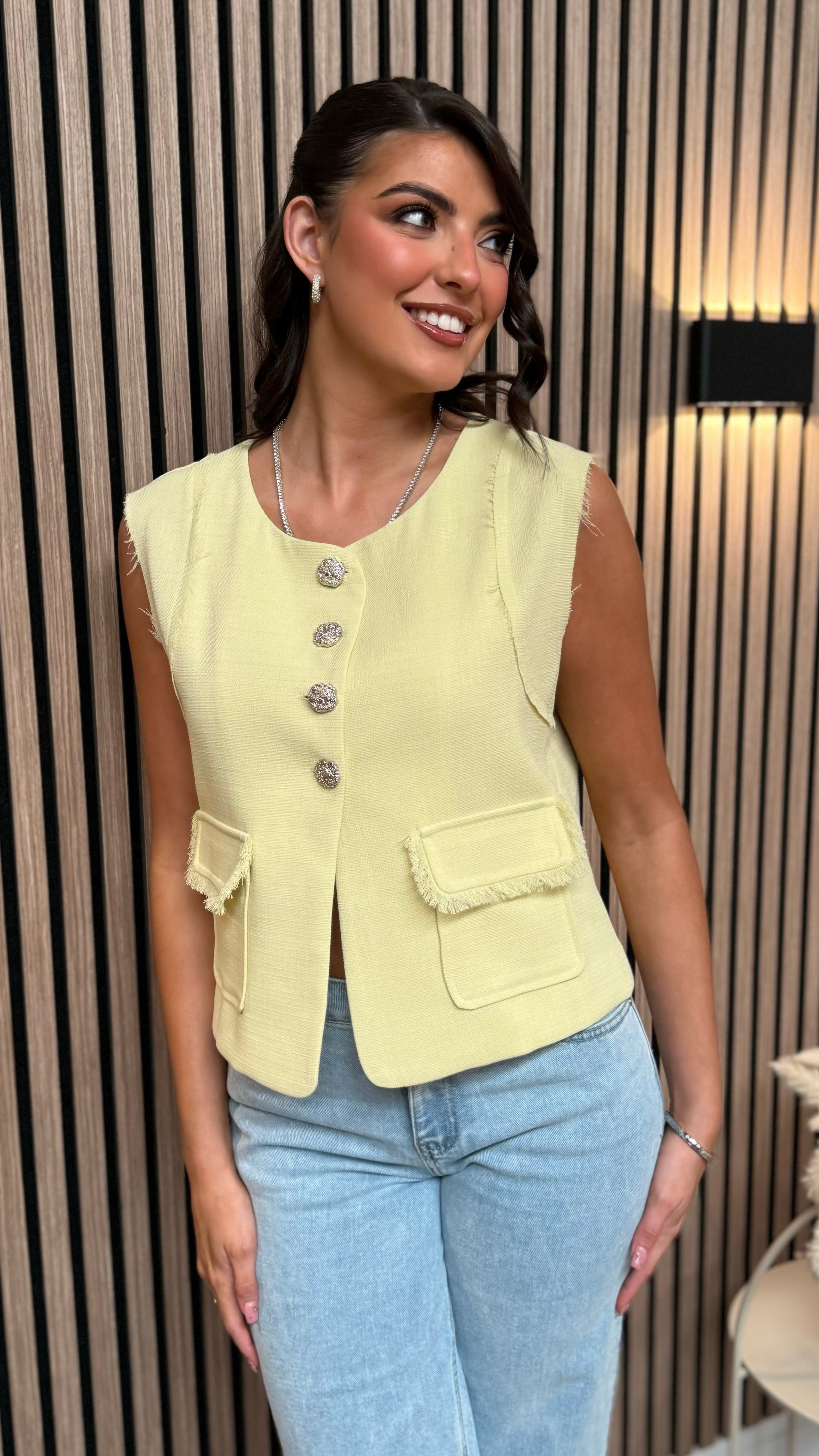 Stay trendy and elegant with the Rosabel Yellow Button Down Waistcoat 🎩 This sleeveless vest features round metal buttons and pockets with cut-out details for a unique touch. Perfect for layering and making a statement!