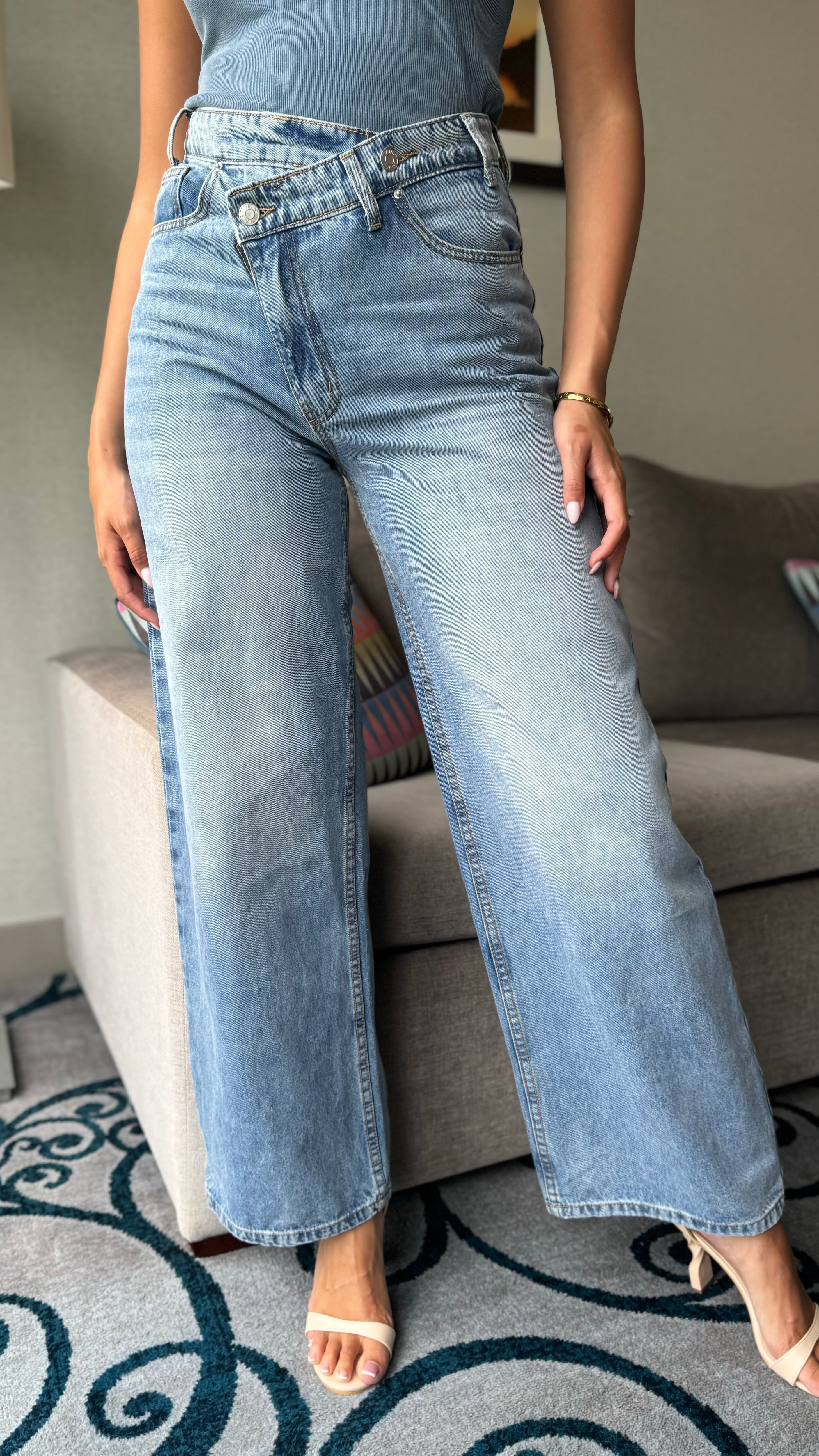 Trisha Light Blue Denim Asymmetrical Waist Wide Leg Jeans