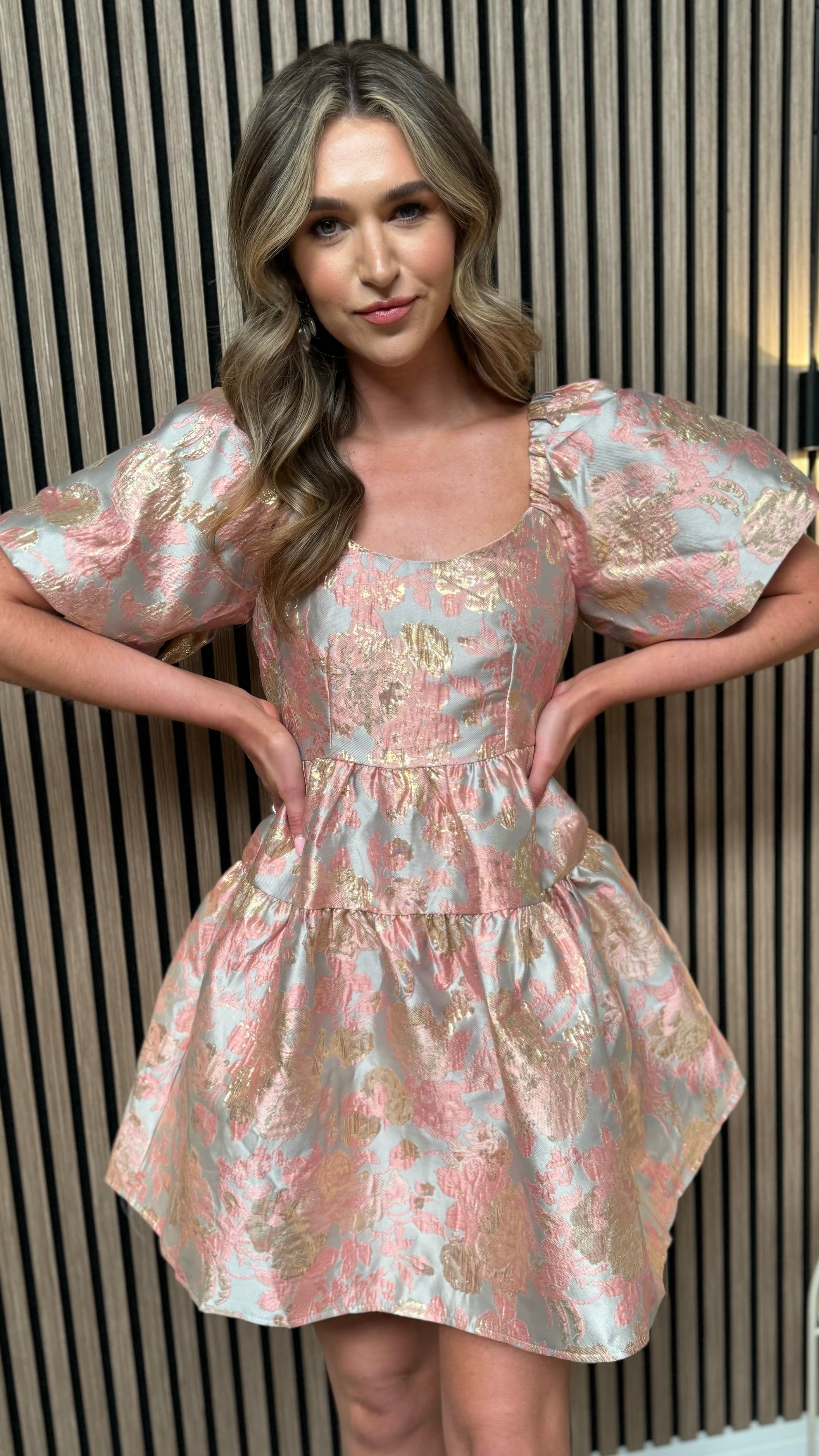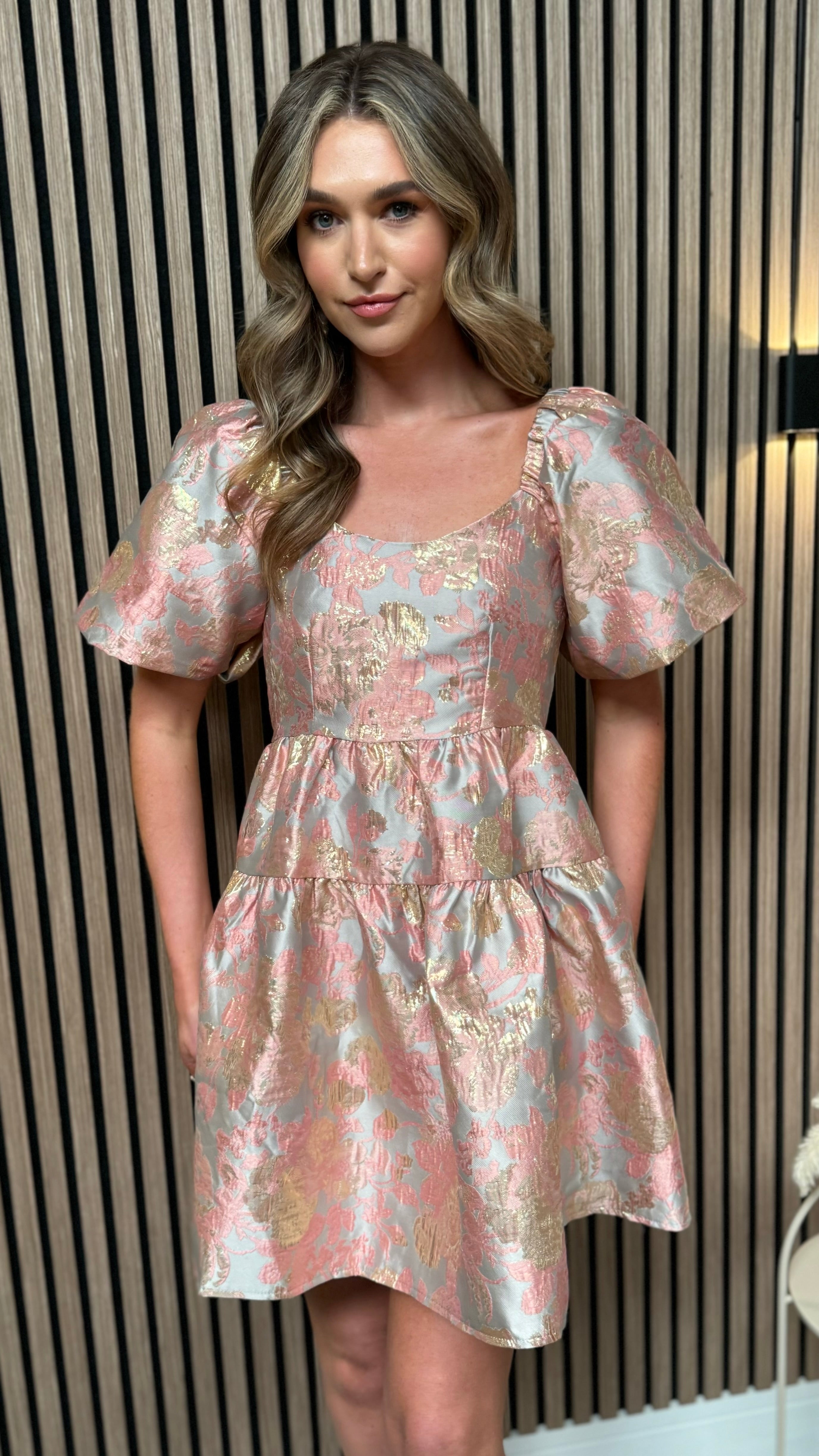 Laurina Gold & Beige Puff Sleeve Mini Dress
