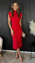 Get ready to turn heads in the Tess Red High Neck Midi Dress! With its short sleeves and back split, this dress is both sleek and comfortable. The high neck and fitted design add a touch of sophistication to any outfit. 🌟
