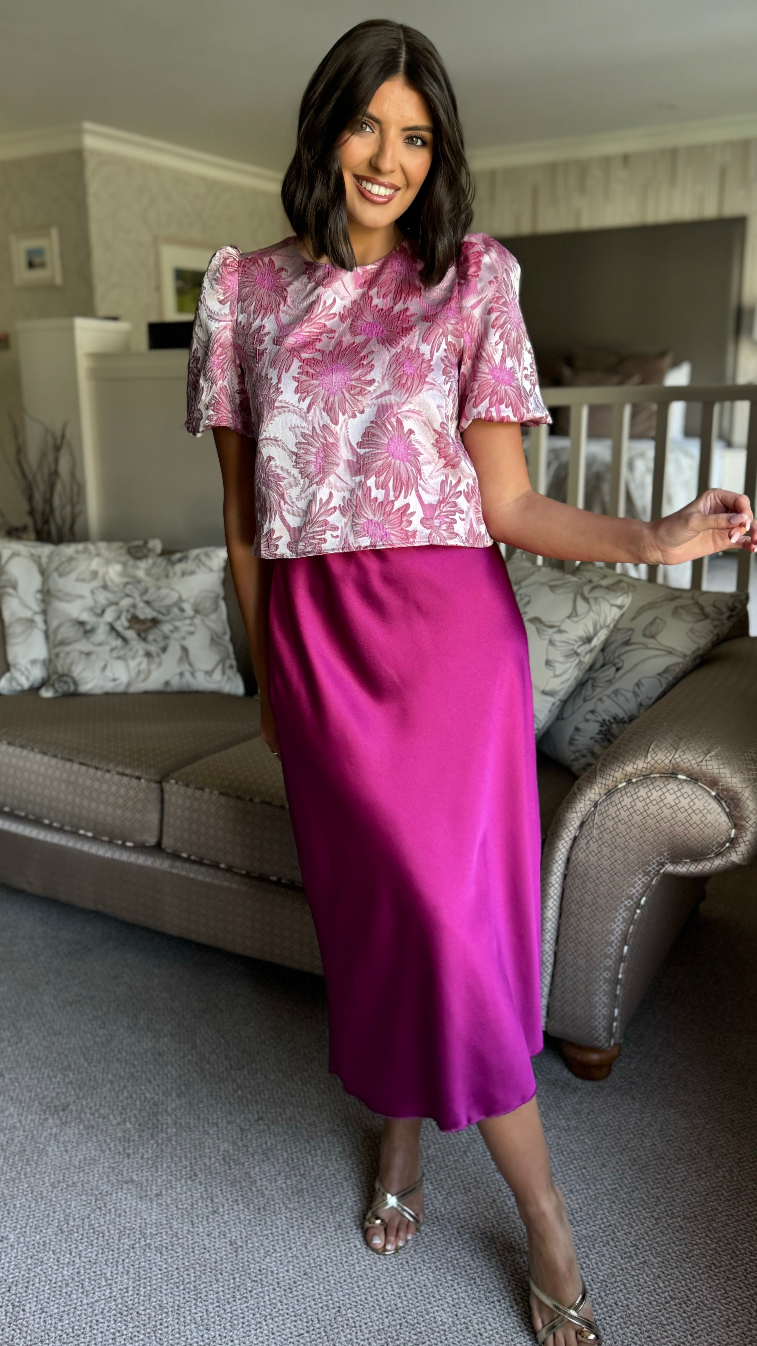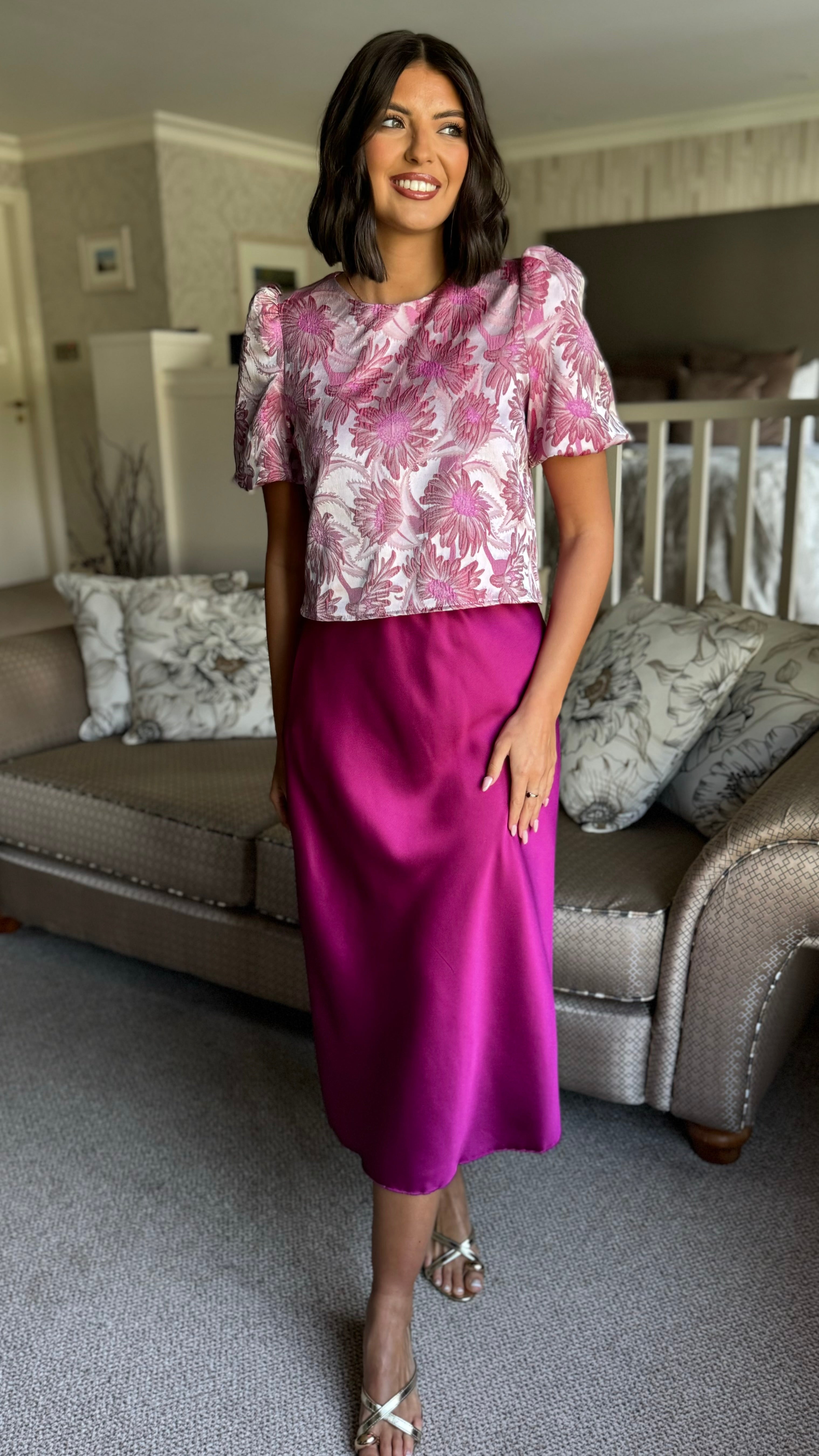 Winter Rose Pink Floral Brocade Puff Sleeve Top