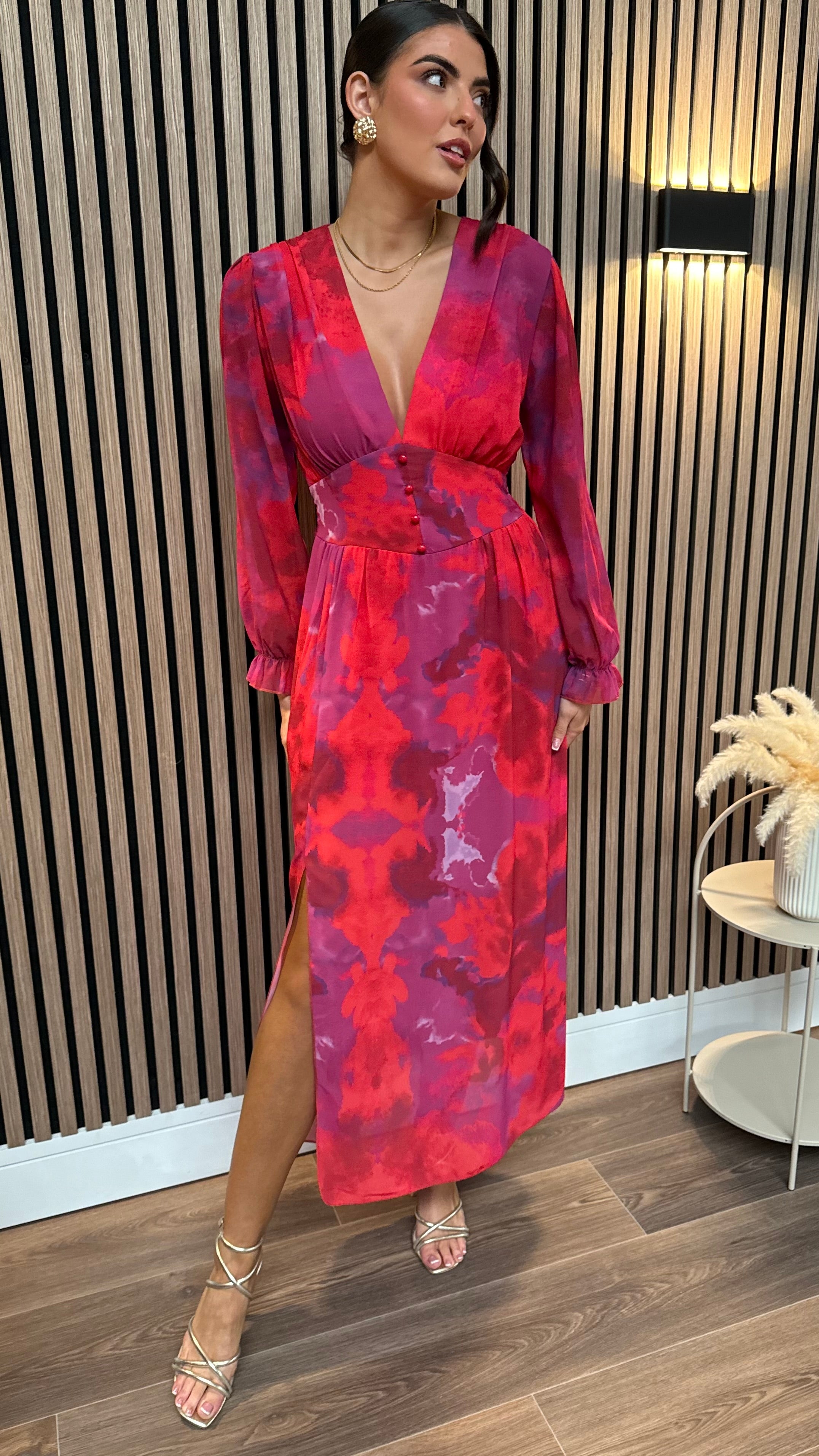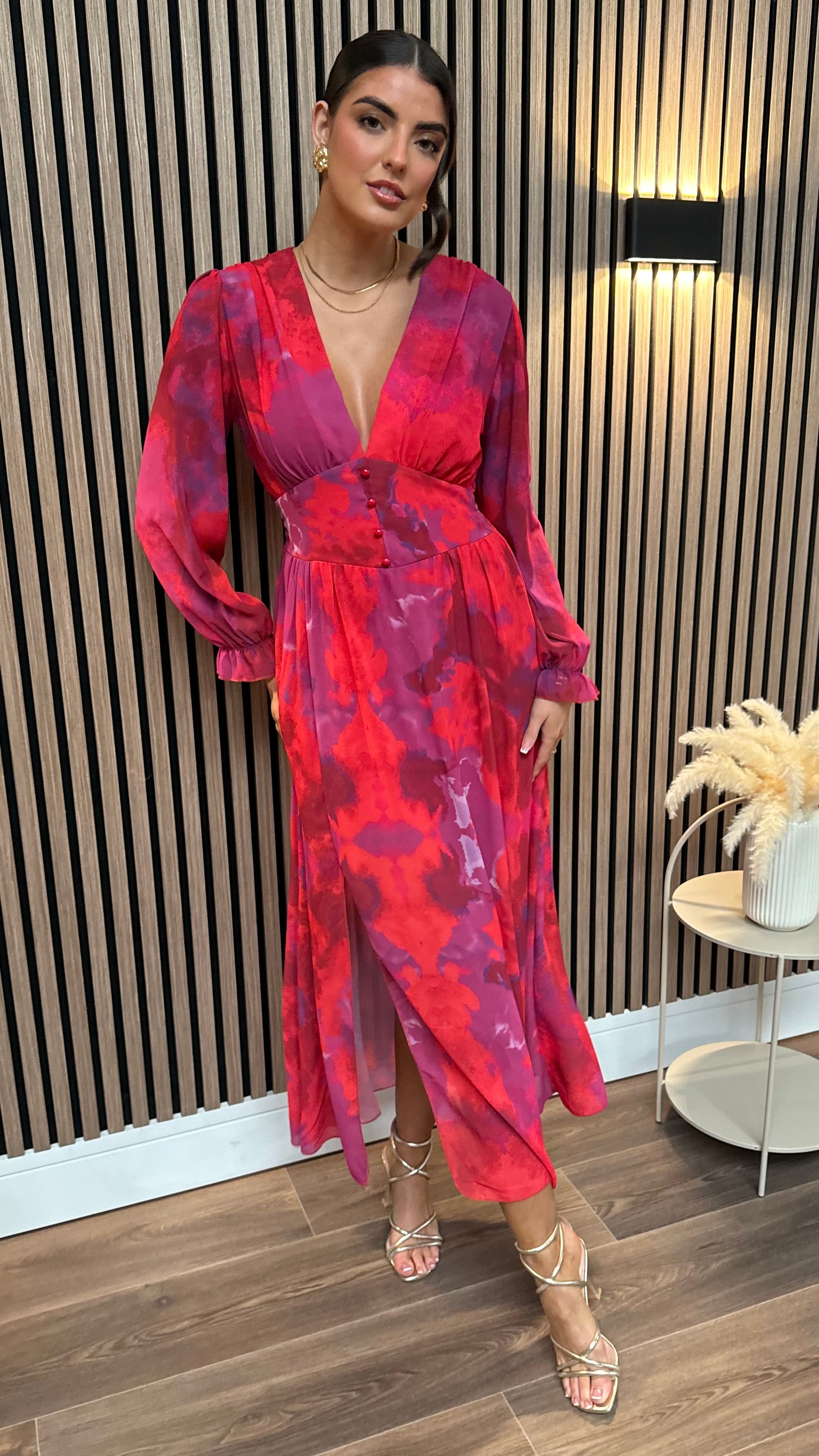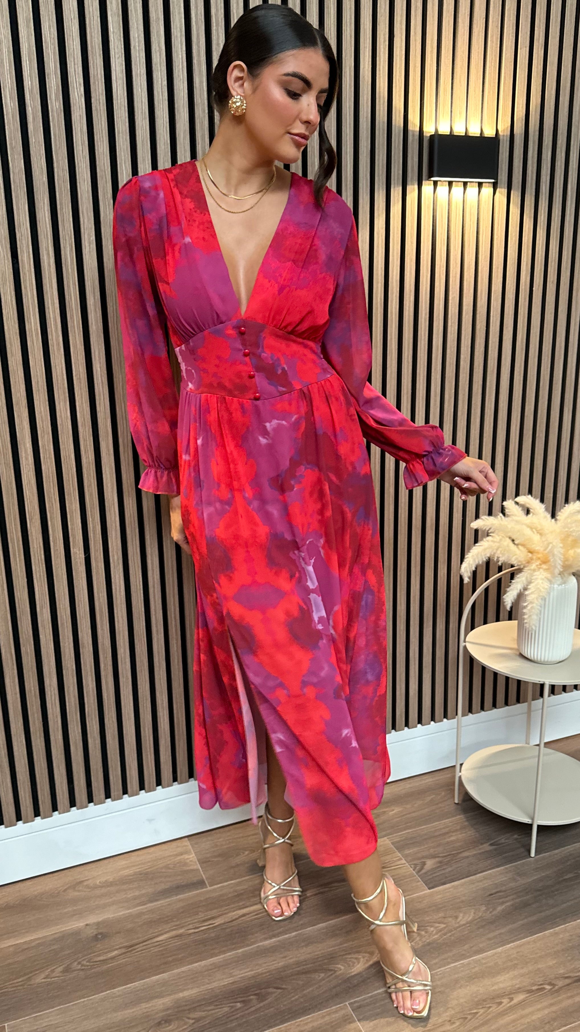 Get ready to turn heads with our Carmen Purple & Red Floral Printed Midi Dress! This dress features a playful v neckline and a flowy midi length, perfect for any occasion. With its trendy long sleeves, you'll feel chic and stylish all day long.🌸👗