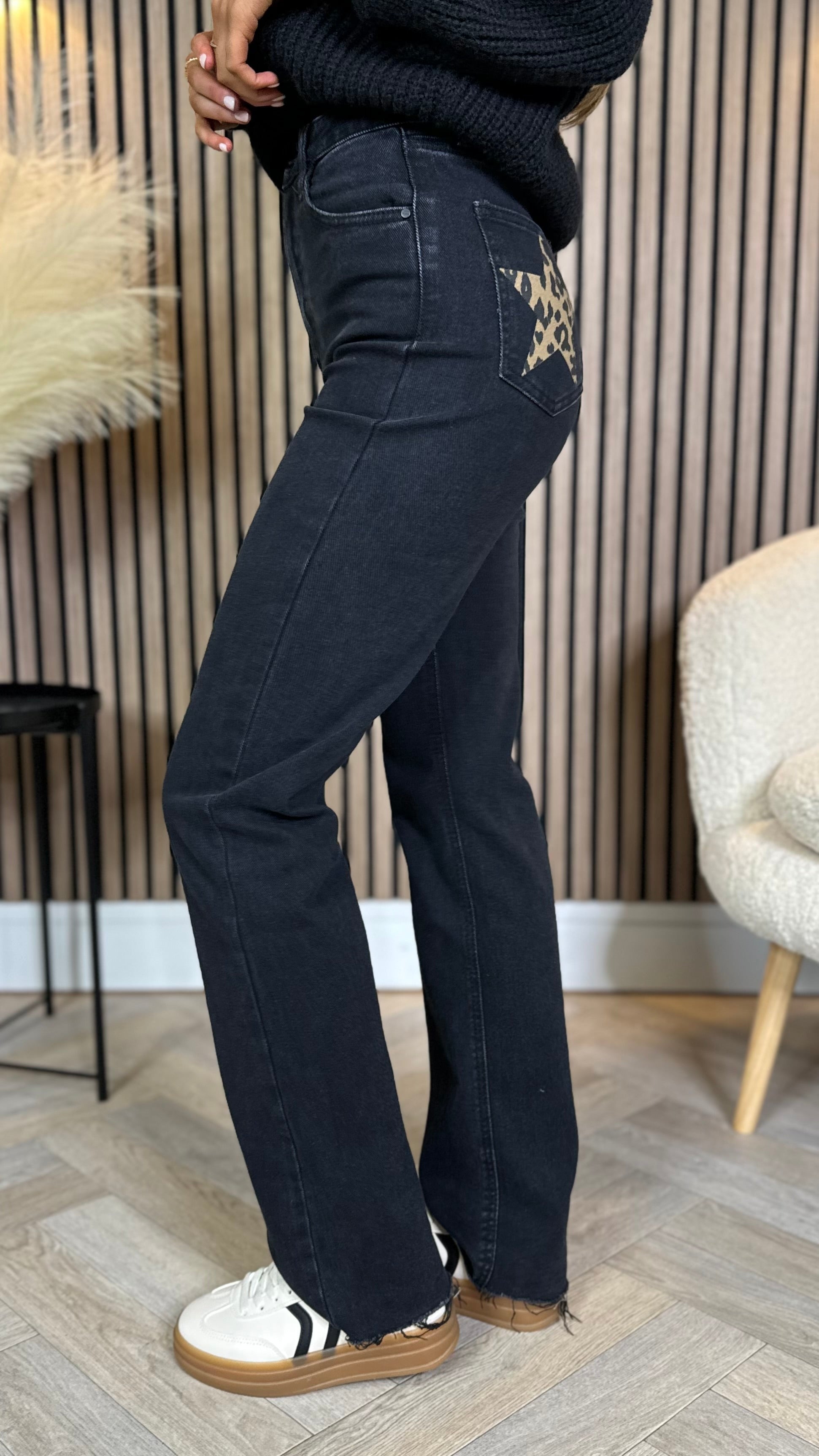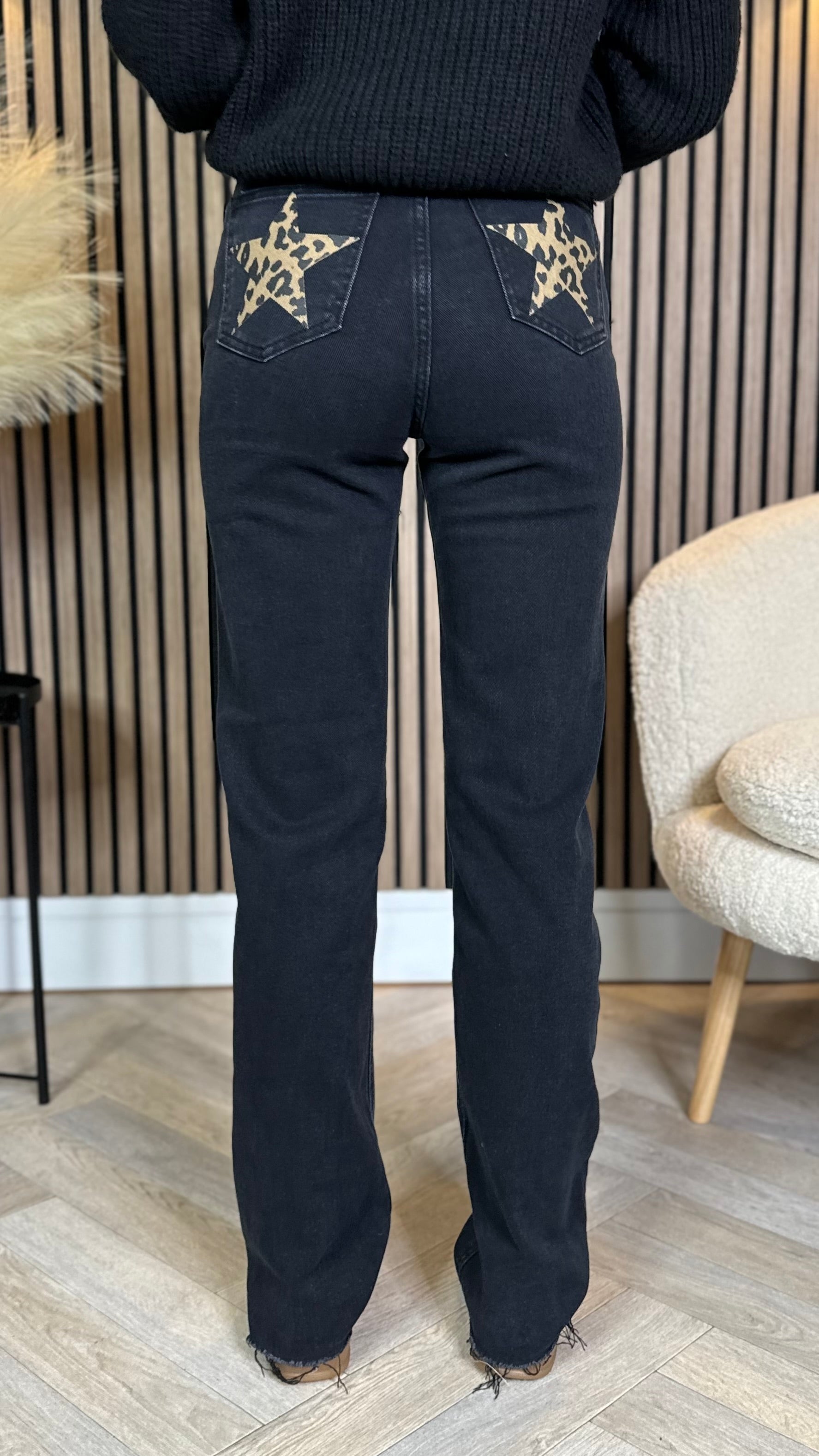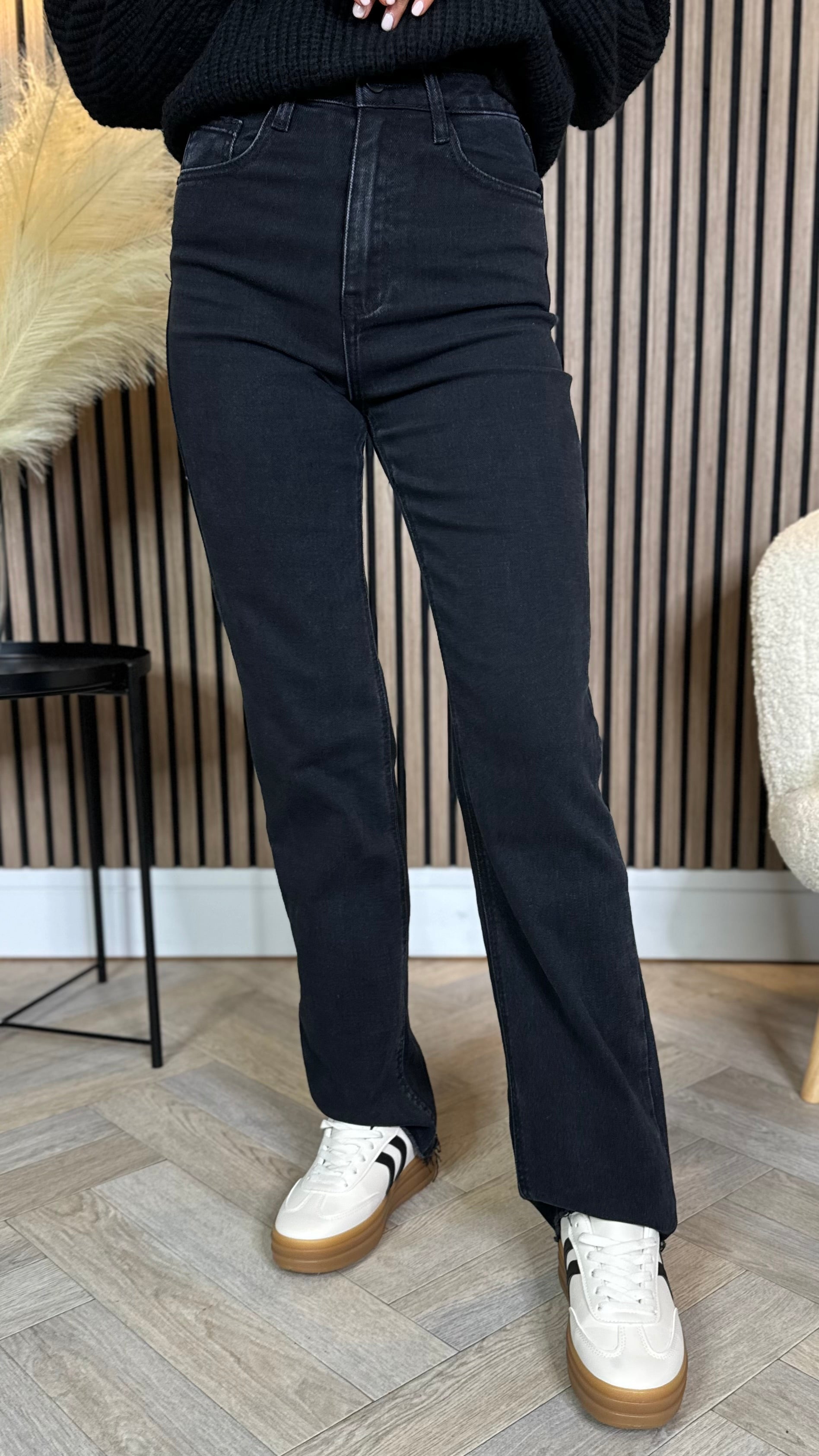 Quest Black Straight Leg Frayed Hem Pocket Detail Jeans