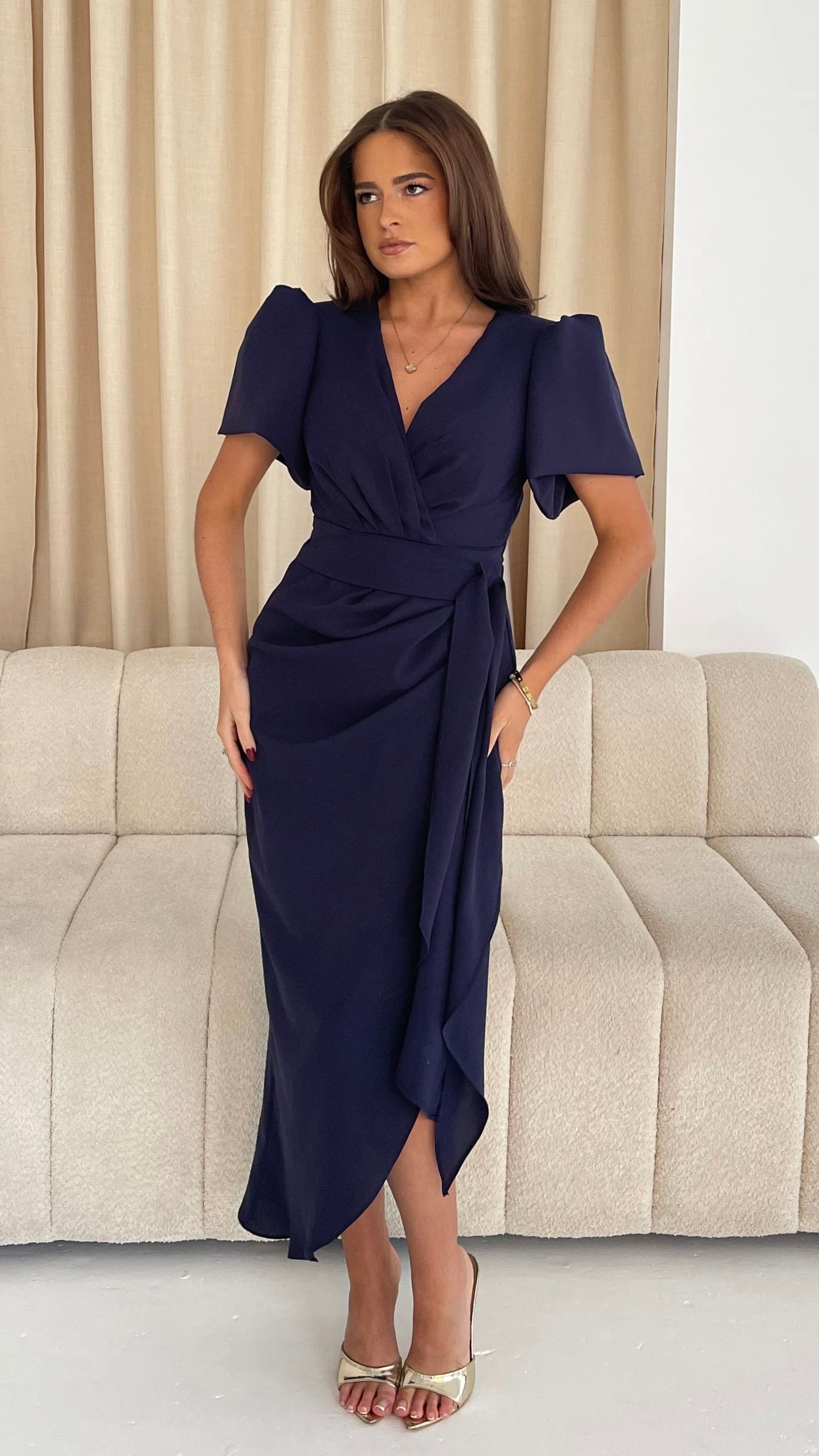 Saoirse Navy Puff Sleeve Wrap Front Midi Dress