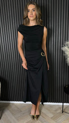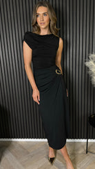 Unleash your inner fashionista with the Brodi Black Buckle Detail Wrap Effect Midi Skirt. The ruched design creates a flattering silhouette while the buckle detail adds a touch of edgy charm. Perfect for any occasion, this dress will have you turning heads and feeling confident.