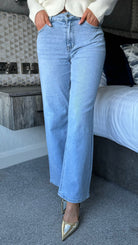Introducing Megan Light Blue Wide Leg Jeans, the perfect combination of style and comfort. These jeans feature a flattering straight leg cut for a sleek silhouette. Made with durable denim and a light blue wash, these jeans are sure to become your go-to for any occasion. Pair with your favorite top and shoes for an effortlessly chic look.
