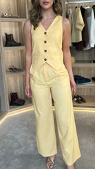 Introducing our Alice Golden Yellow Waistcoat and Wide Leg Trouser Co-Ord. Crafted from a linen mix material, this set features a button front waistcoat with elegant horn buttons and a pleat front on the wide leg trousers. Elevate your look with this sophisticated and exclusive ensemble.