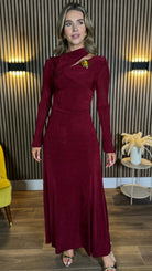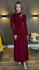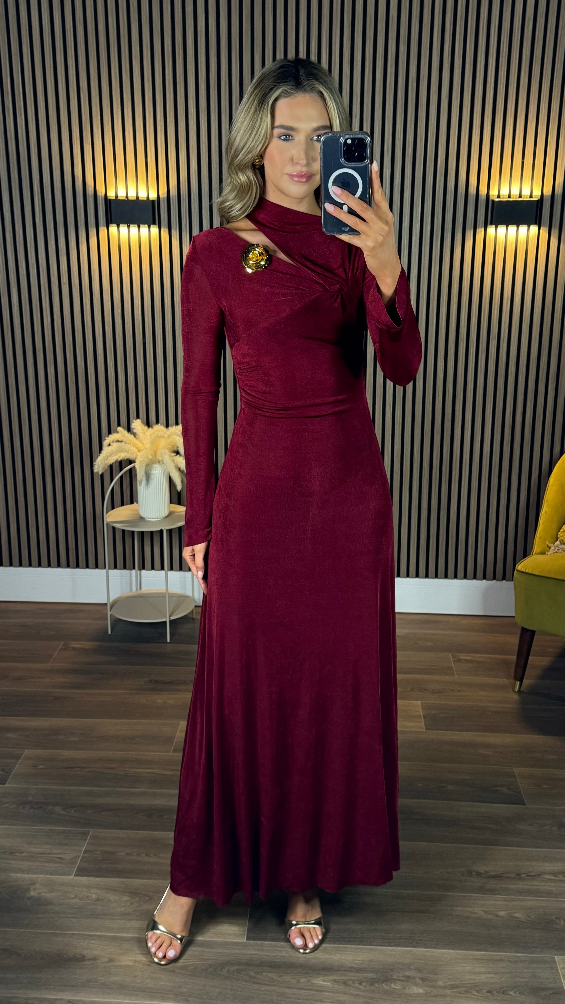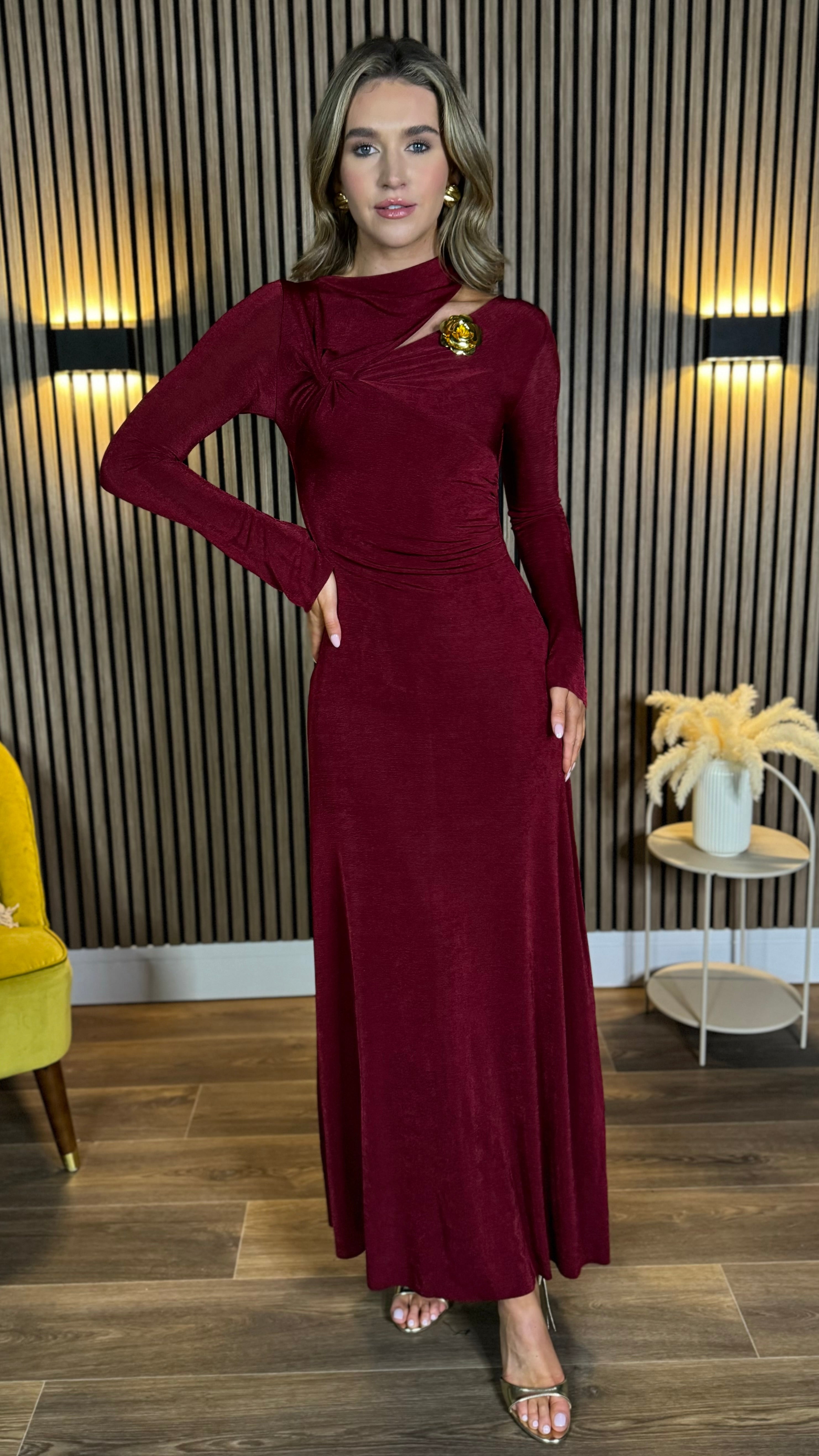 Ayda Burgundy Split Neckline Brooch Detail Maxi Dress