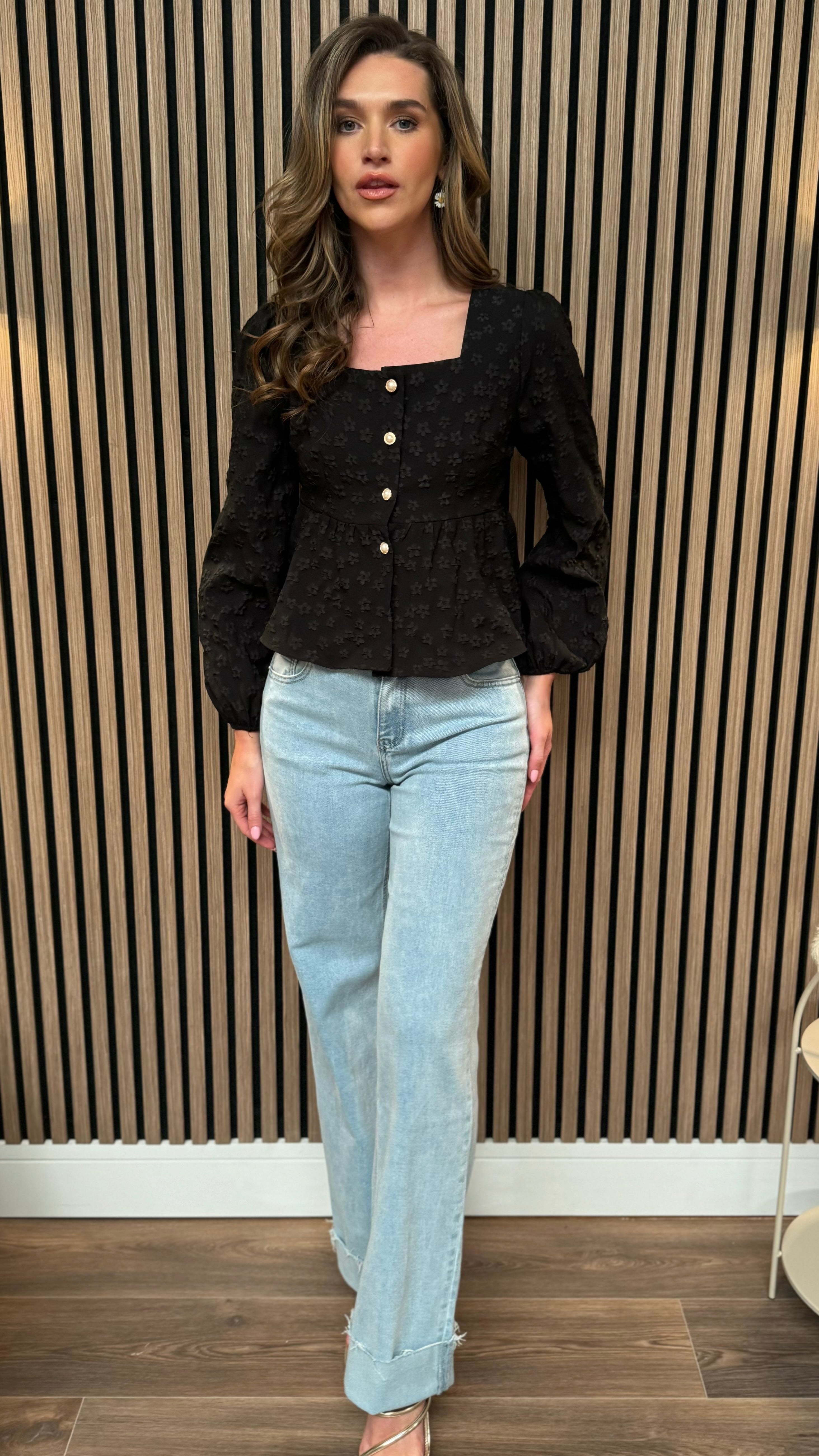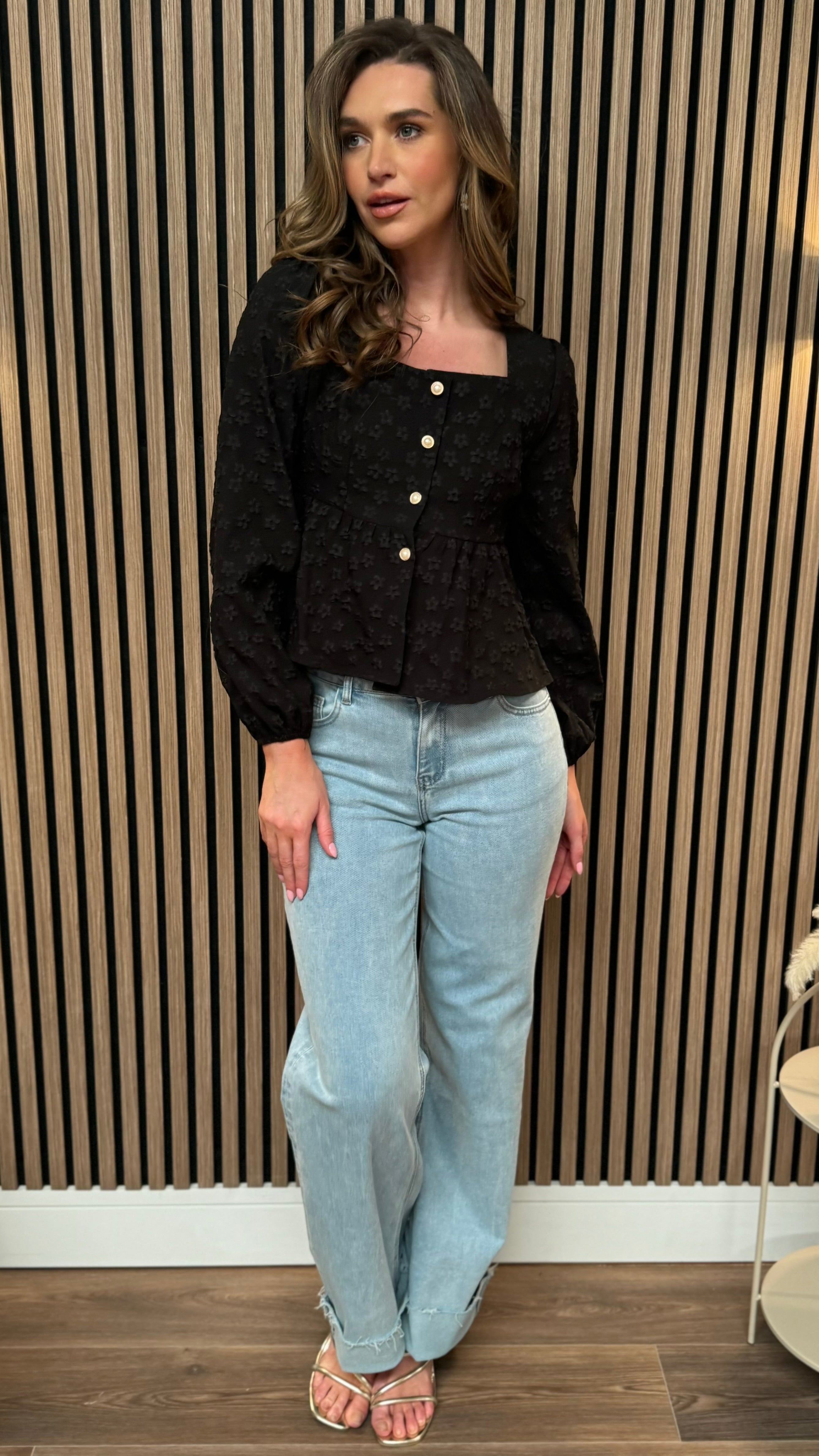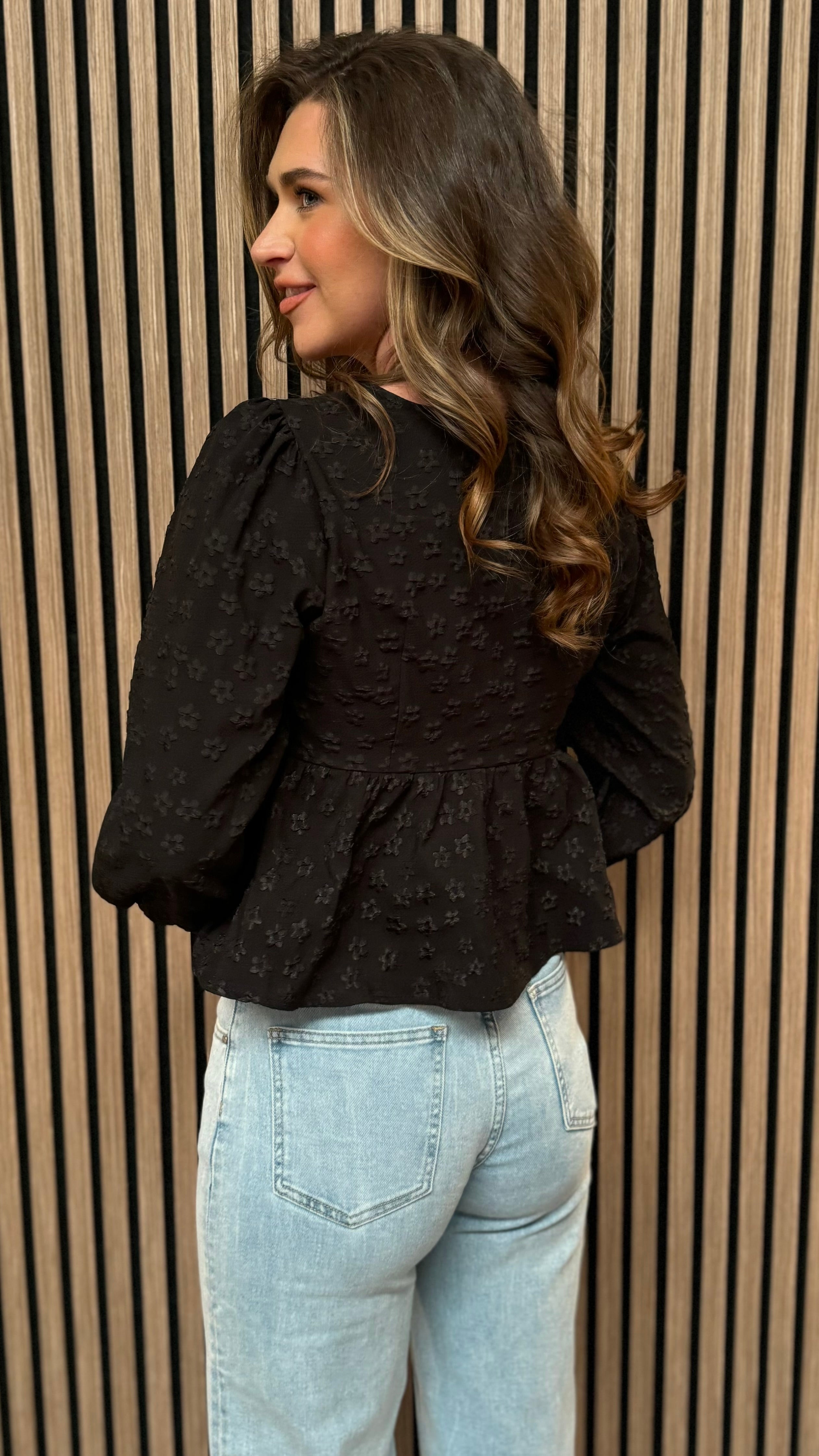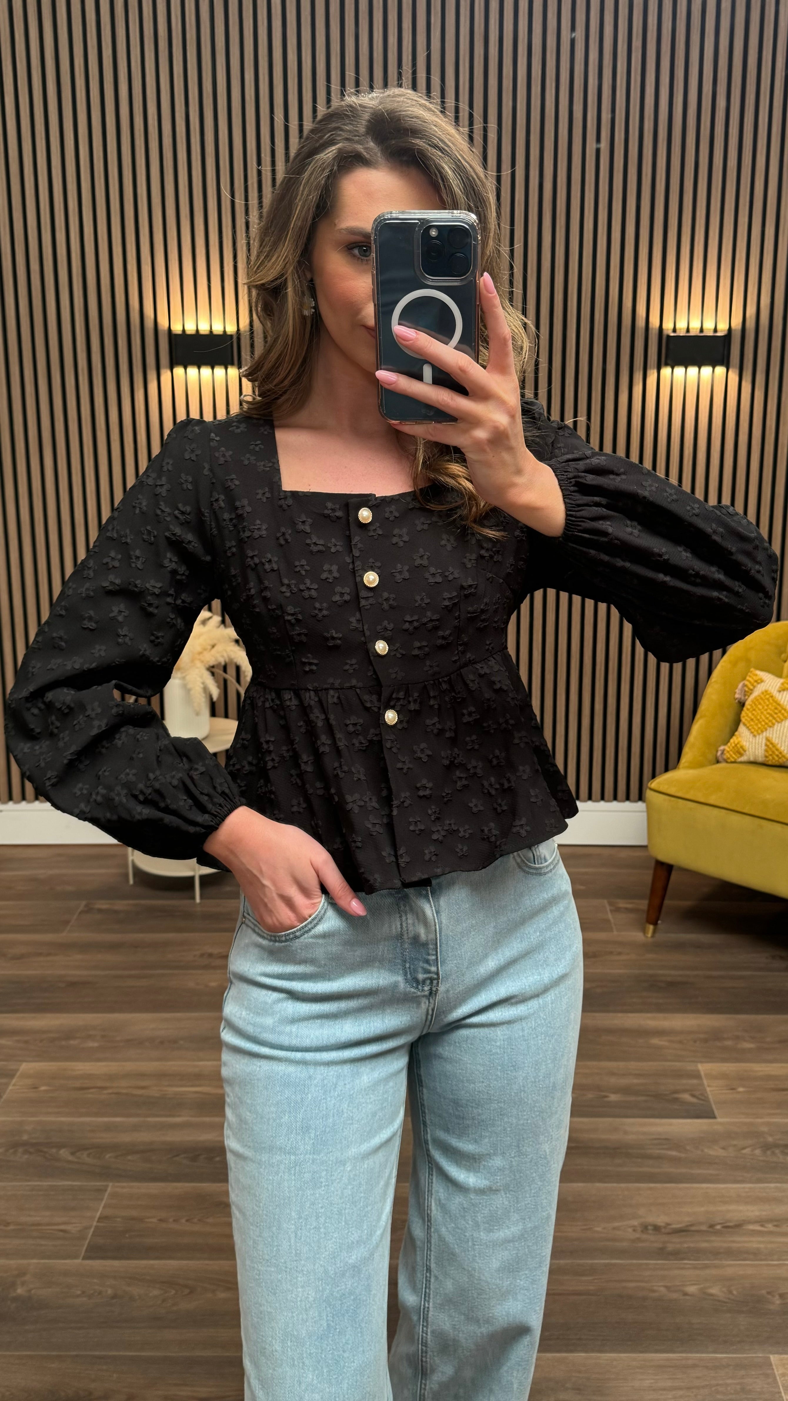 Get ready to bloom in style with our Farren Black Floral Printed Button Down Peplum Top! This unique top features a flattering square neckline and a playful peplum design. Perfect for adding a touch of fun to any outfit. 🌸🌼