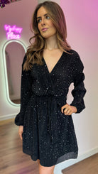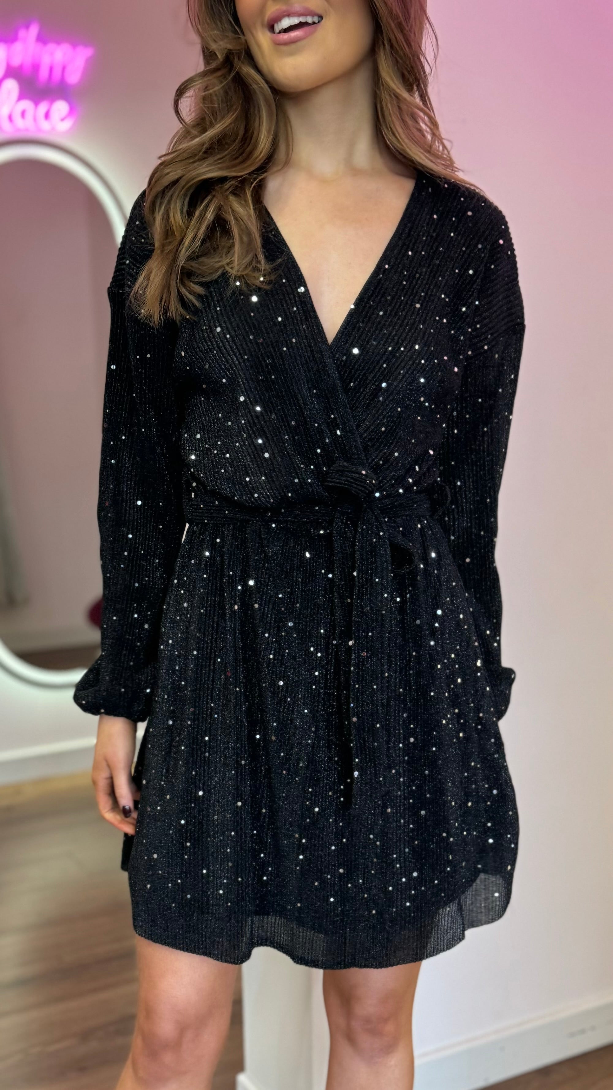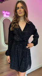 Turn heads in our Christina Black Sequin Detail Long Sleeve Mini Dress! 🌟 With its elasticated waist and belted design, this dress flatters every figure. The v neckline and long sleeves add a touch of sophistication to this statement piece. Stand out and sparkle in this must-have dress! ✨