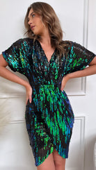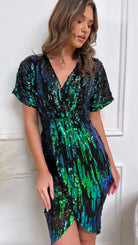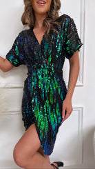 Slip into something a little more sparkly with this Kaisley Black Sequin Wrap Midi Dress! This shimmering little number will turn heads with its all-over black sequin and hints of green and navy peeking out. Perfect for a night out, this midi dress will have you looking 🔥🔥🔥!