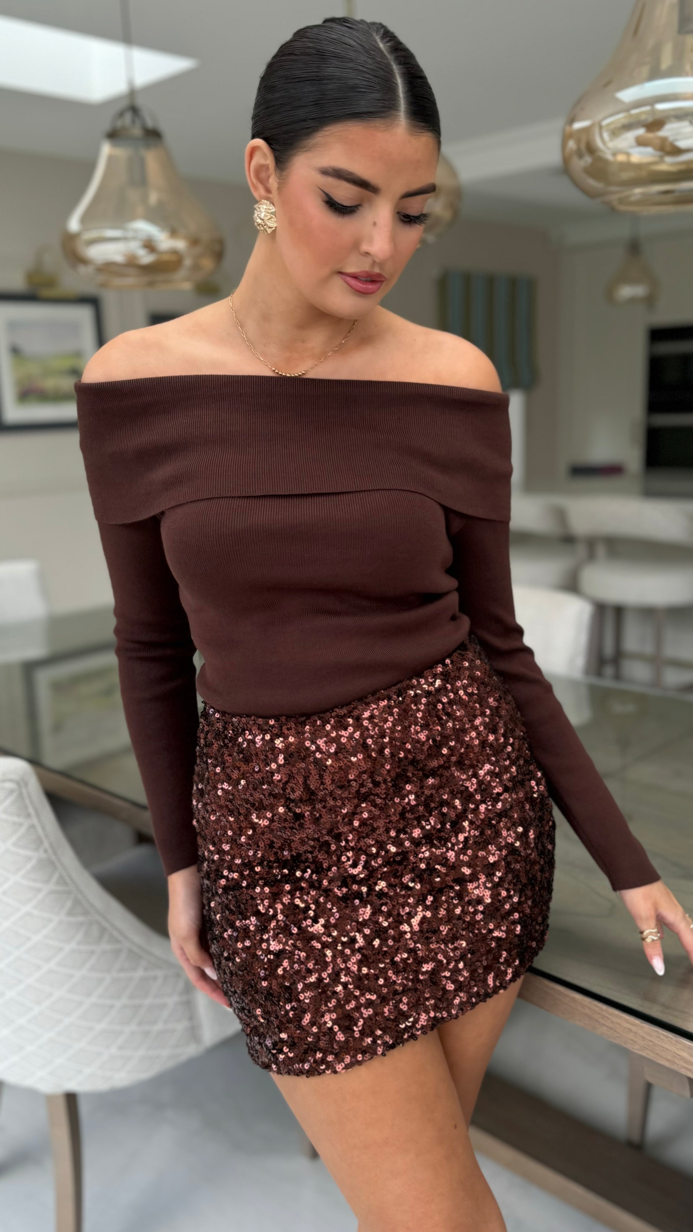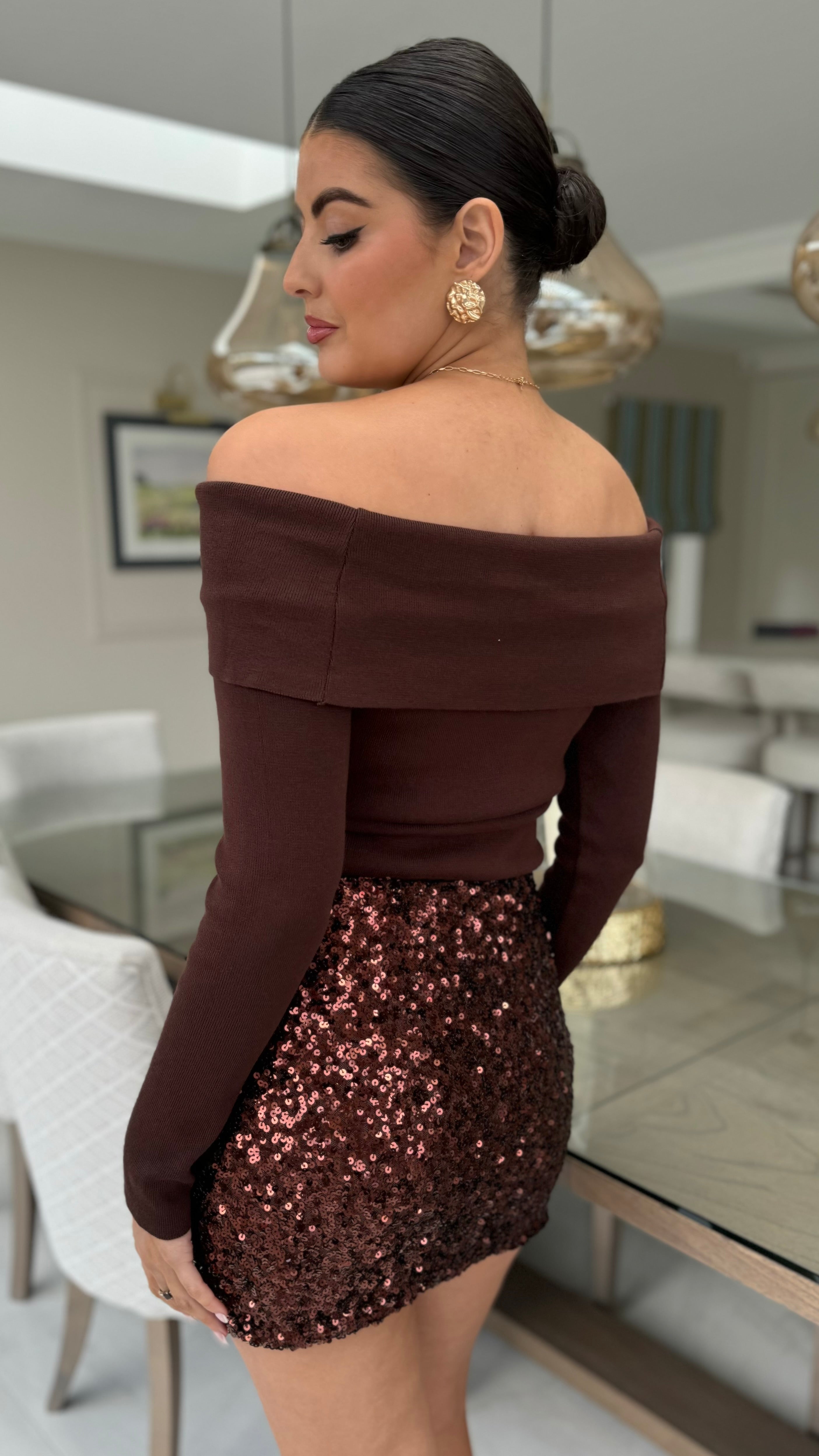 Shine bright in this show-stopping brown sequin mini skirt! Featuring an ultra-flattering high-waisted cut and playful all-over sequin detailing, this piece is pure sparkle from every angle. The sleek concealed zip fastening keeps the focus on the dazzling sequins while ensuring a smooth silhouette. Perfect for nights out, parties, or whenever you want to turn heads and steal the spotlight. Dress it up with heels and a crop top for maximum impact!
