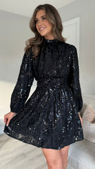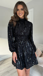 Merla Black Sequin High Neck Belted Mini Dress