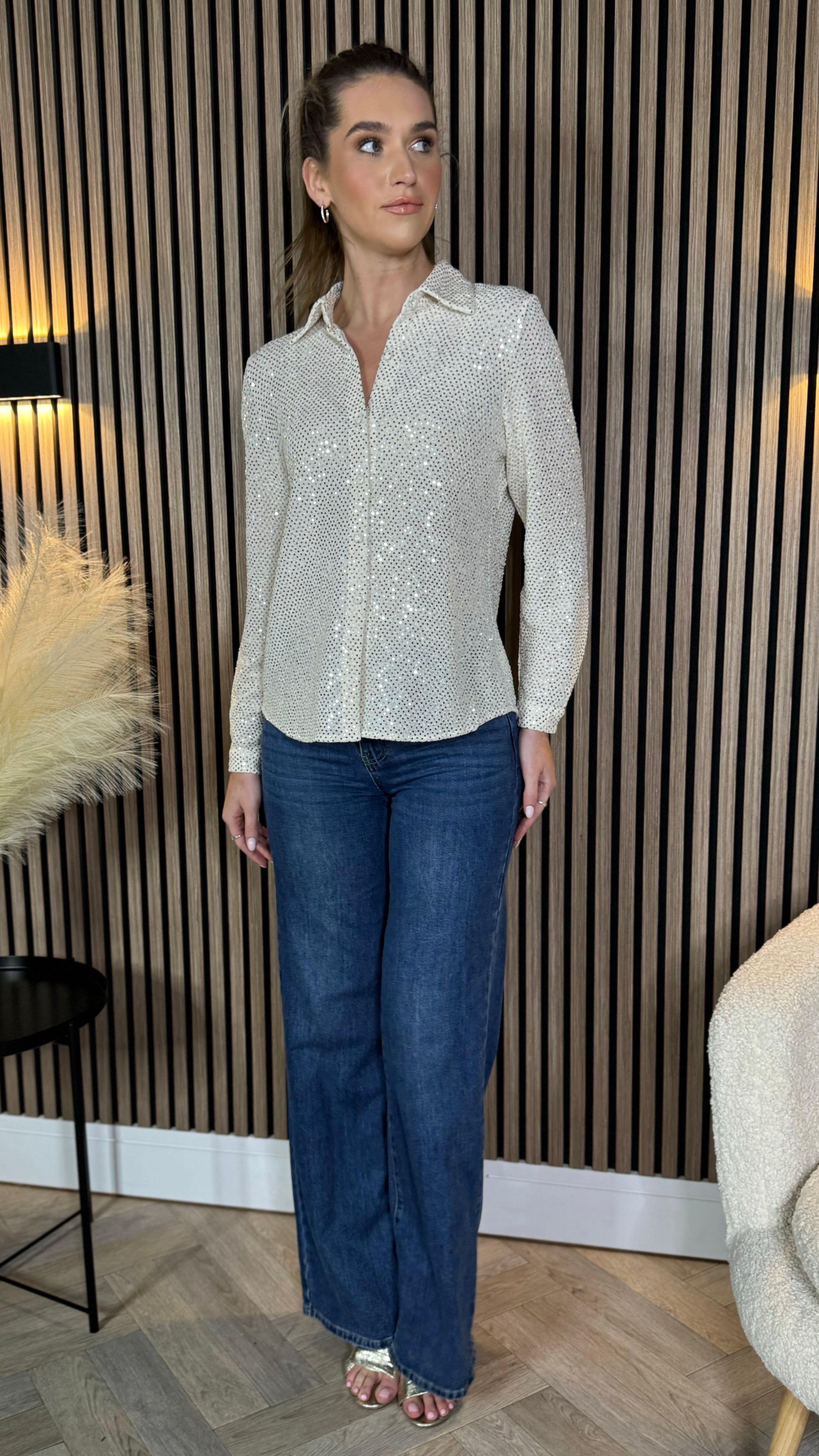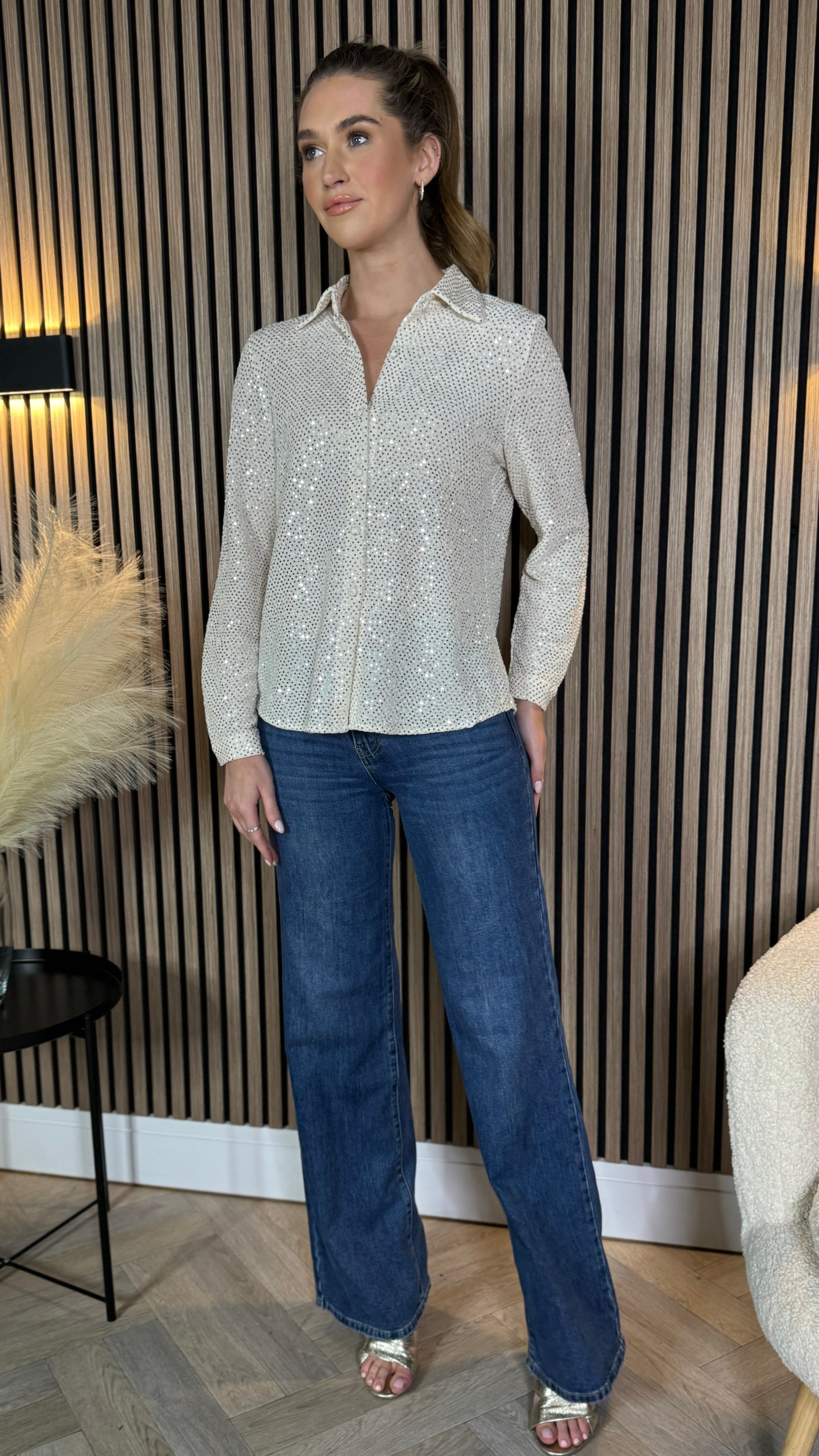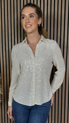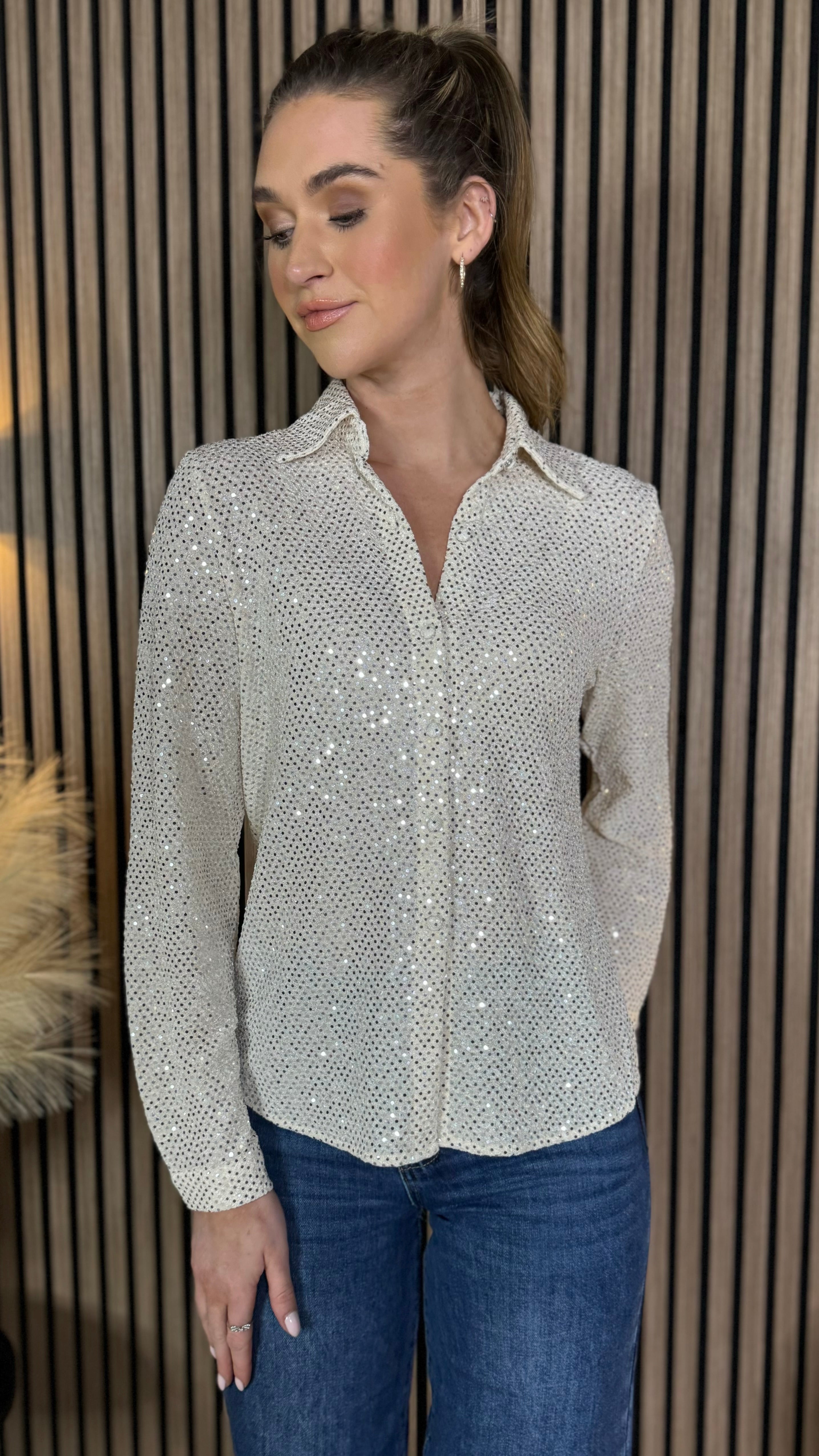 This Milani Beige Sequin Detail Shirt adds a touch of glam to your wardrobe with delicate sequin accents and covered buttons. Be effortlessly stylish and stand out in any setting with this must-have shirt! ✨