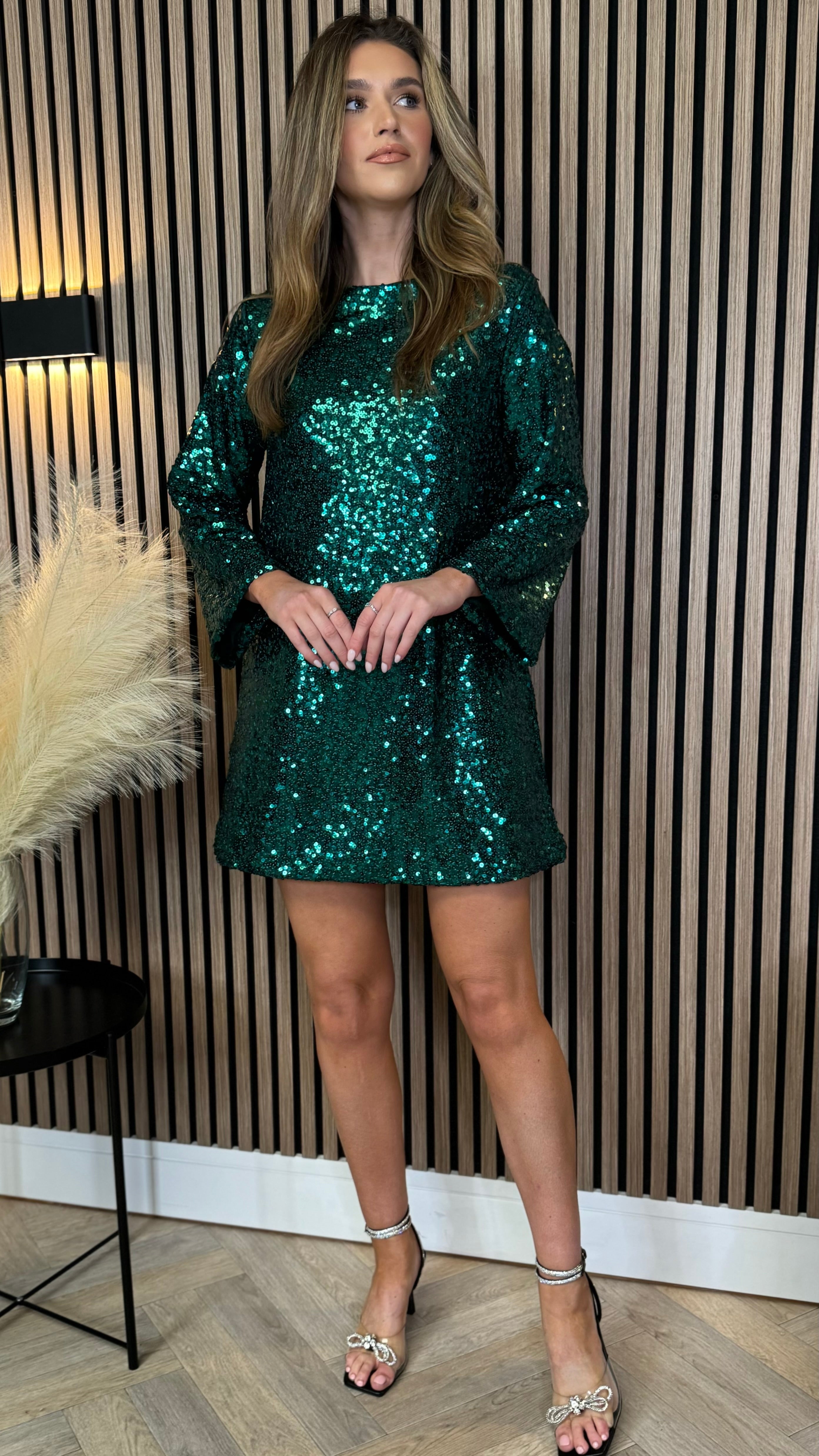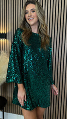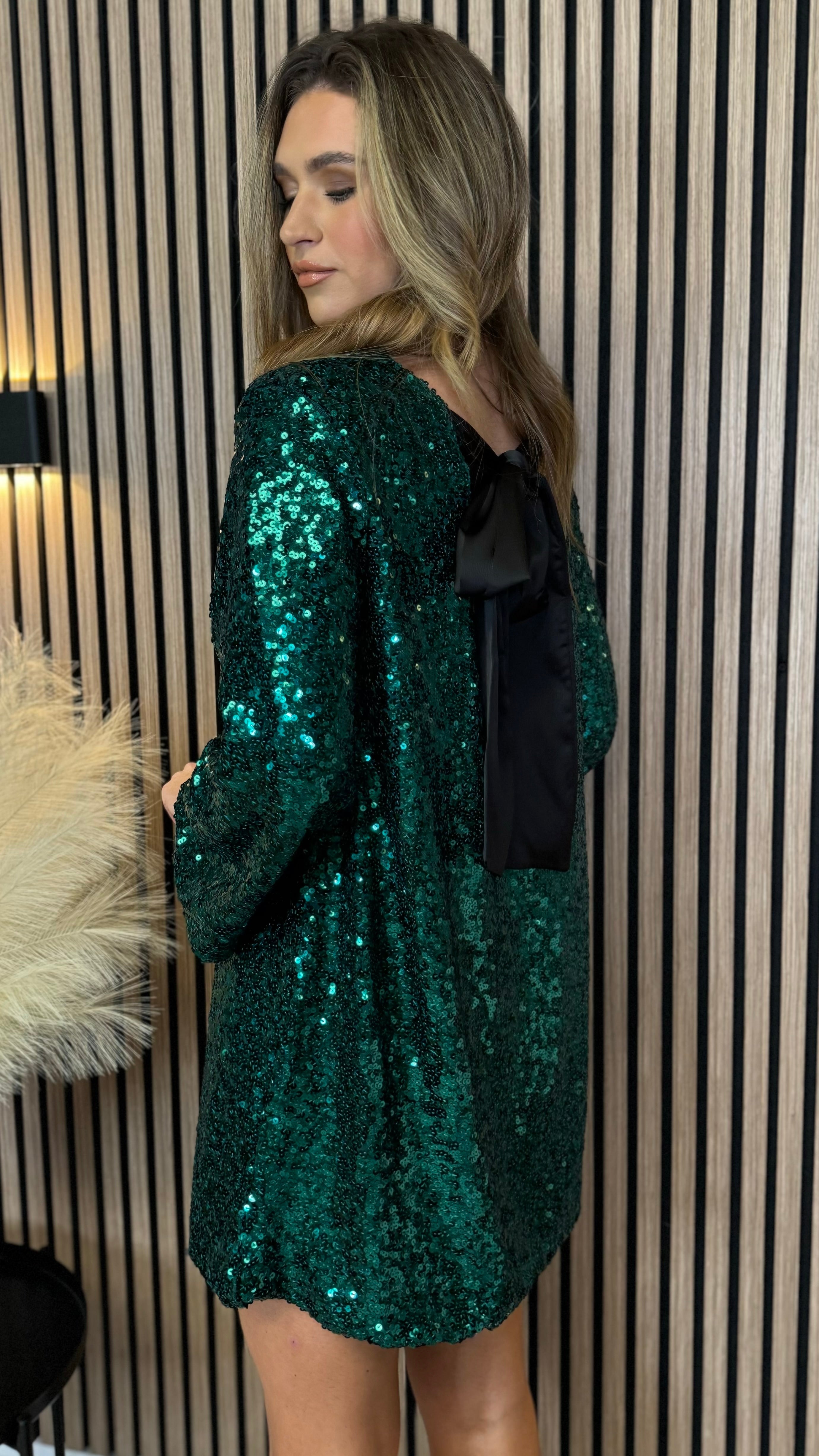 Get ready to shine with the Nikita Green Sequin Mini Dress! With its dazzling sequins and adorable black bow detail, this dress is the perfect balance of fun and elegance. Don't be afraid to stand out and make a statement with this unique and playful dress. 💫🎀