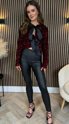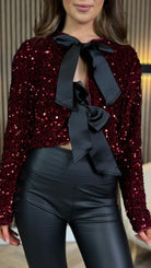 Sparkle and shine with the Tahlia Burgundy Sequin Top! This playful top features an open sequin design and a unique bow detail closure. Its slight crop length adds a fun twist to any outfit. Get ready to turn heads and make a statement with this quirky and stylish top! ✨🎀