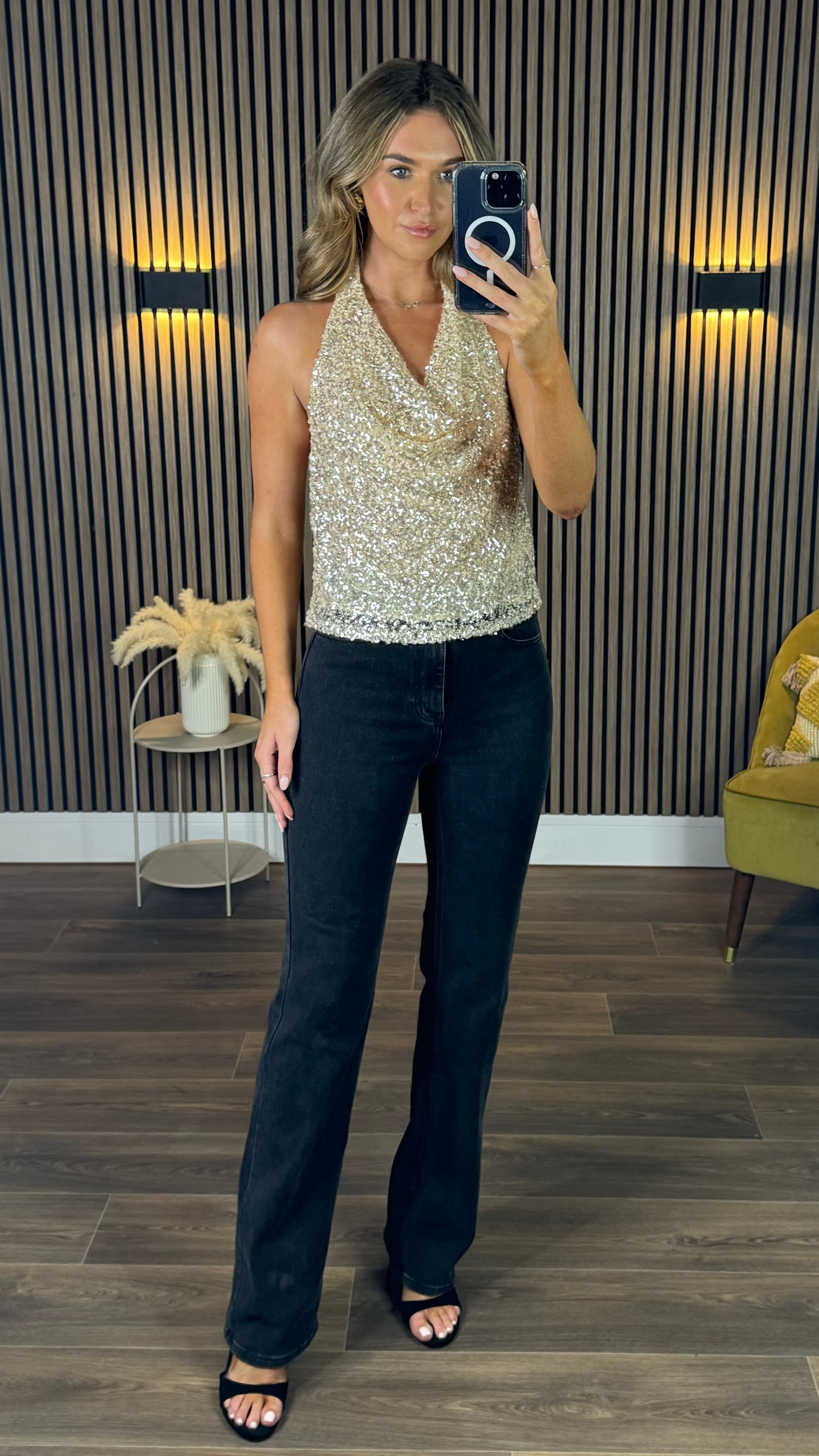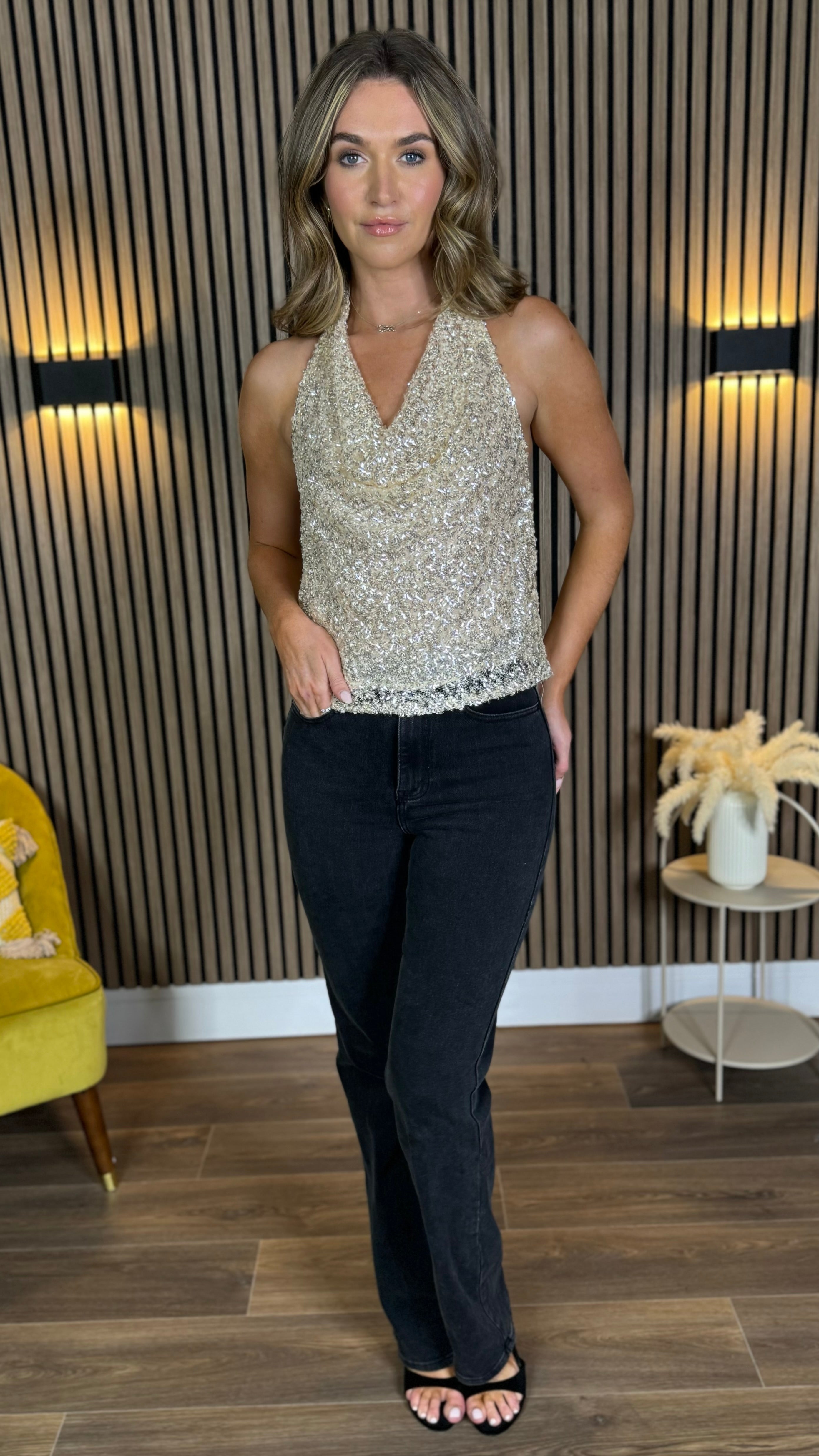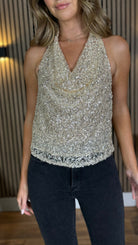 Shine bright in the Tyler Beige Sequin Halter Neck Top! ✨ Featuring a chic cowl neck and sparkling beige sequins, this top brings effortless glamour to any look. Perfect for dancing the night away or turning heads at your next party. Get ready to sparkle and shine! 🌟💃