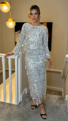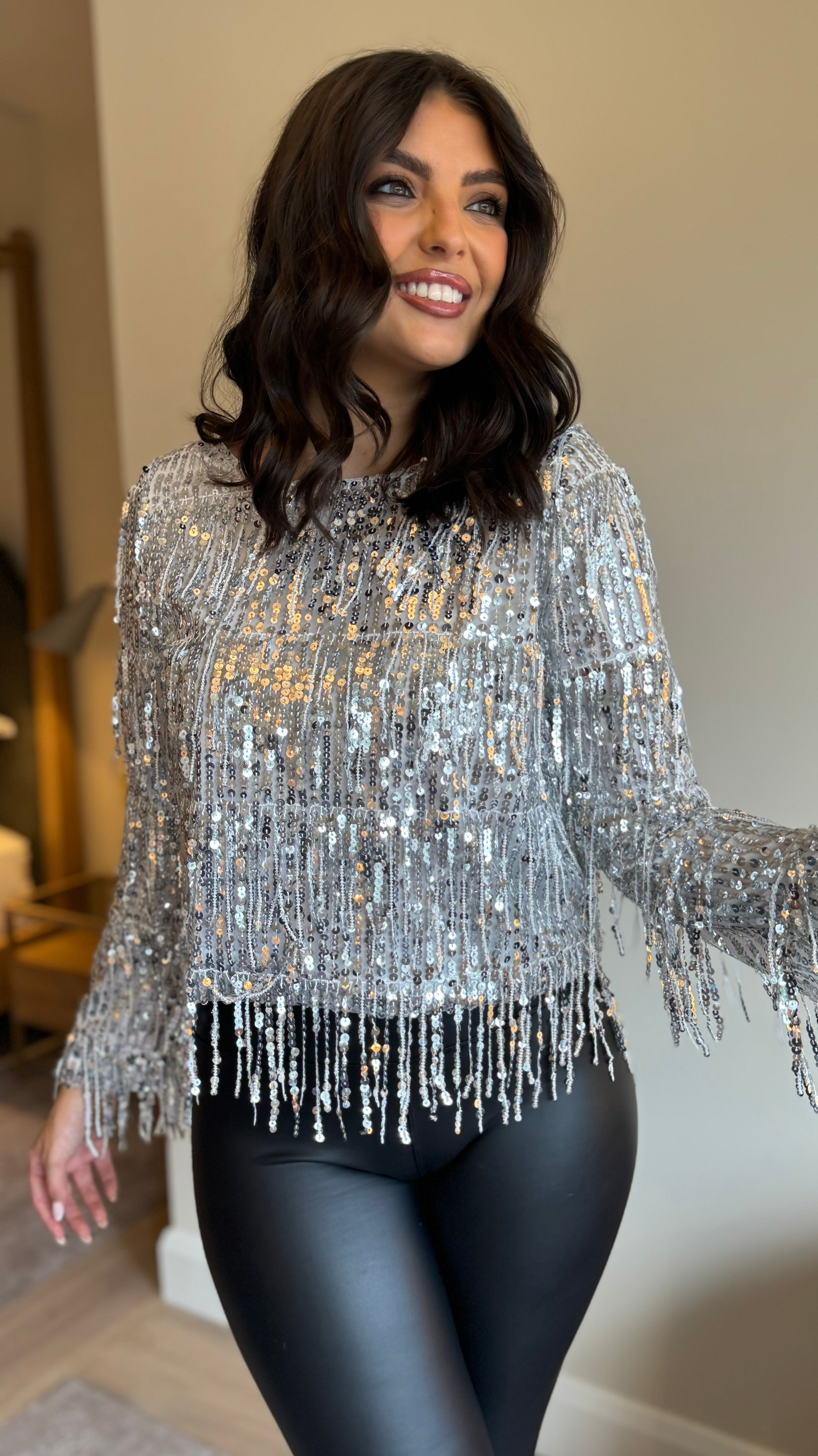 Sparkle through party season in this show-stopping silver sequin tassel top. Featuring a flattering round neckline and eye-catching diamanté sequin tassels that catch the light with every move, this piece is designed to turn heads. The soft lining keeps you comfortable all night long, whether you're dancing at celebrations or making an entrance at festive gatherings. Perfect for anyone ready to embrace the glitz and glamour of the season.