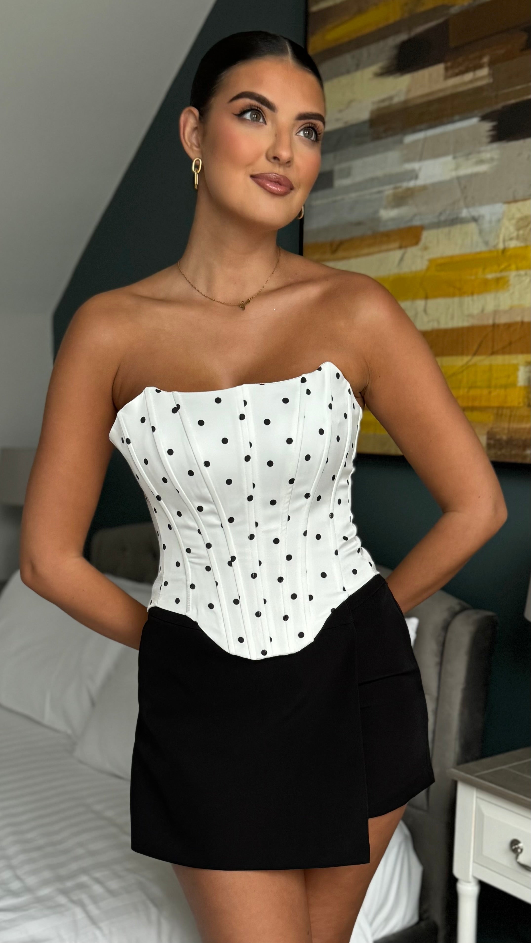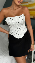 Kisha White Polka Dot Corset Style Top ✨ Sassy polka dots meet corset-inspired curves! 🖤 This playful top cinches in all the right places for a flirty, vintage-modern vibe. Dress it up or down—pure style magic! 💃