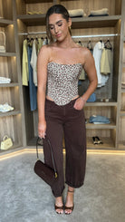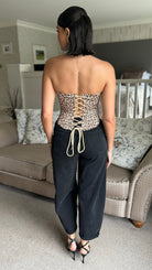 Structured corset top with a bandeau silhouette and striking leopard print. Features a lace-up fastening at the back for adjustable fit and a flattering, sculpted neckline. Perfect for layering under sheer pieces or wearing as a statement top. The fitted design offers support and definition, making it an versatile addition to any wardrobe.