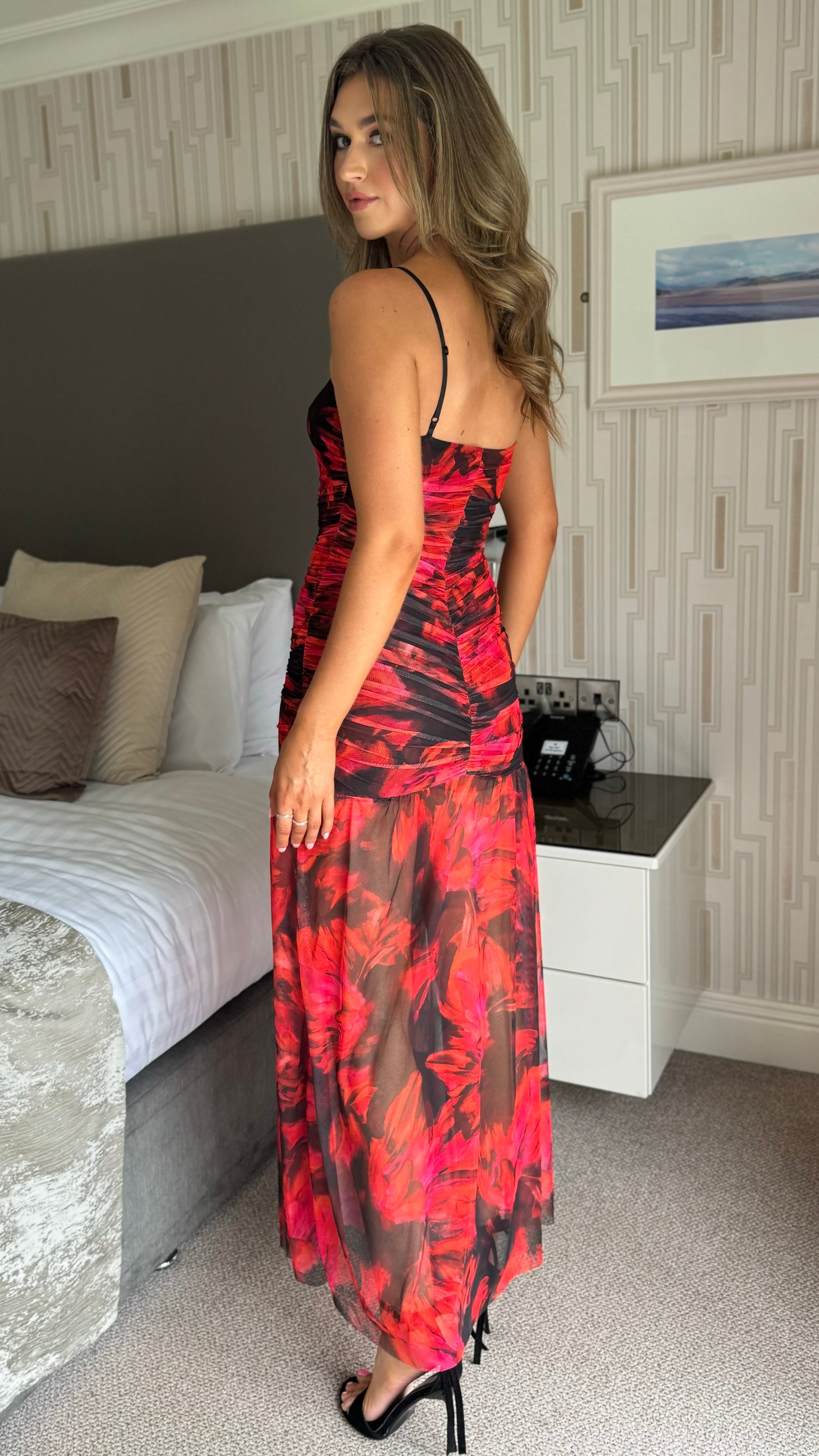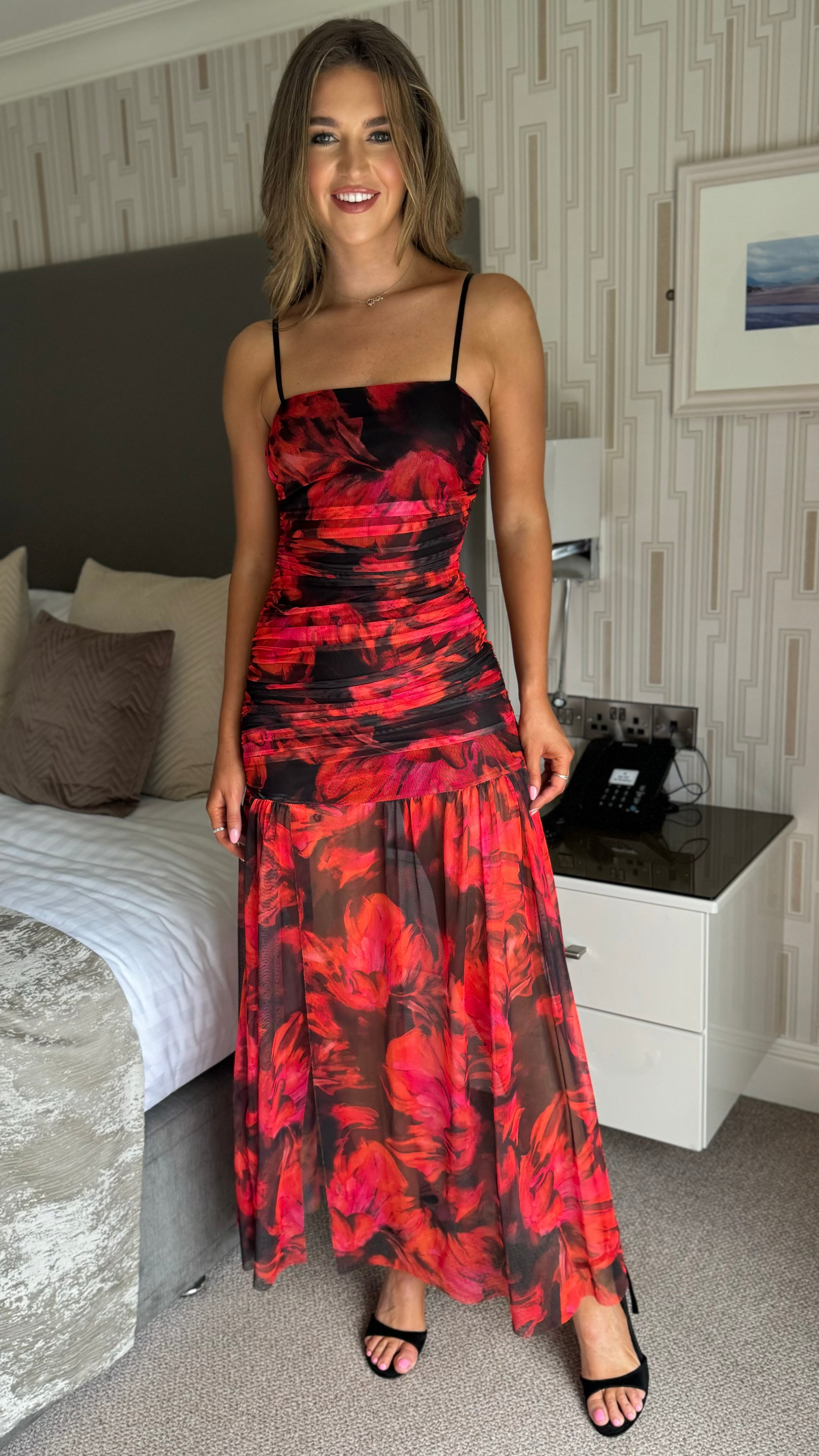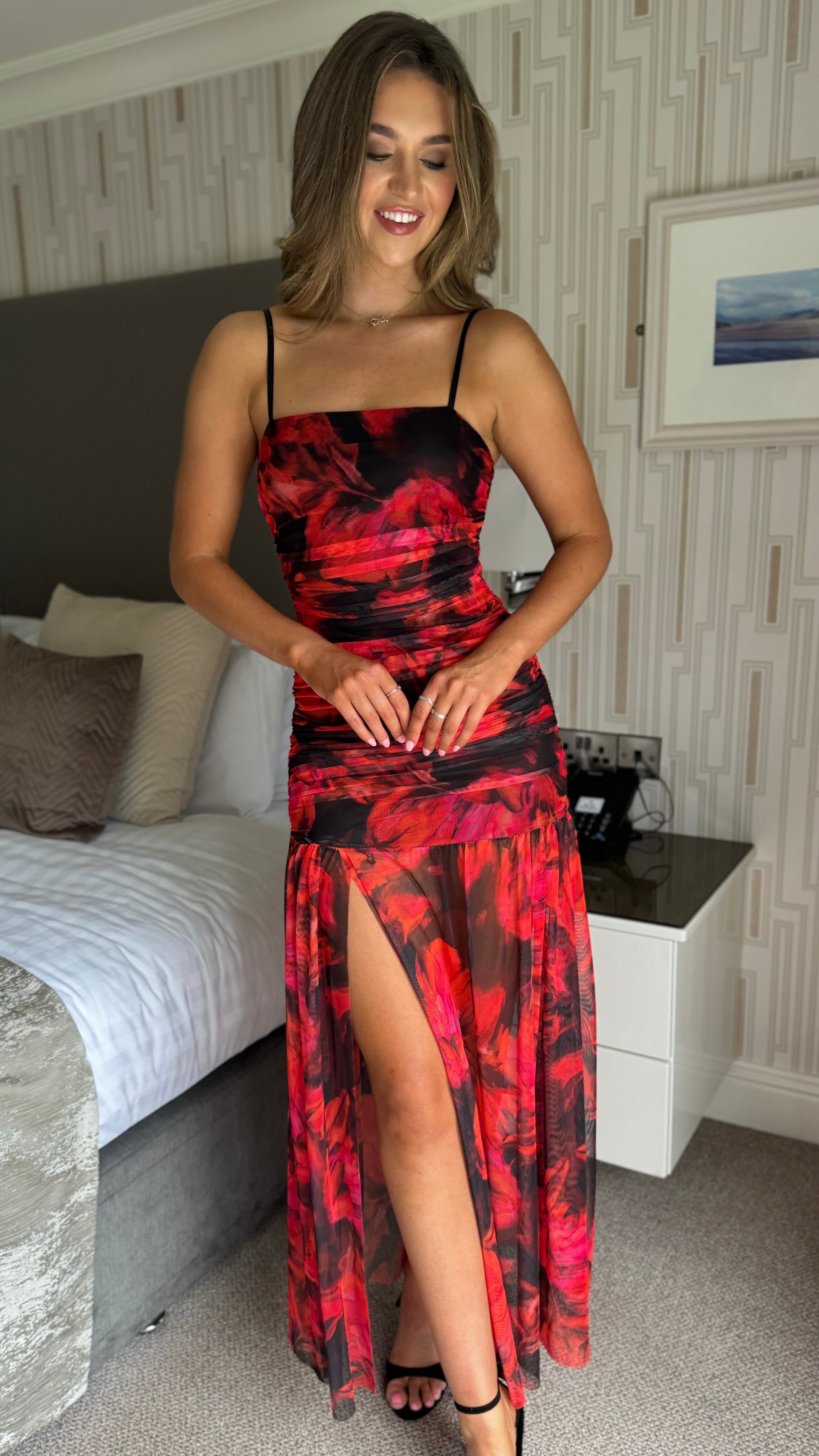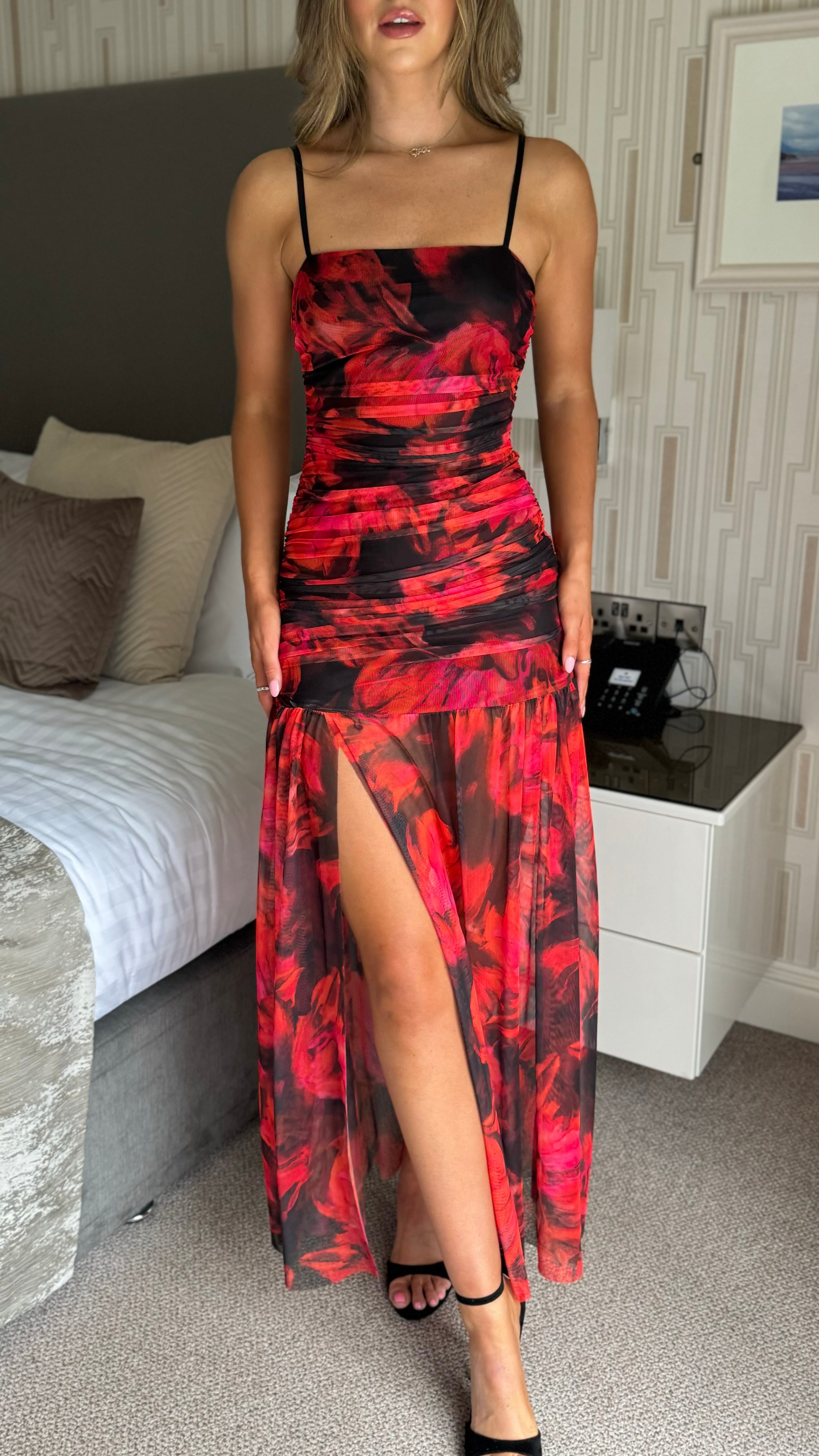 Cheryl Black & Red Printed Cami Strap Ruched Detail Cupped Midaxi Dress