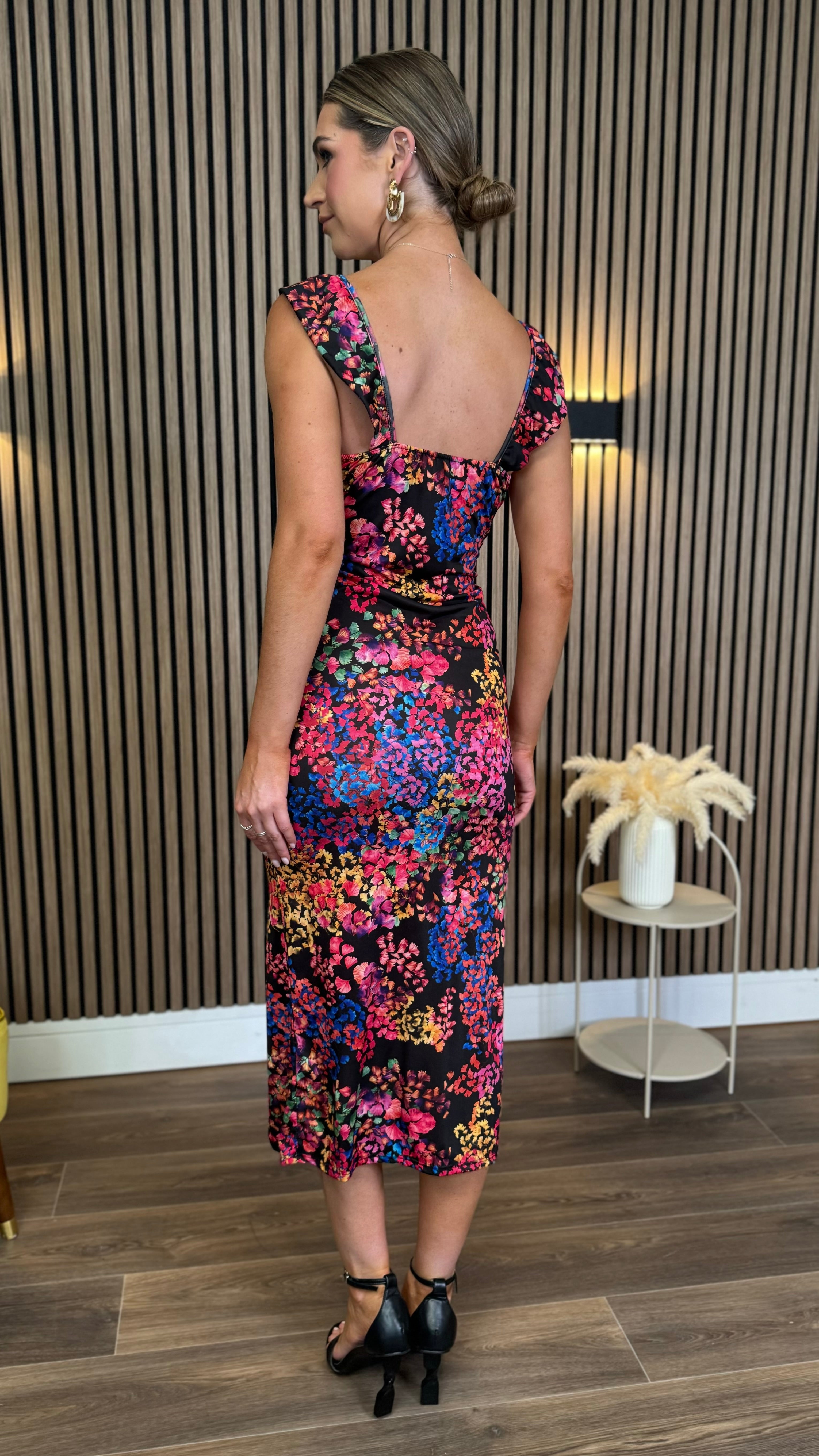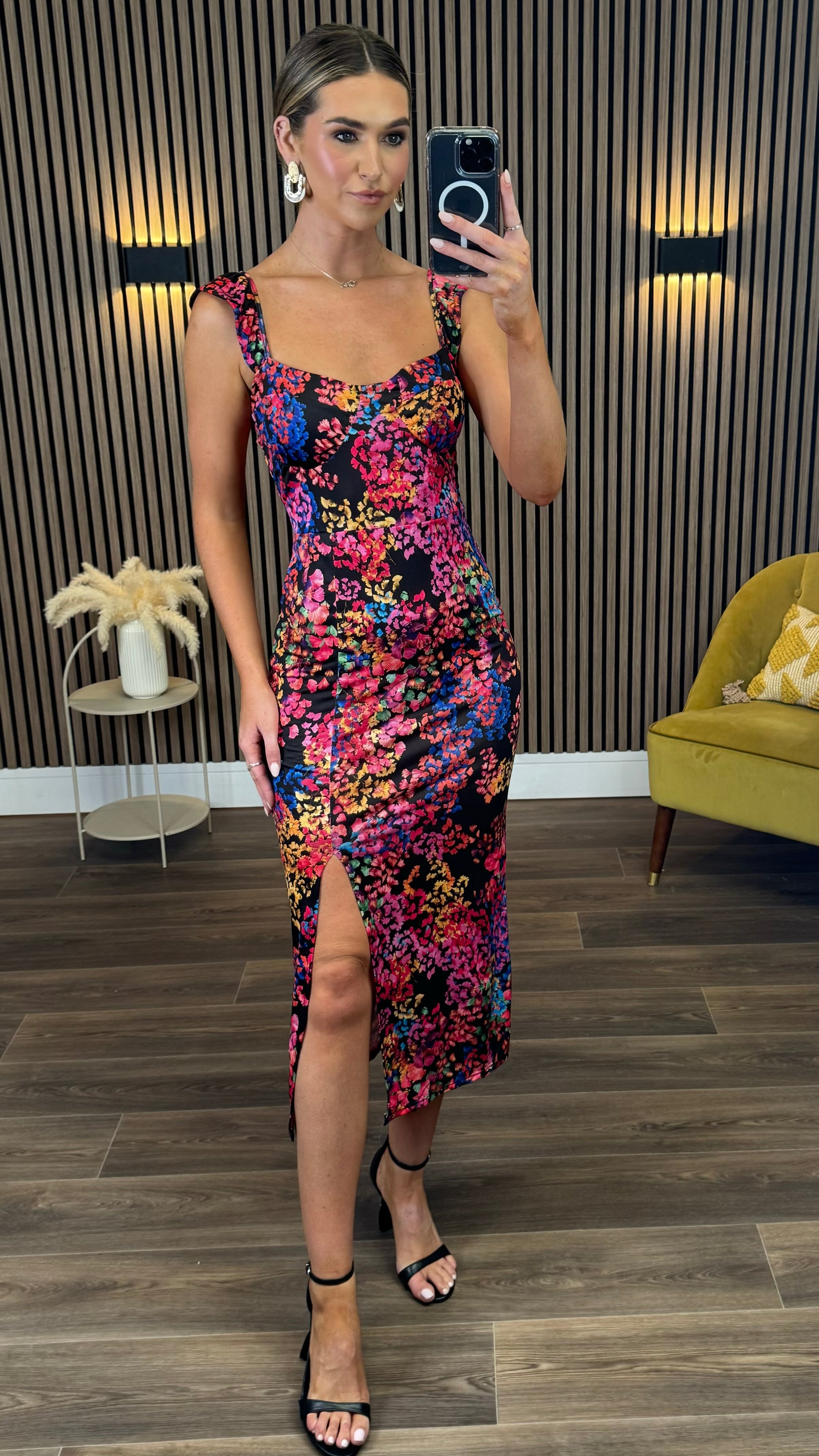 Elani Black & Multi Floral Print Slit Frill Cupped Detail Midi Dress