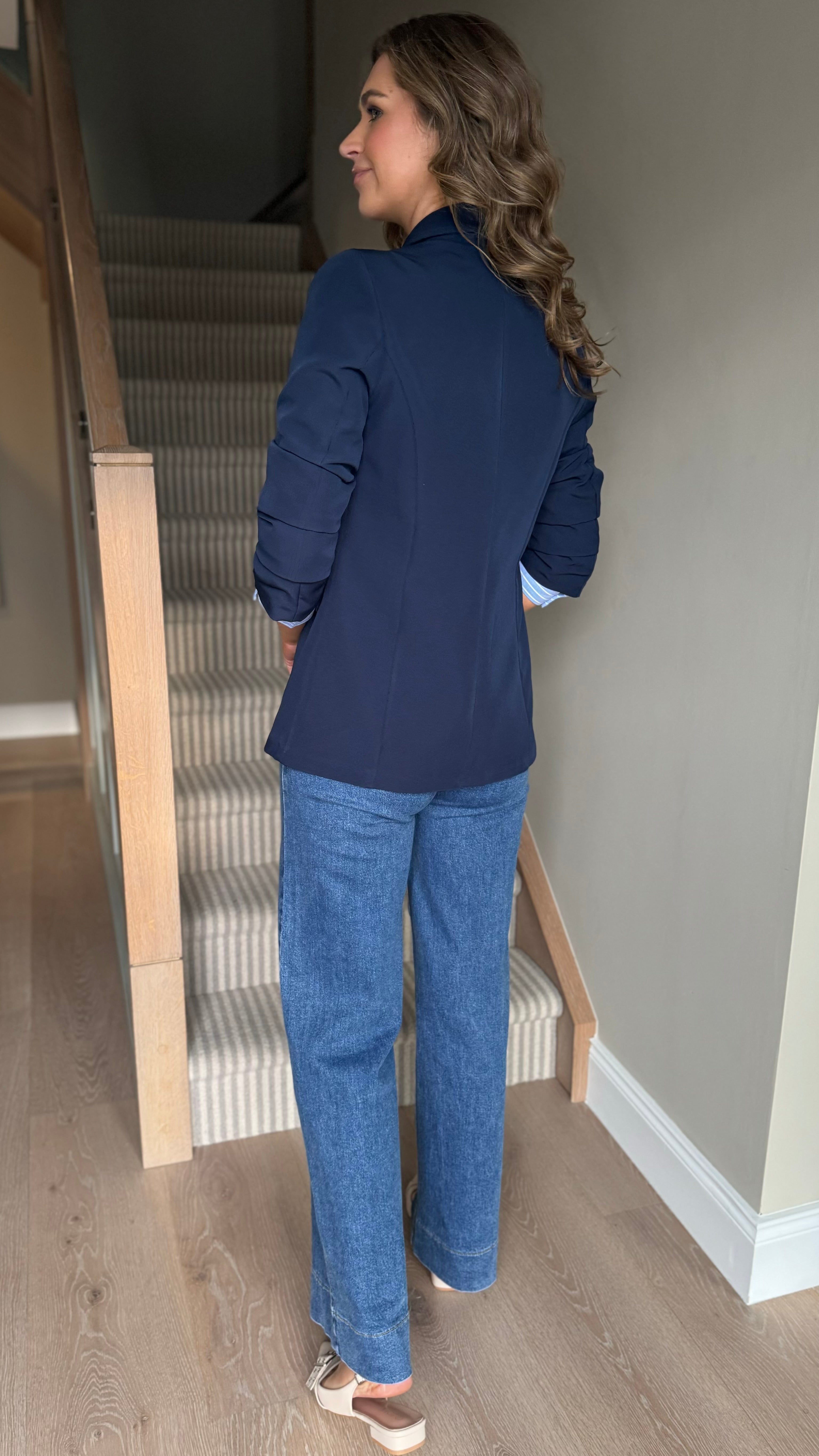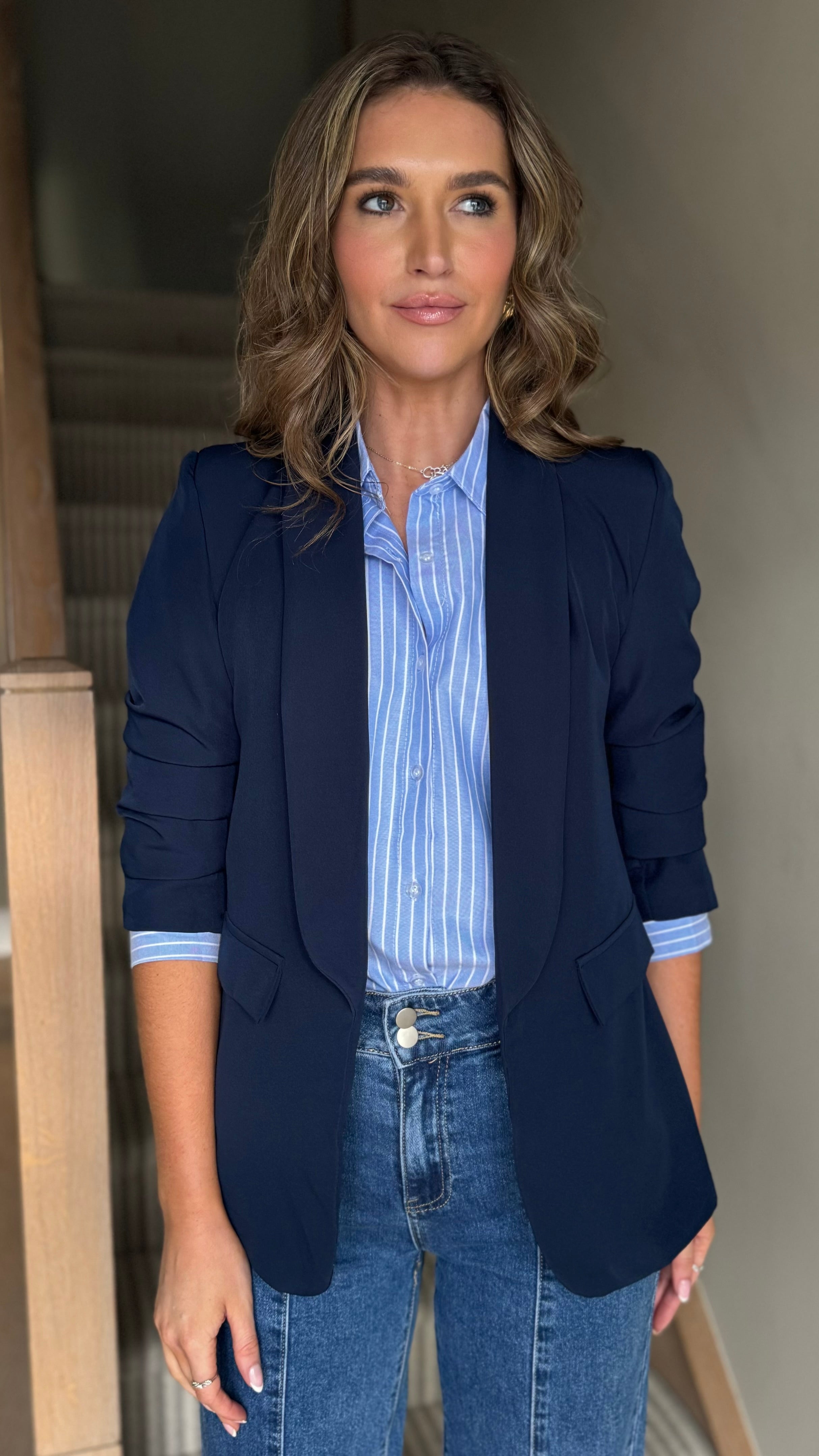 Elevate your wardrobe with the McKinley Navy Ruched Sleeve Blazer ✨. Crafted for a refined silhouette, its ruched sleeves add a subtle yet striking detail that enhances your professional and evening looks. The deep navy hue offers timeless versatility, making it a perfect choice for sophisticated style with a modern twist. Perfect for making a confident statement at any occasion. 🌟