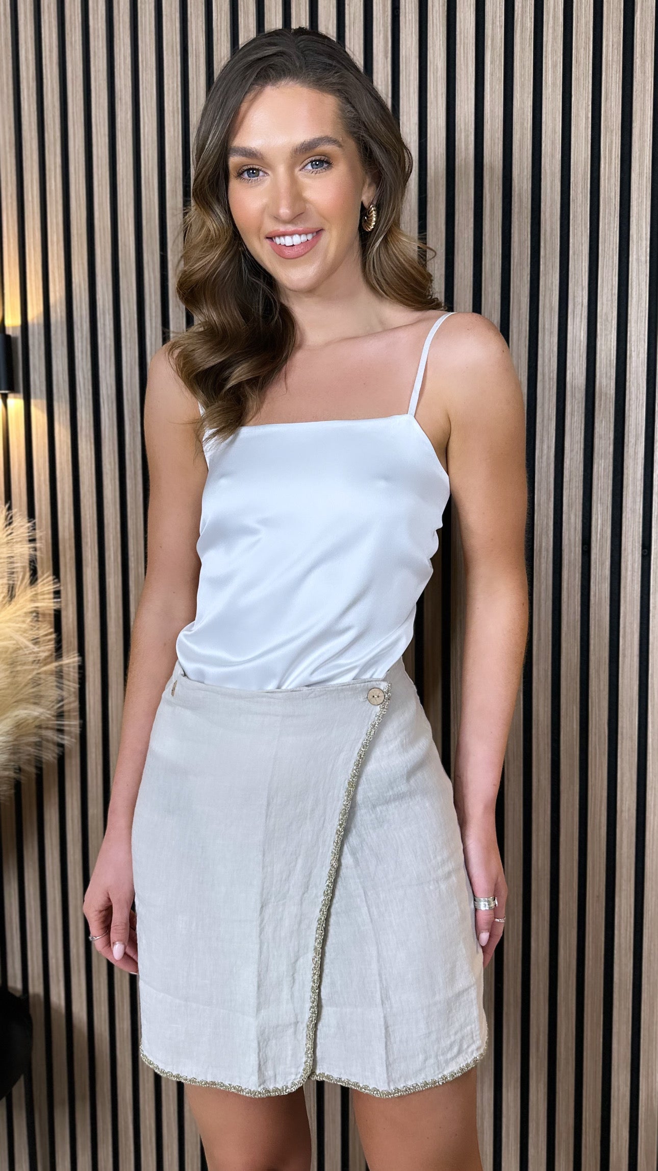 Make your outfit pop with our Selene White Cami Strap Top! Featuring adjustable straps and a playful bow tie back detail, this top is perfect for adding a touch of fun to any look. Made with a luxurious satin material, you'll feel comfortable and stylish in this top. 💃🎀