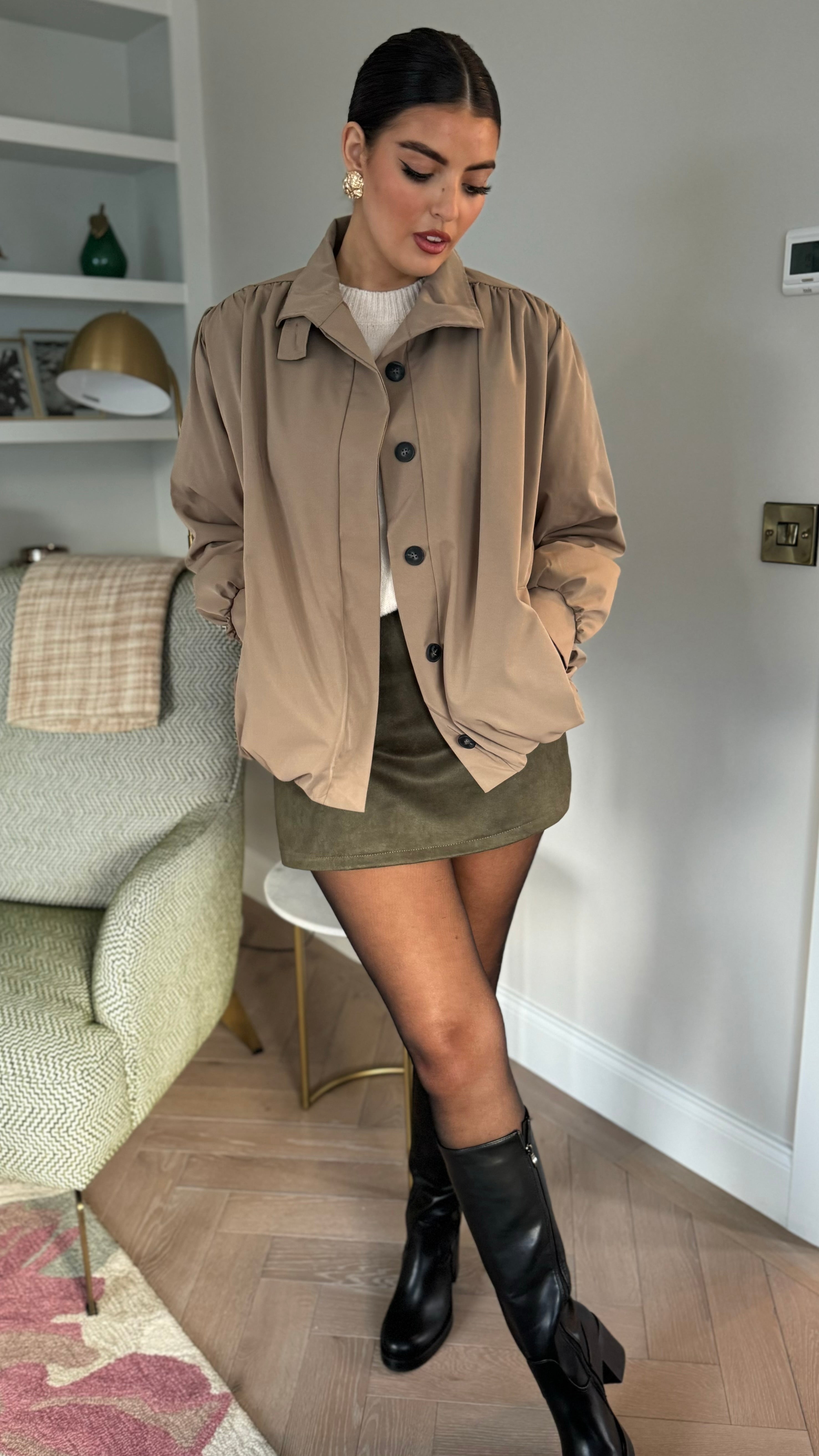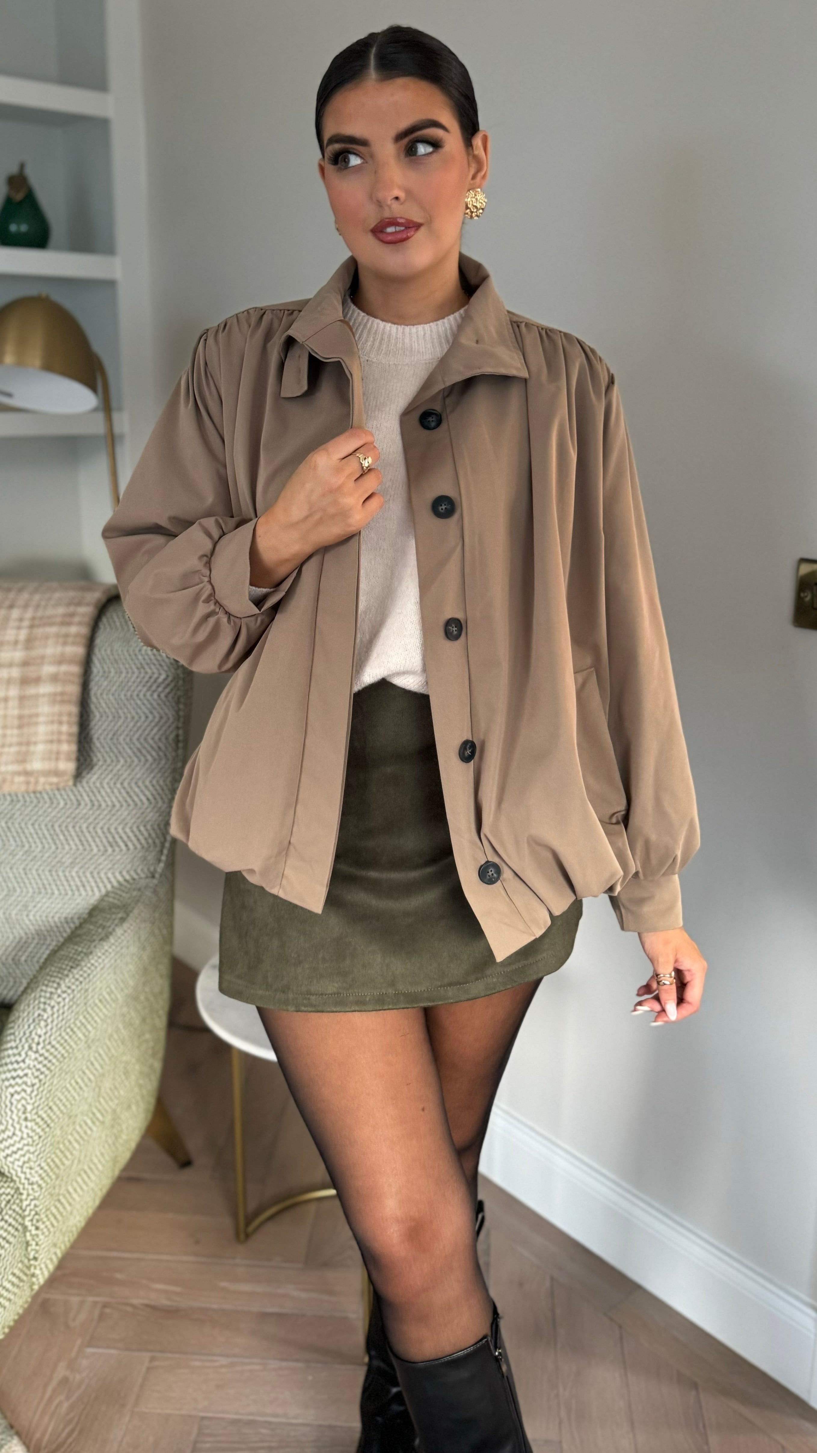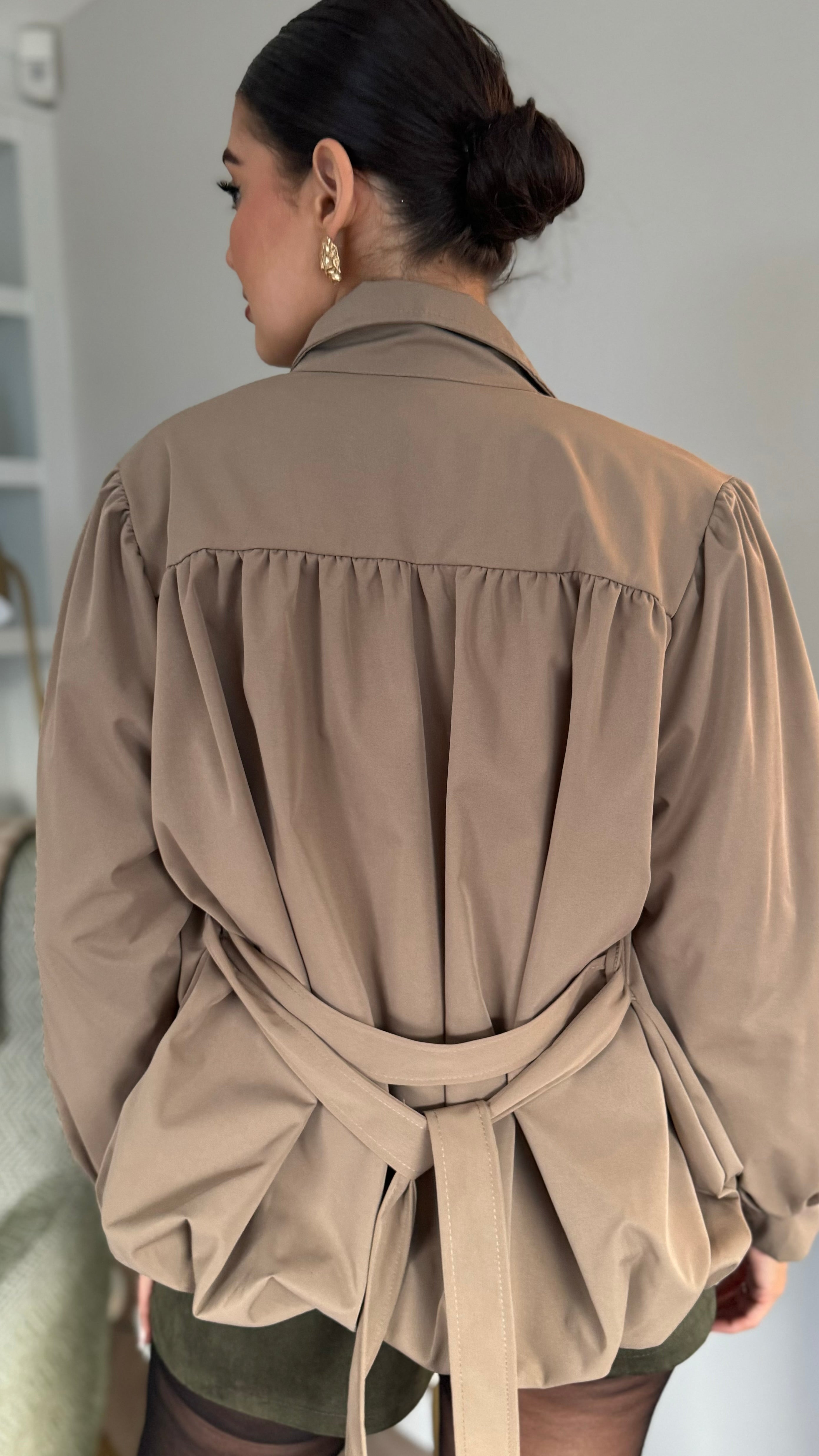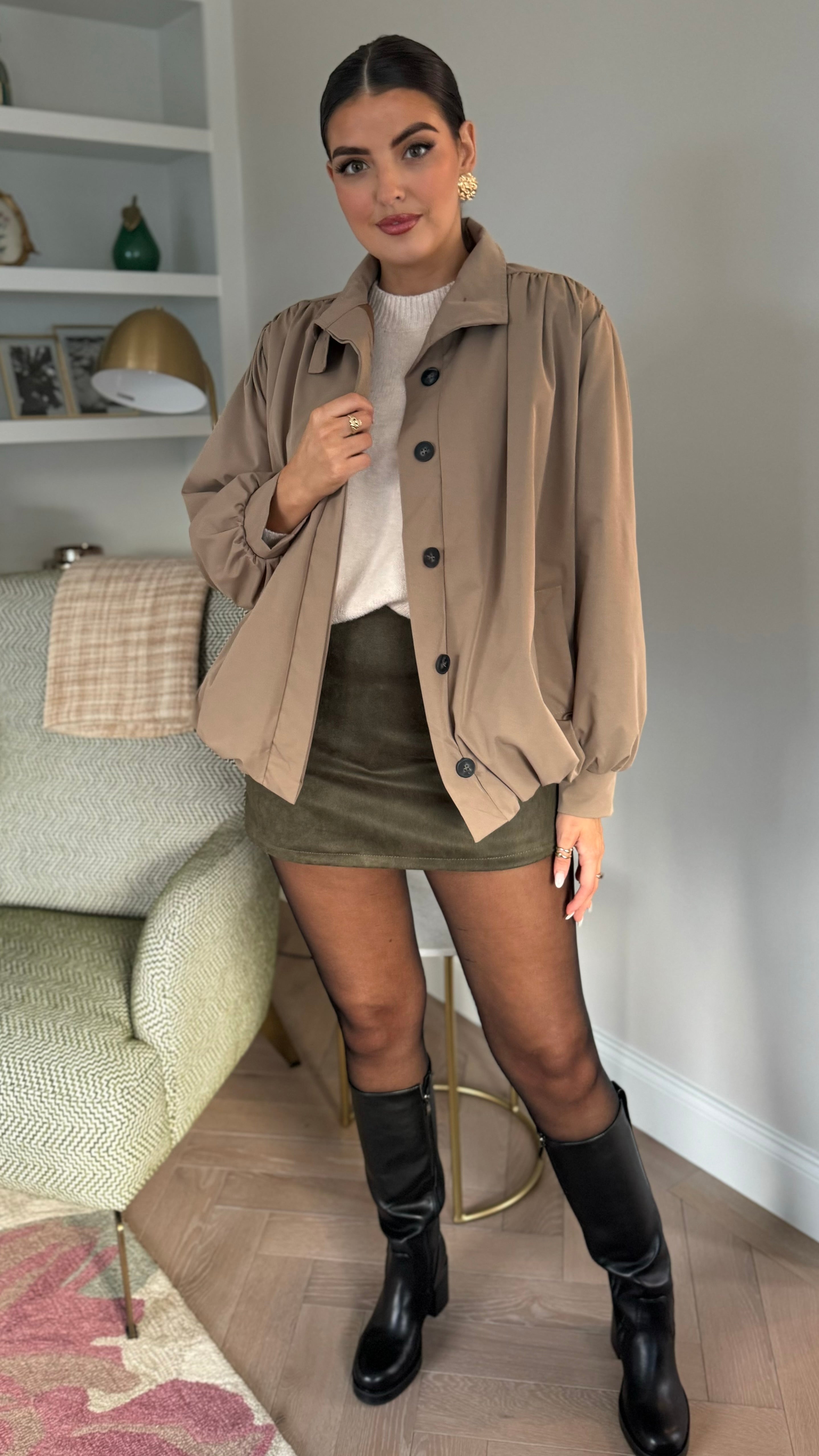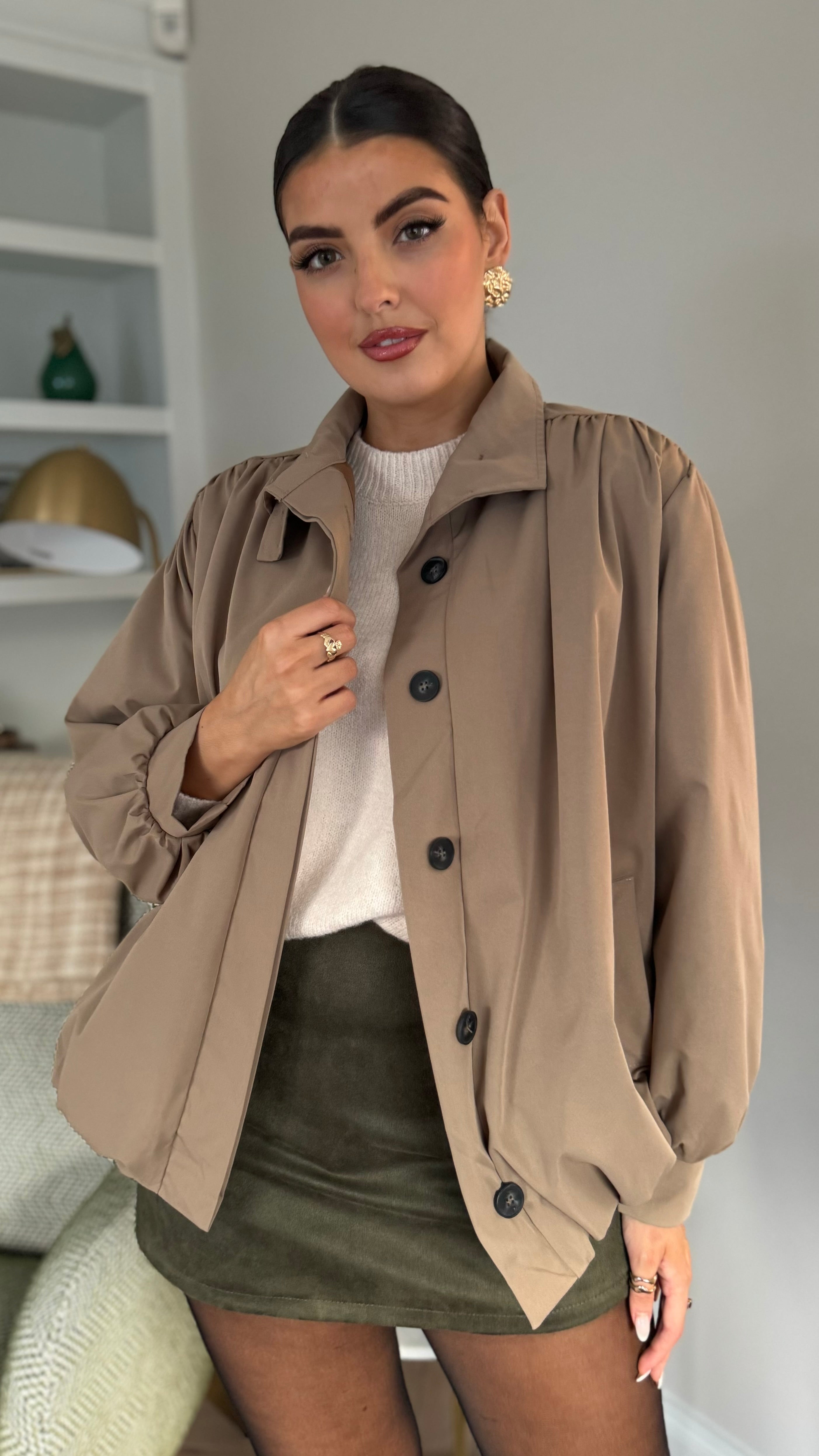 Meet your new go-to layer! This taupe funnel neck jacket is all about effortless style with serious staying power. The stand-up funnel collar adds instant polish, while button tabs and long sleeves keep things structured and chic. Slip on with ease thanks to the concealed front buttons—no fussy fasteners here. Cinch the adjustable waist belt to find your perfect fit, and enjoy the soft lining that feels as good as it looks. Versatile enough for everything from casual coffee runs to weekend adventures.