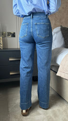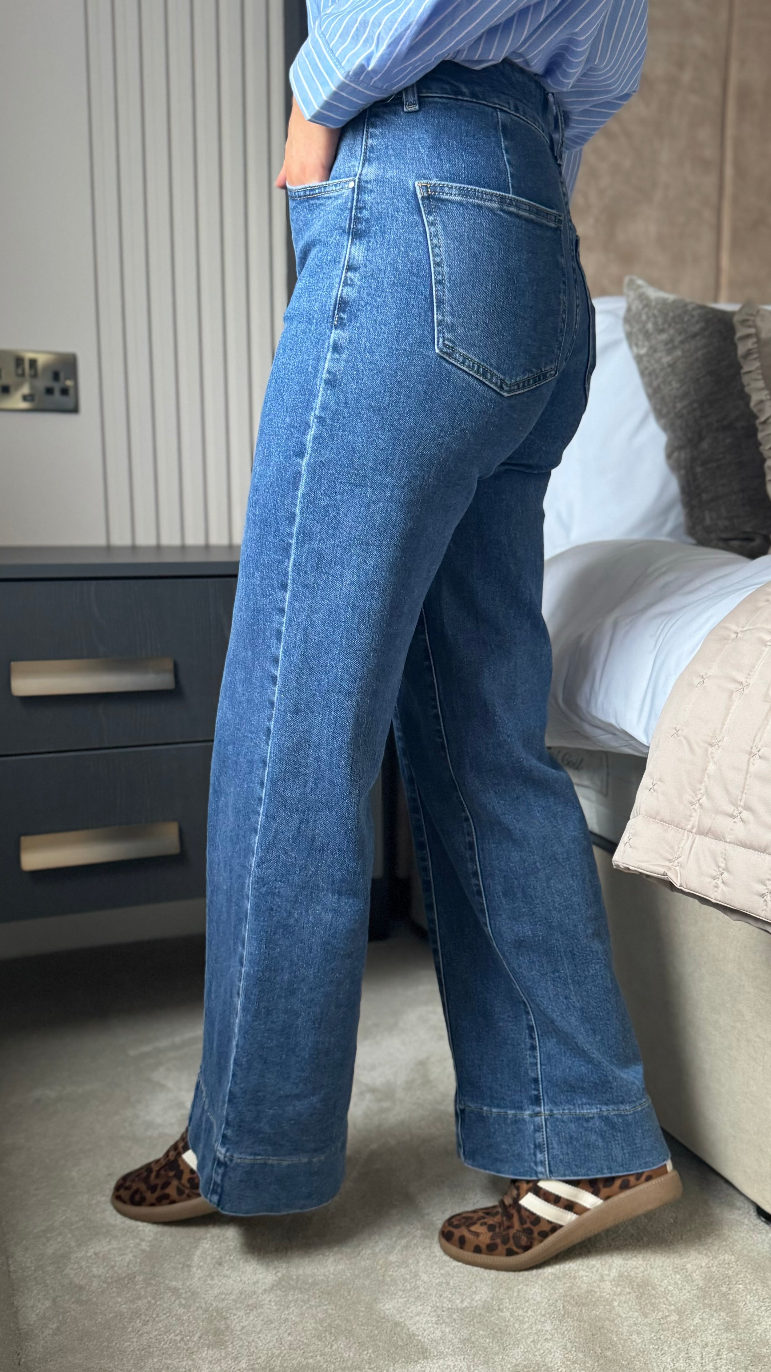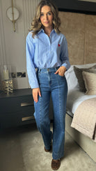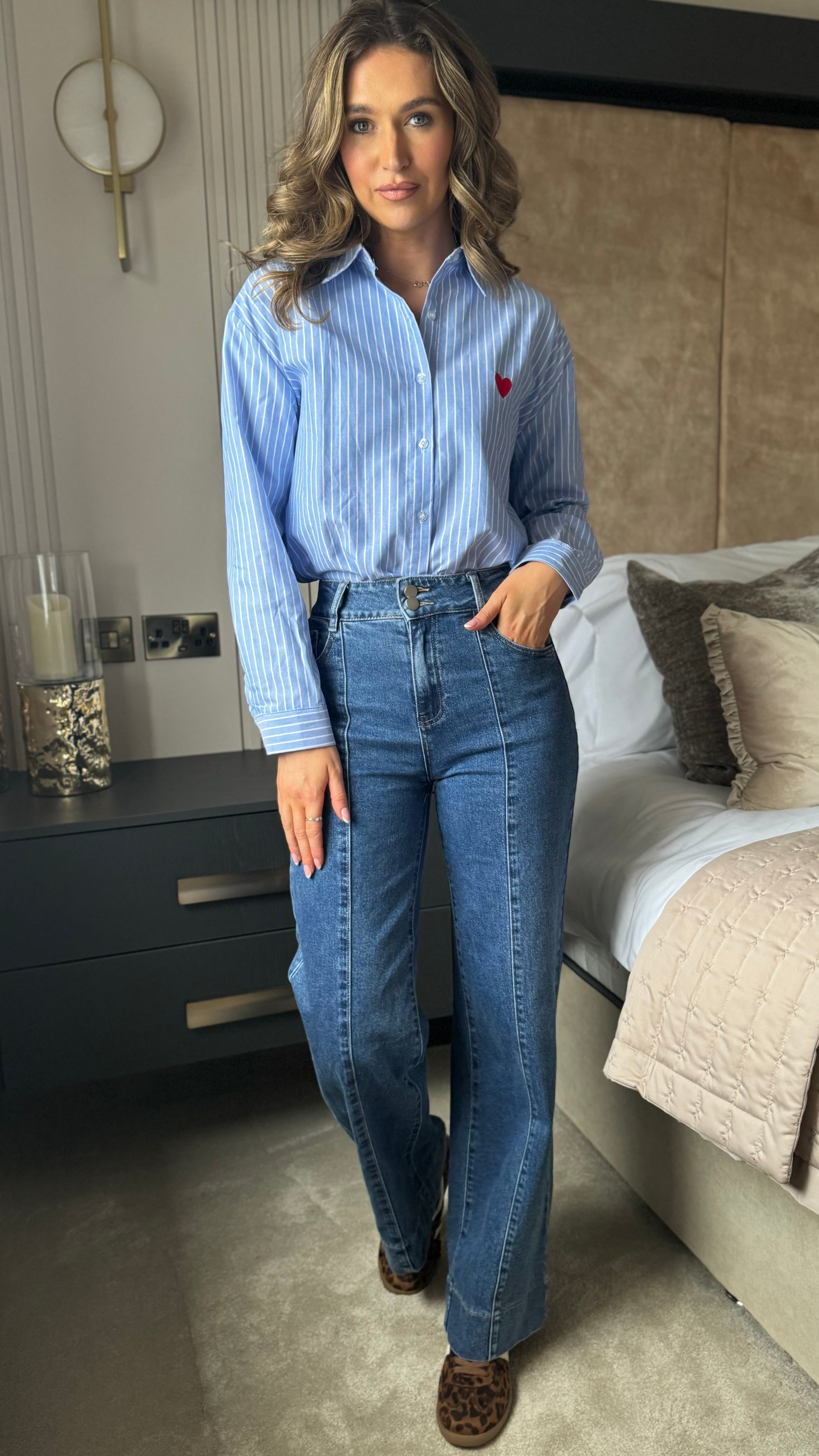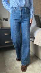 Step out in style with the Briella Blue Denim Front Seam Detail Jeans! Featuring a double-button closure and a flattering high waist, these jeans hug your curves while offering comfort thanks to their soft, stretchy fabric. The standout front seam adds a trendy touch, complemented by handy front and back pockets. Perfect for playful days or casual nights, these jeans bring fun and function together effortlessly.