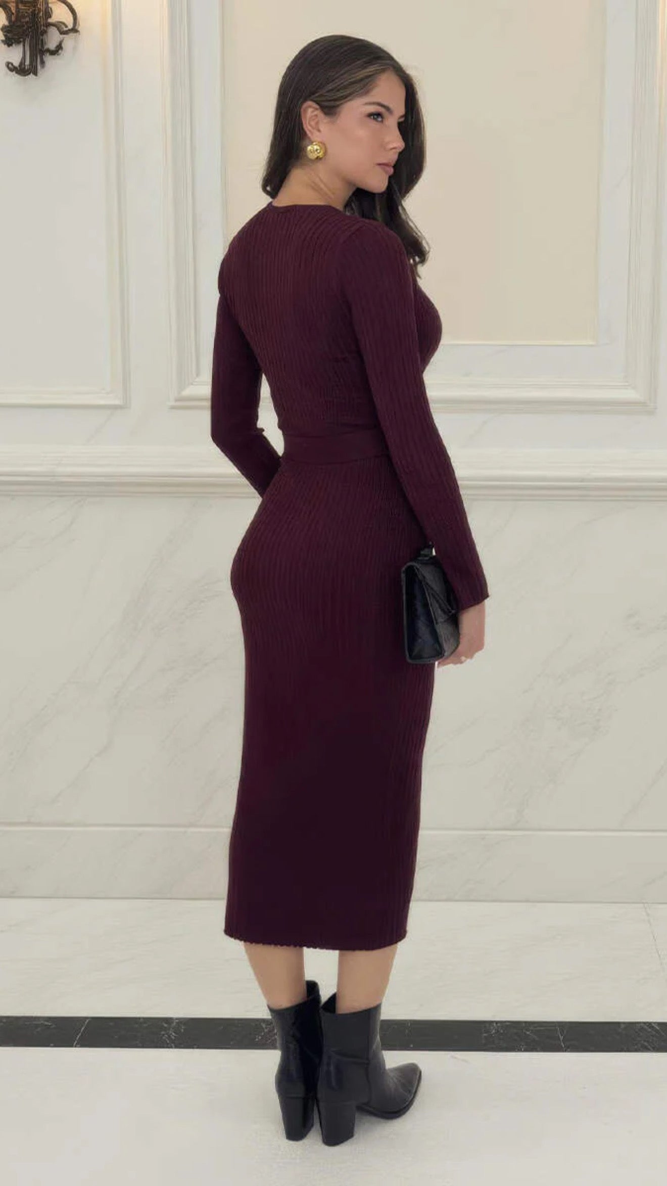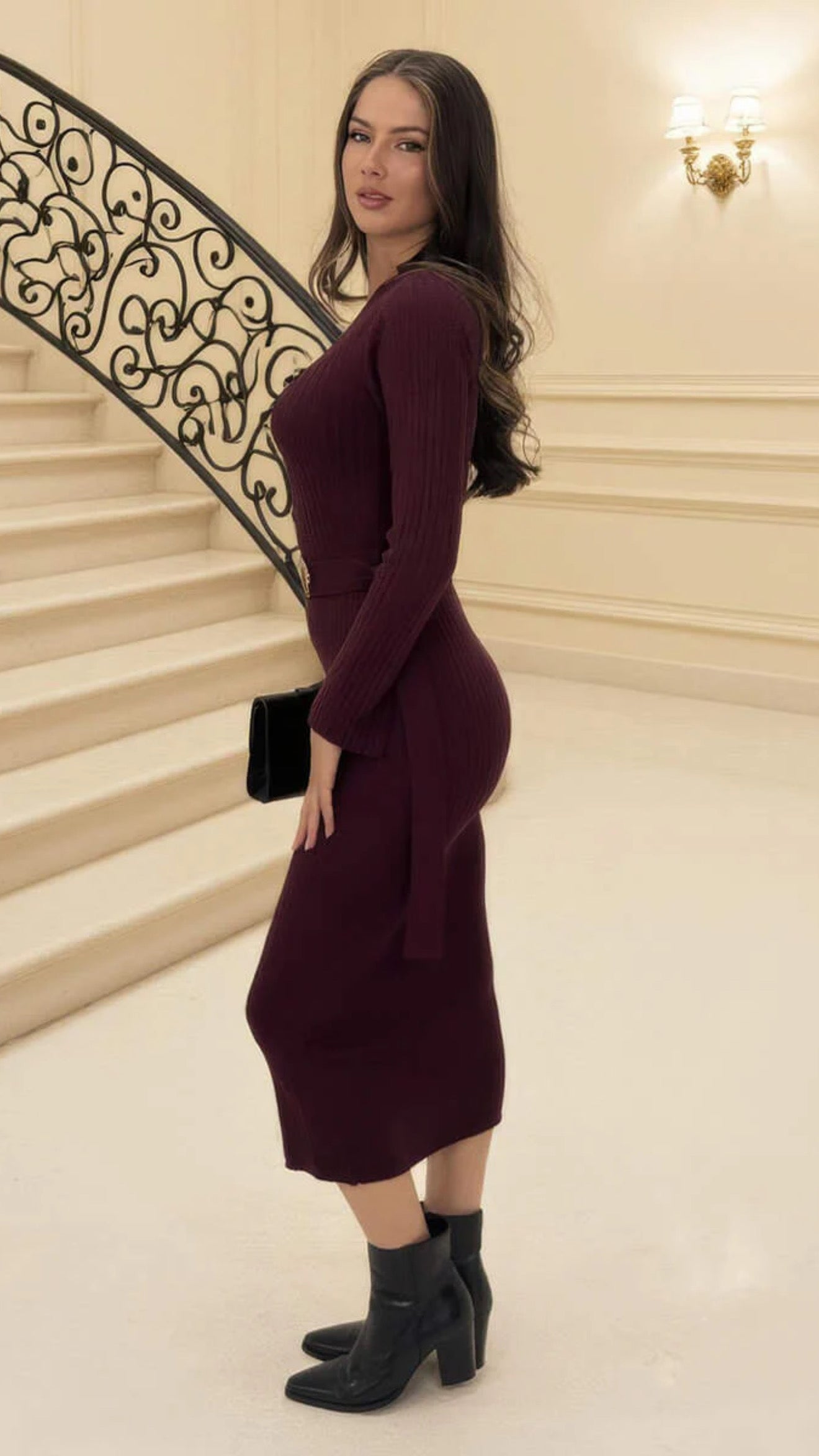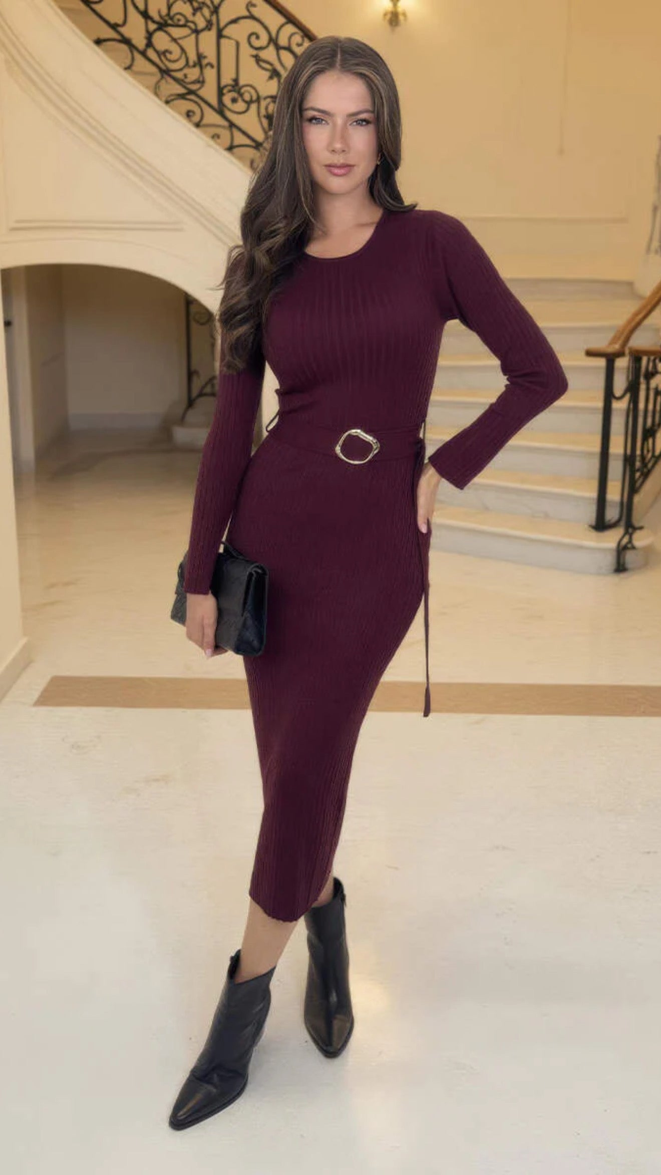 Step into effortless style with the Aifric Burgundy Midi Dress. Its cozy ribbed knit wraps you in soft, stretchy comfort while the playful gold buckle adds a touch of sparkle. Long sleeves and a round neckline keep it classic, and the tie belt cinches your waist for a flattering silhouette.