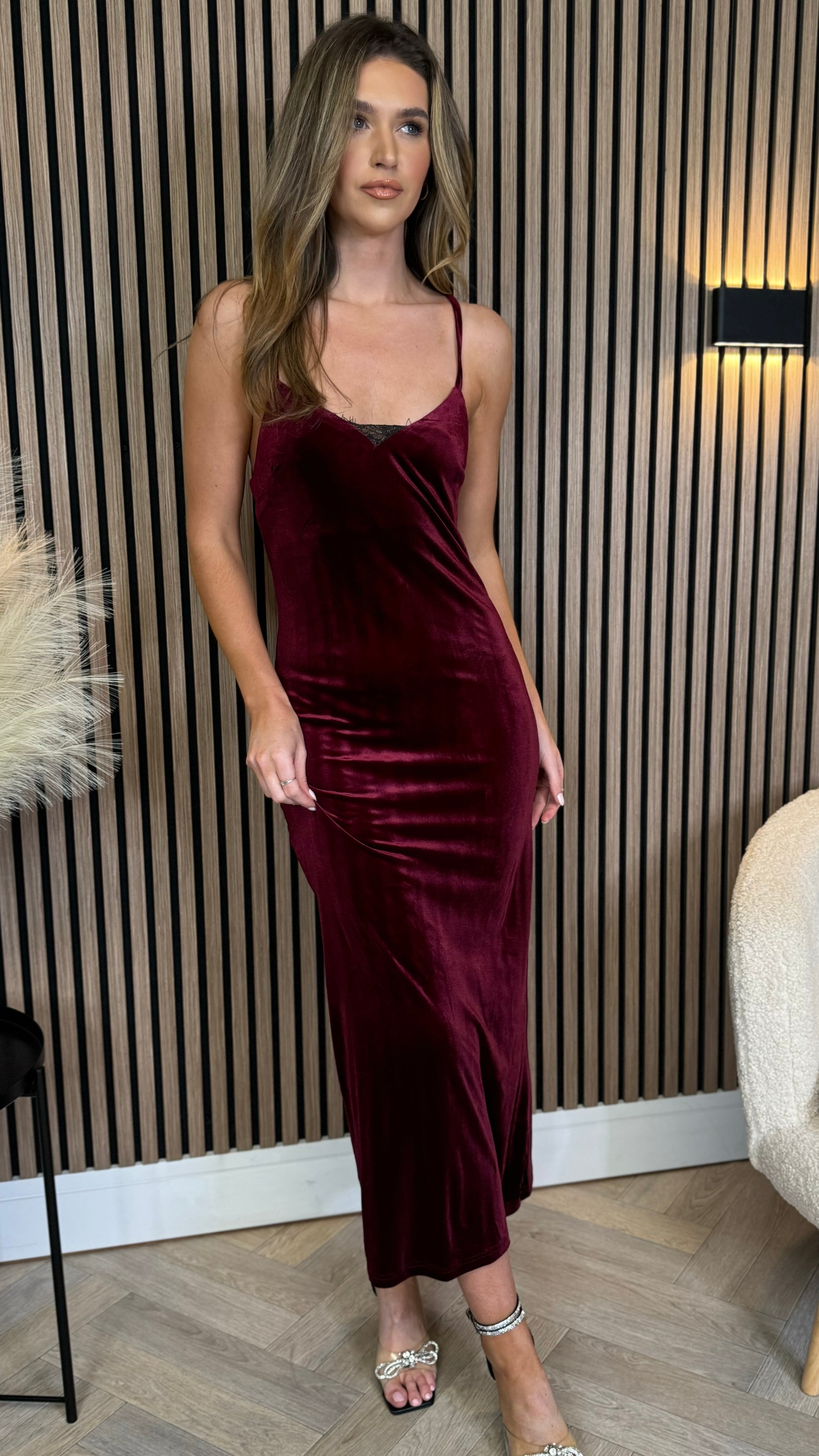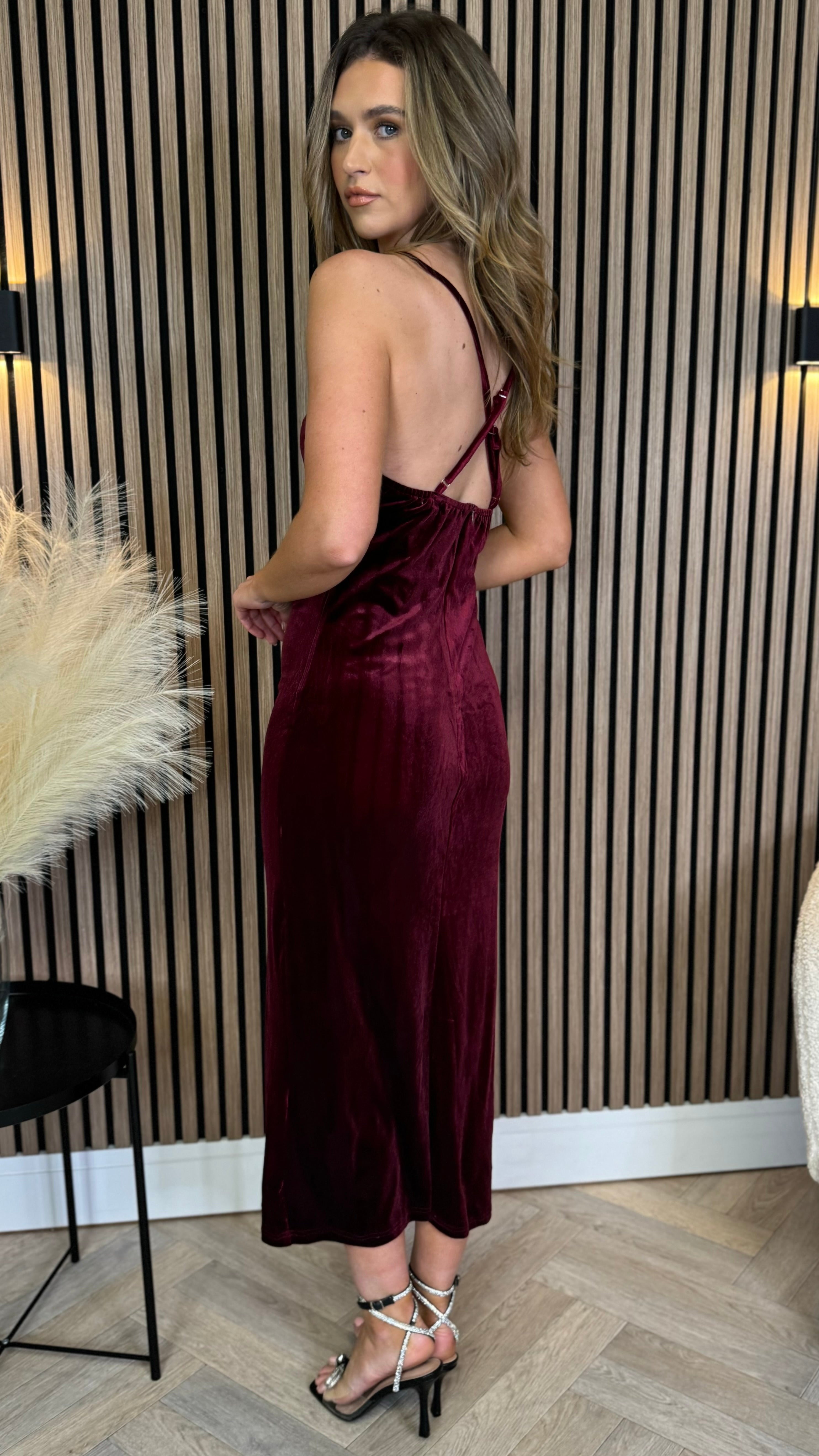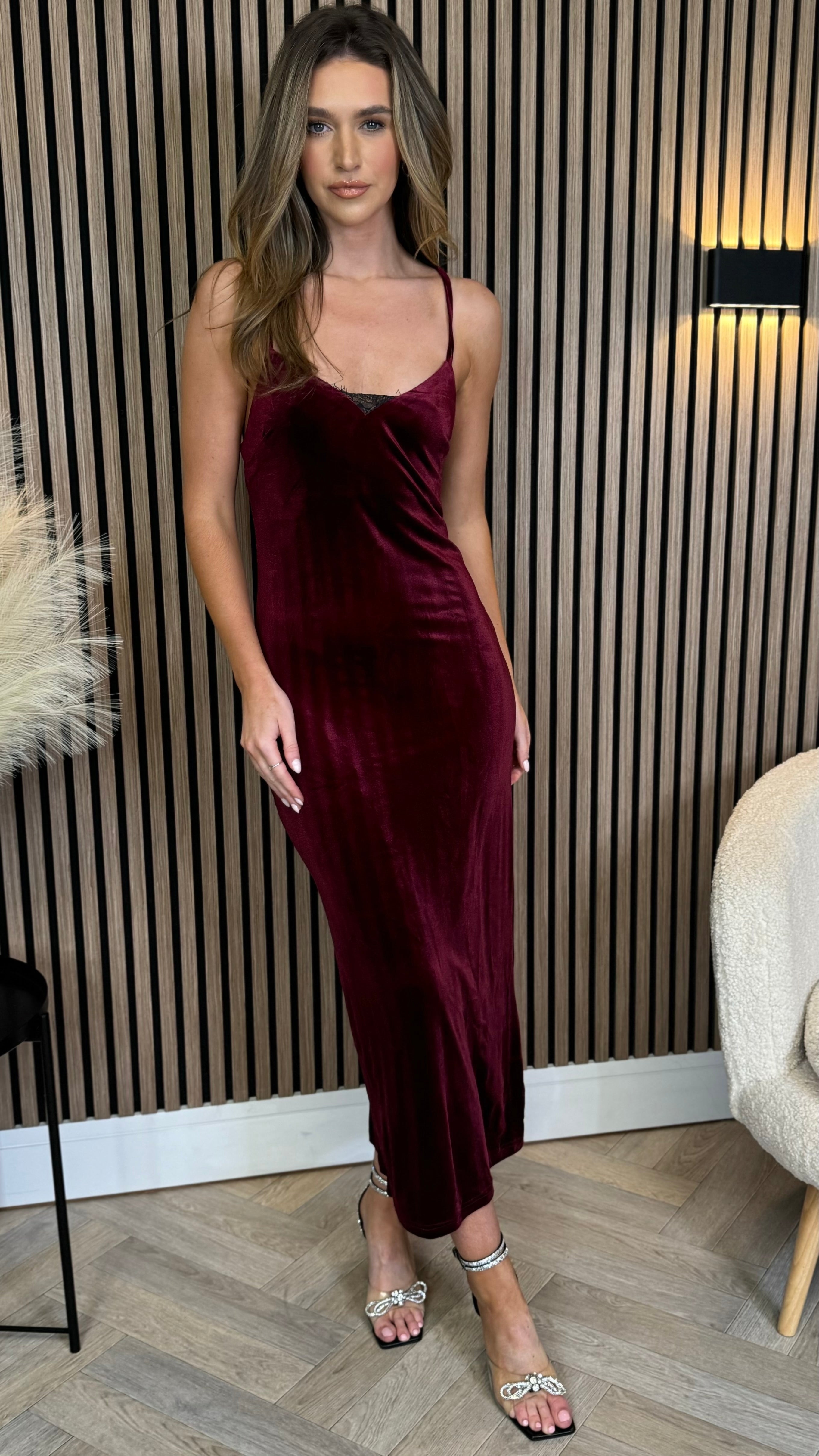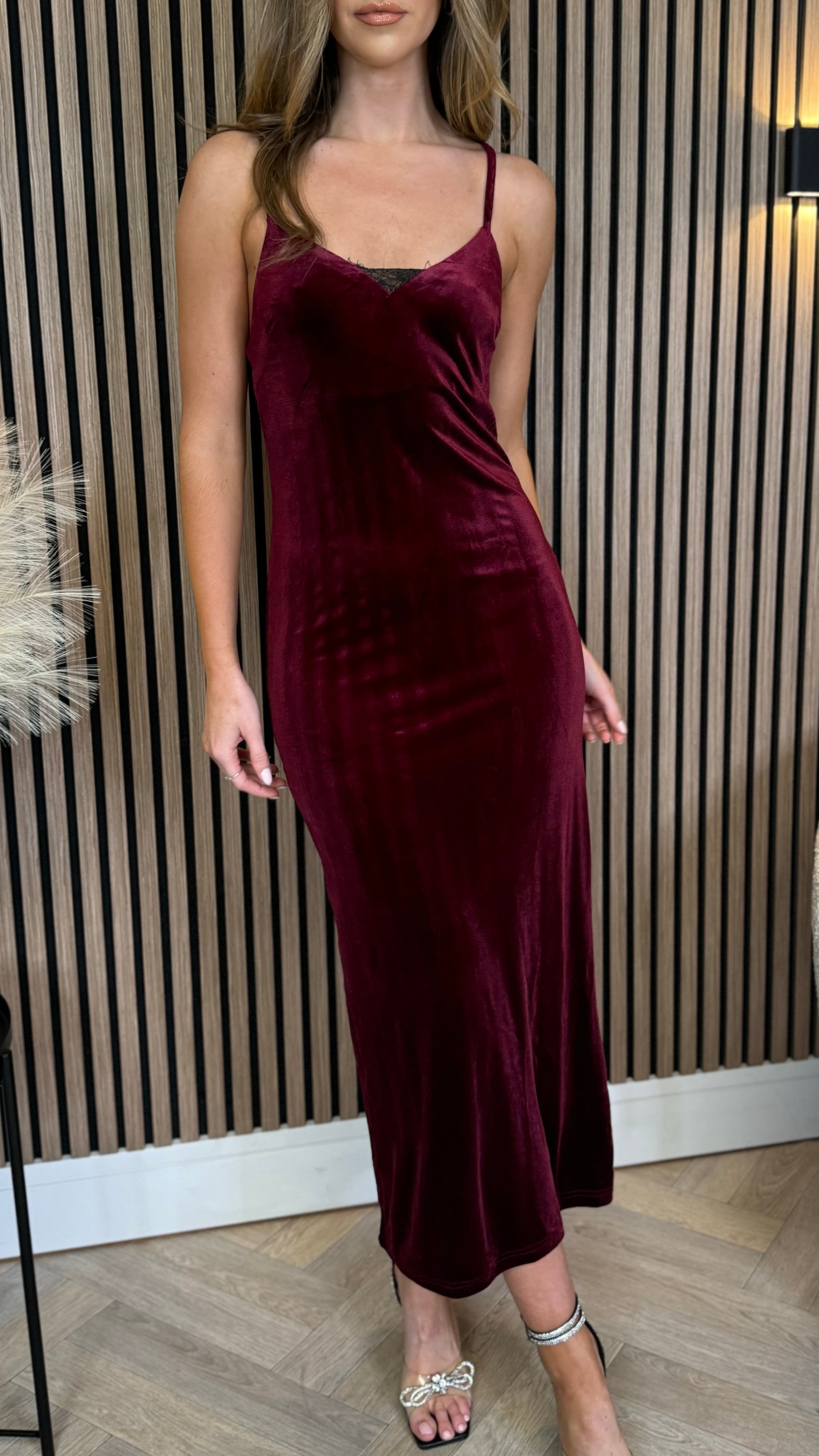 Alva Burgundy Cami Strap Velvet Finish Midi Dress