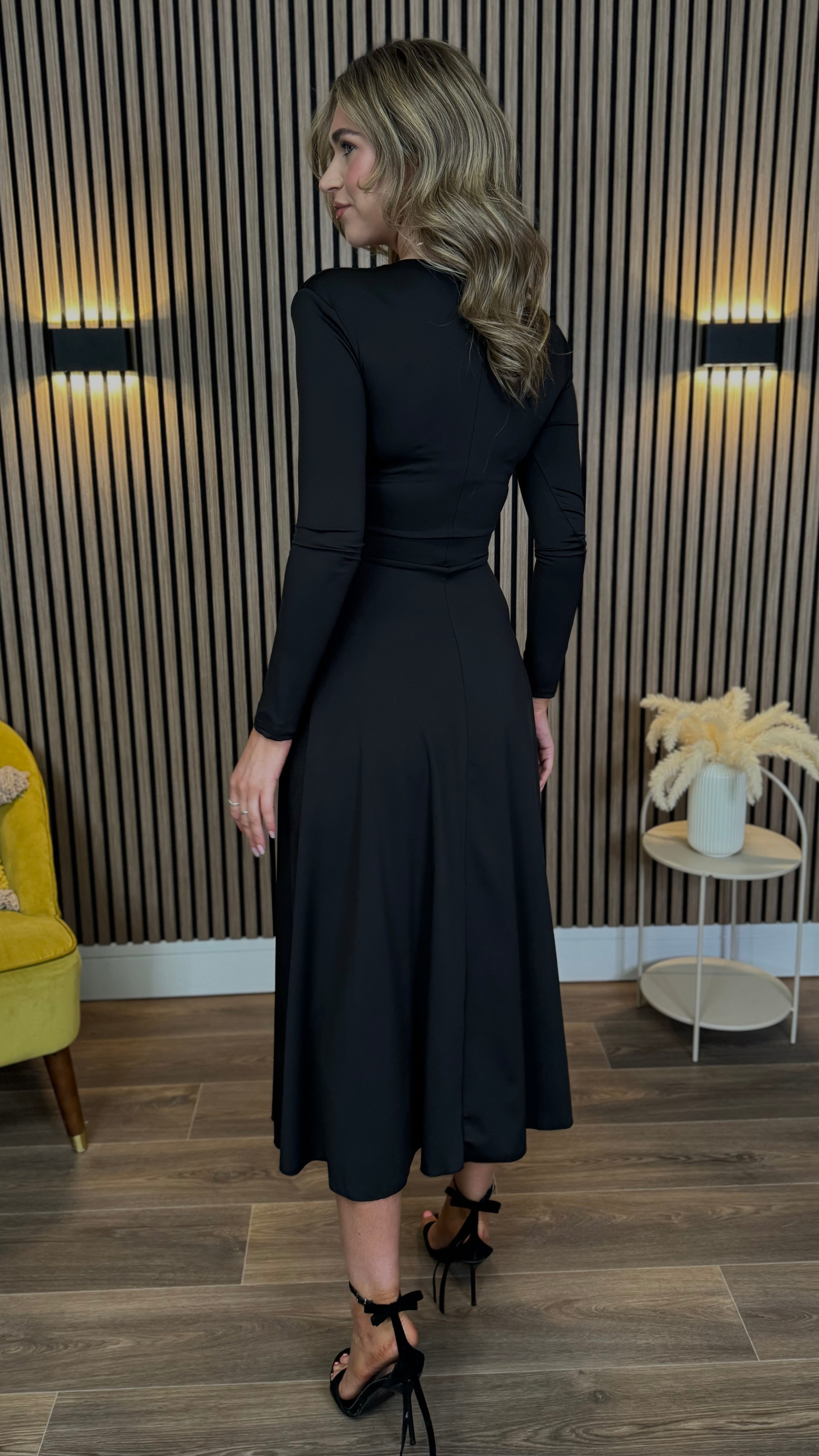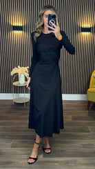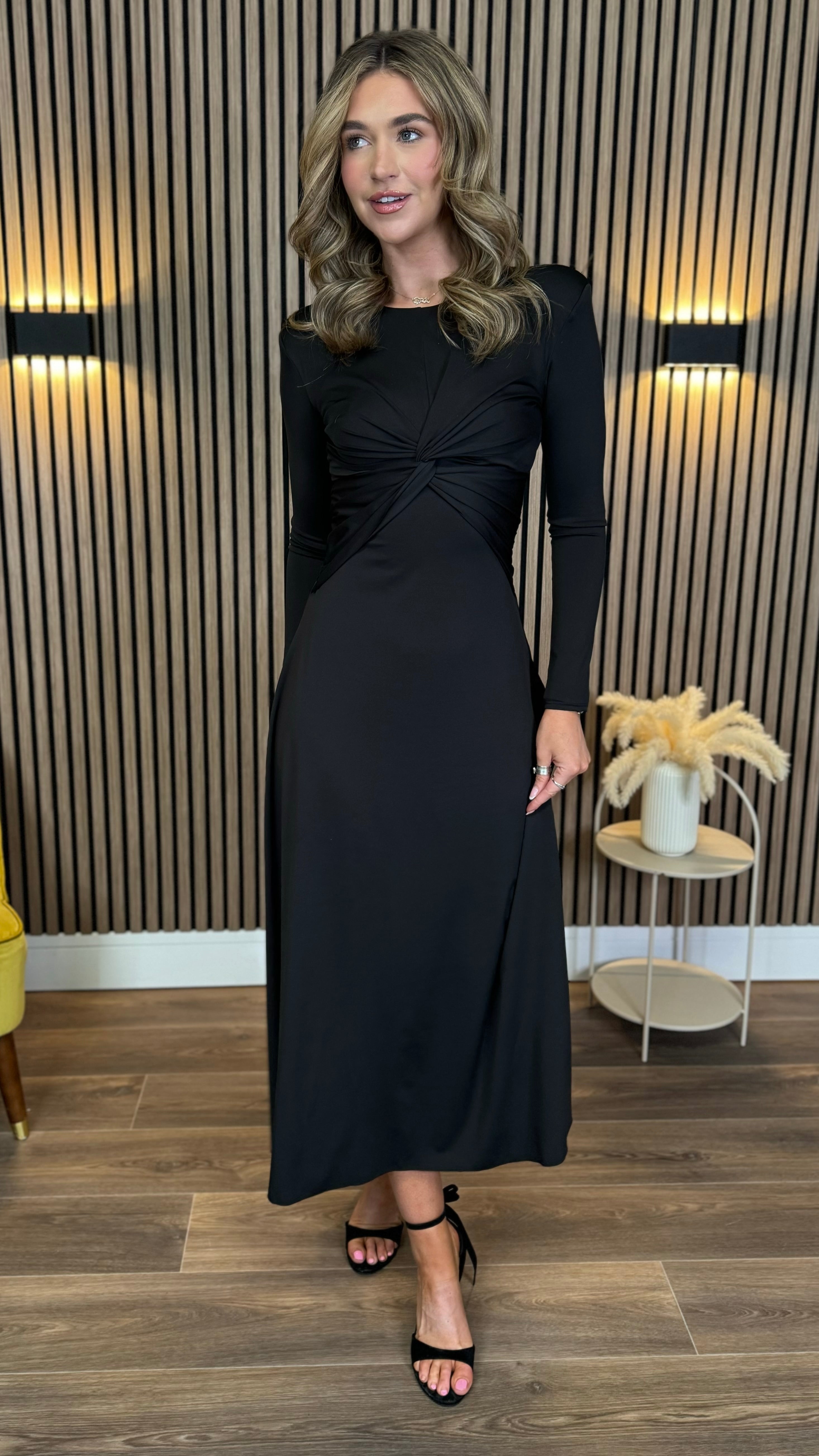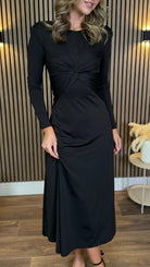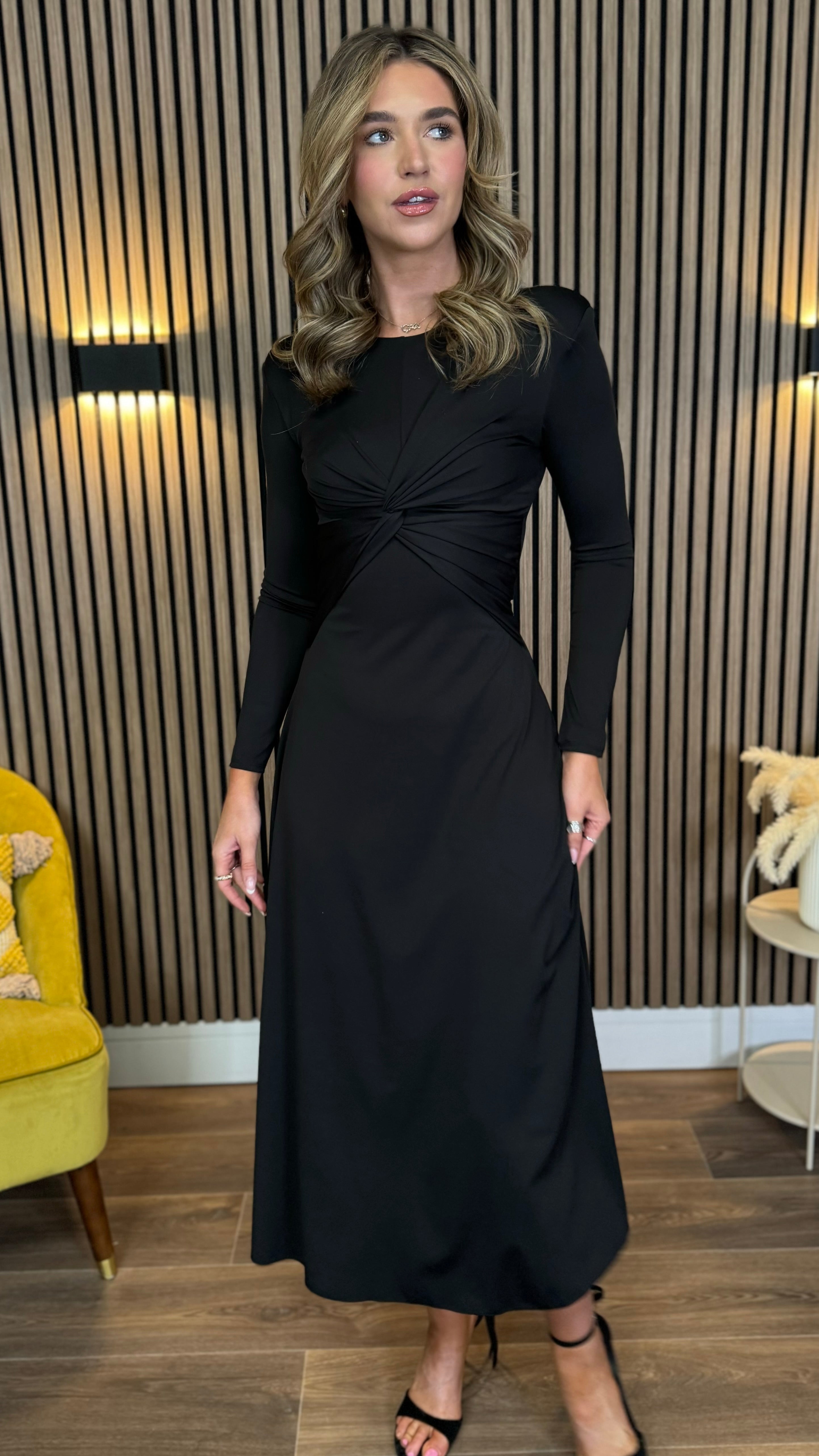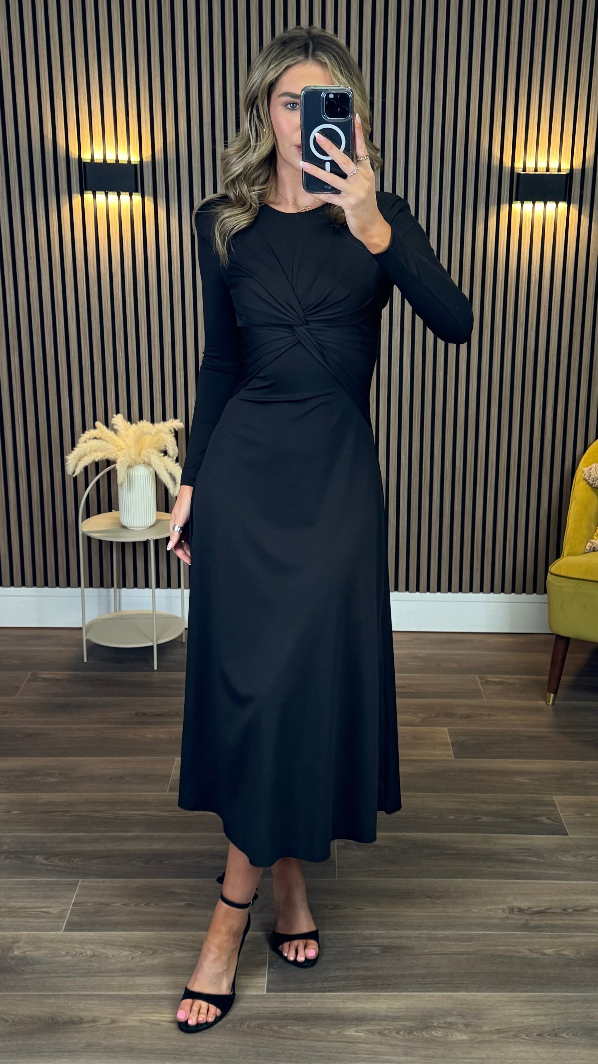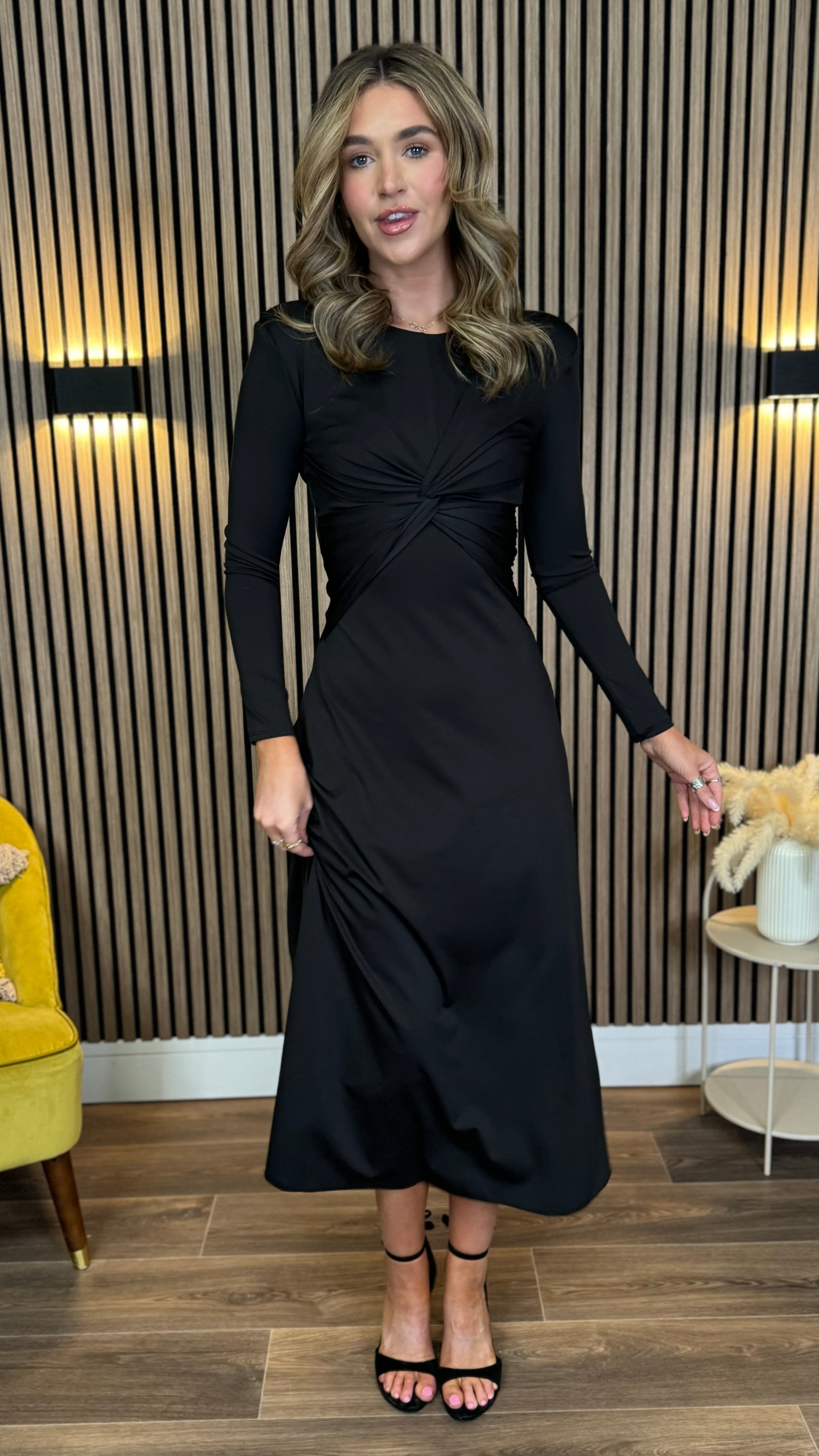 This playful midi dress features a charming knot front and flattering fitted waist that highlights your silhouette. Crafted from a soft, slinky fabric, it offers all-day comfort with a flared skirt that moves beautifully. Long sleeves and a round neckline complete the look, making it perfect for twirling through any occasion in style.