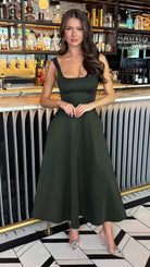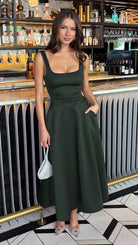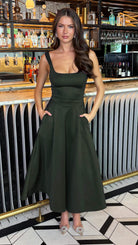 Avani Forest Green Square Neck Pocketed Midi Dress