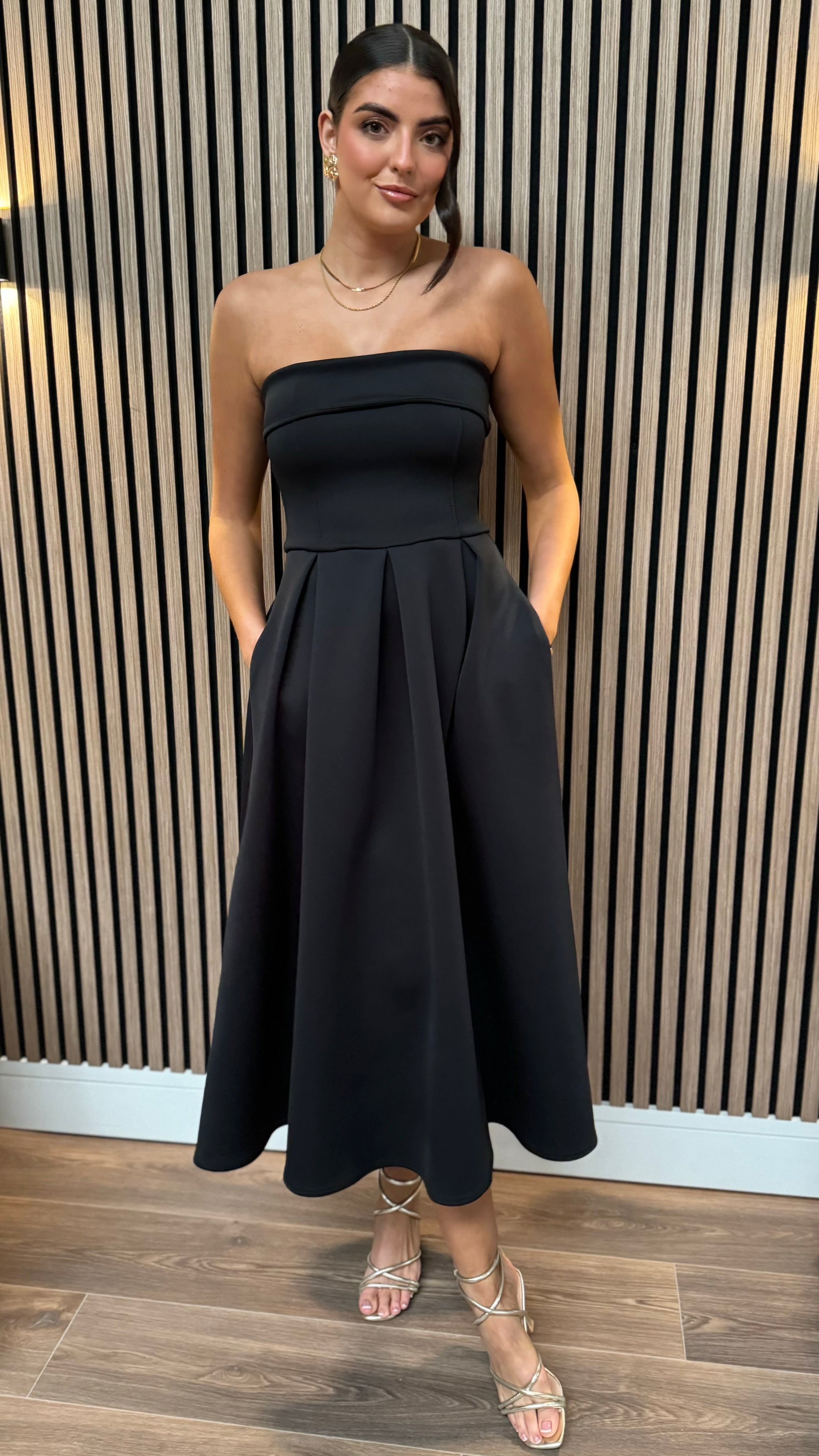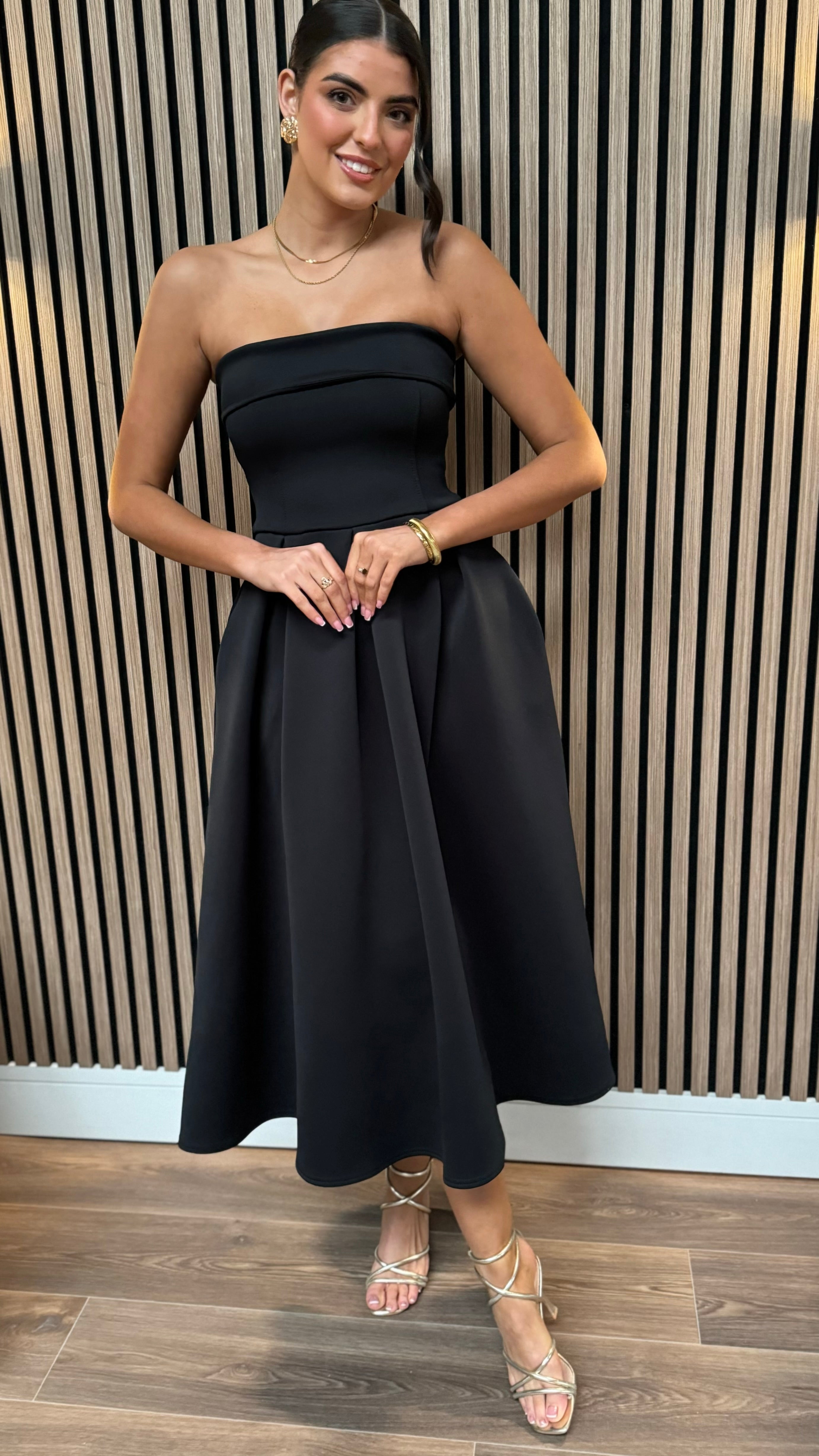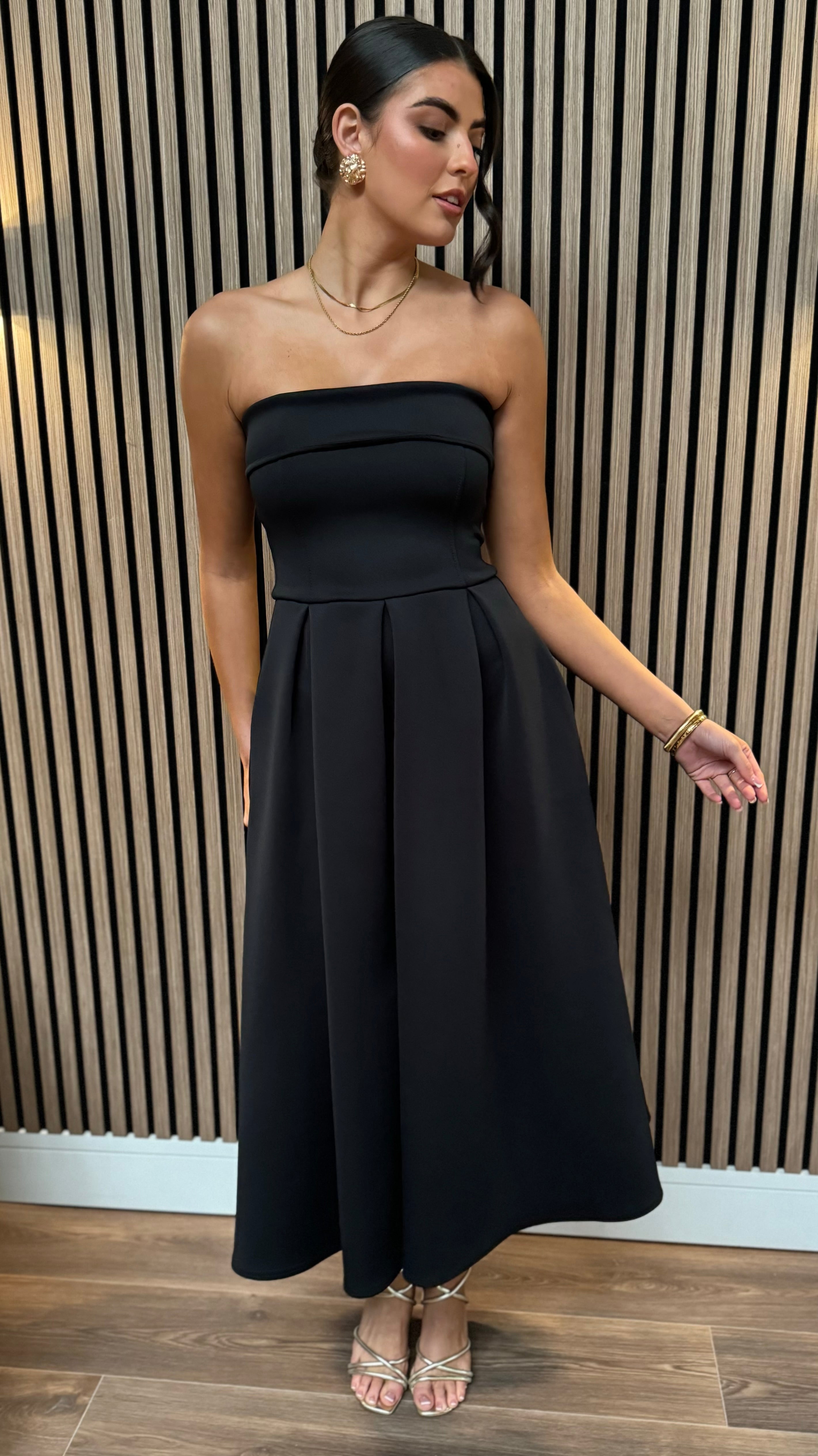 Get ready to turn heads in the Ayda Black Strapless Bandeau Midi Dress! This quirky and fun dress features a fitted top to accentuate your curves, while the full skirt adds a touch of playfulness to your look. Perfect for any occasion, this dress will have you feeling confident and stylish. 😍👗💃