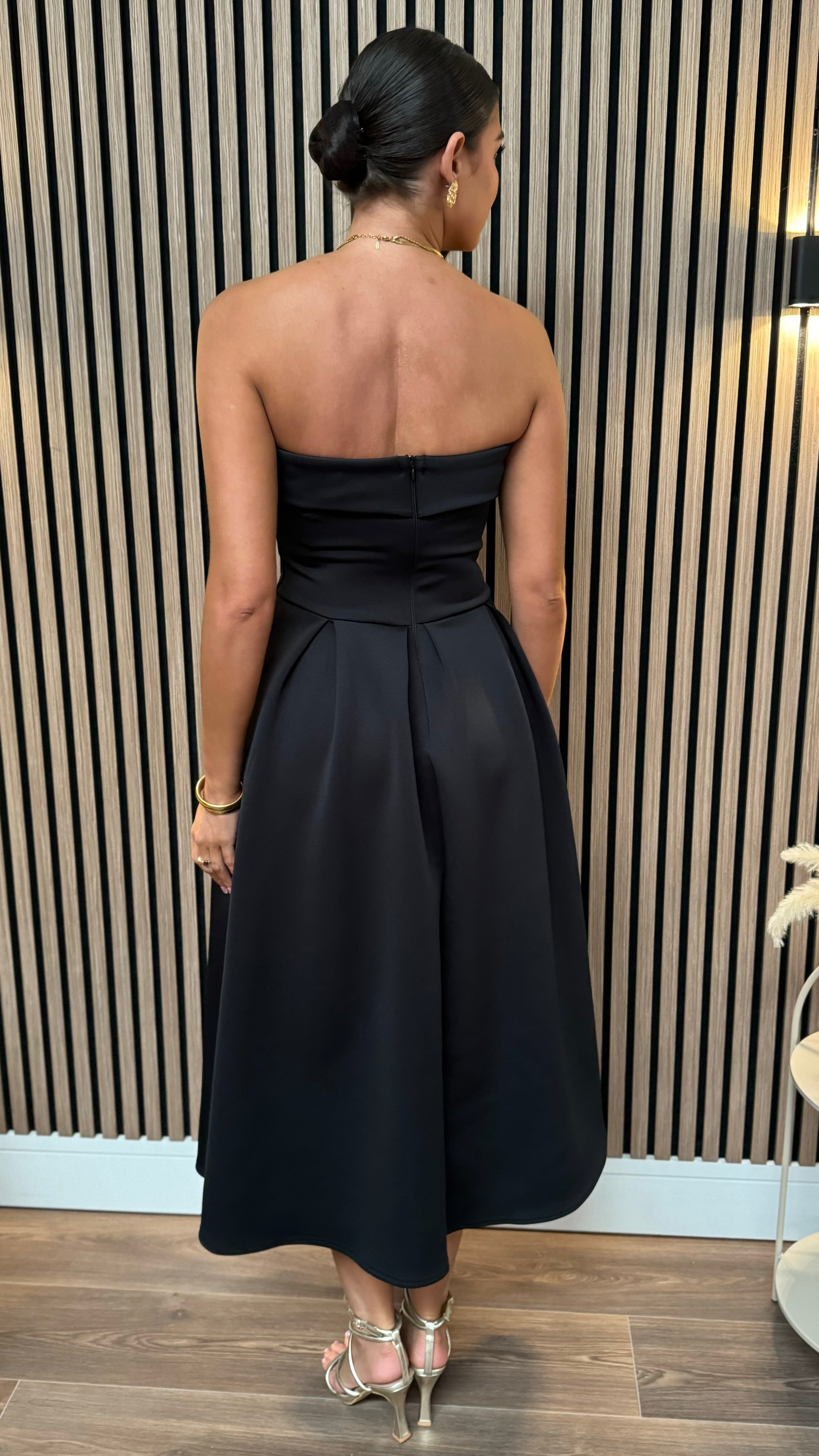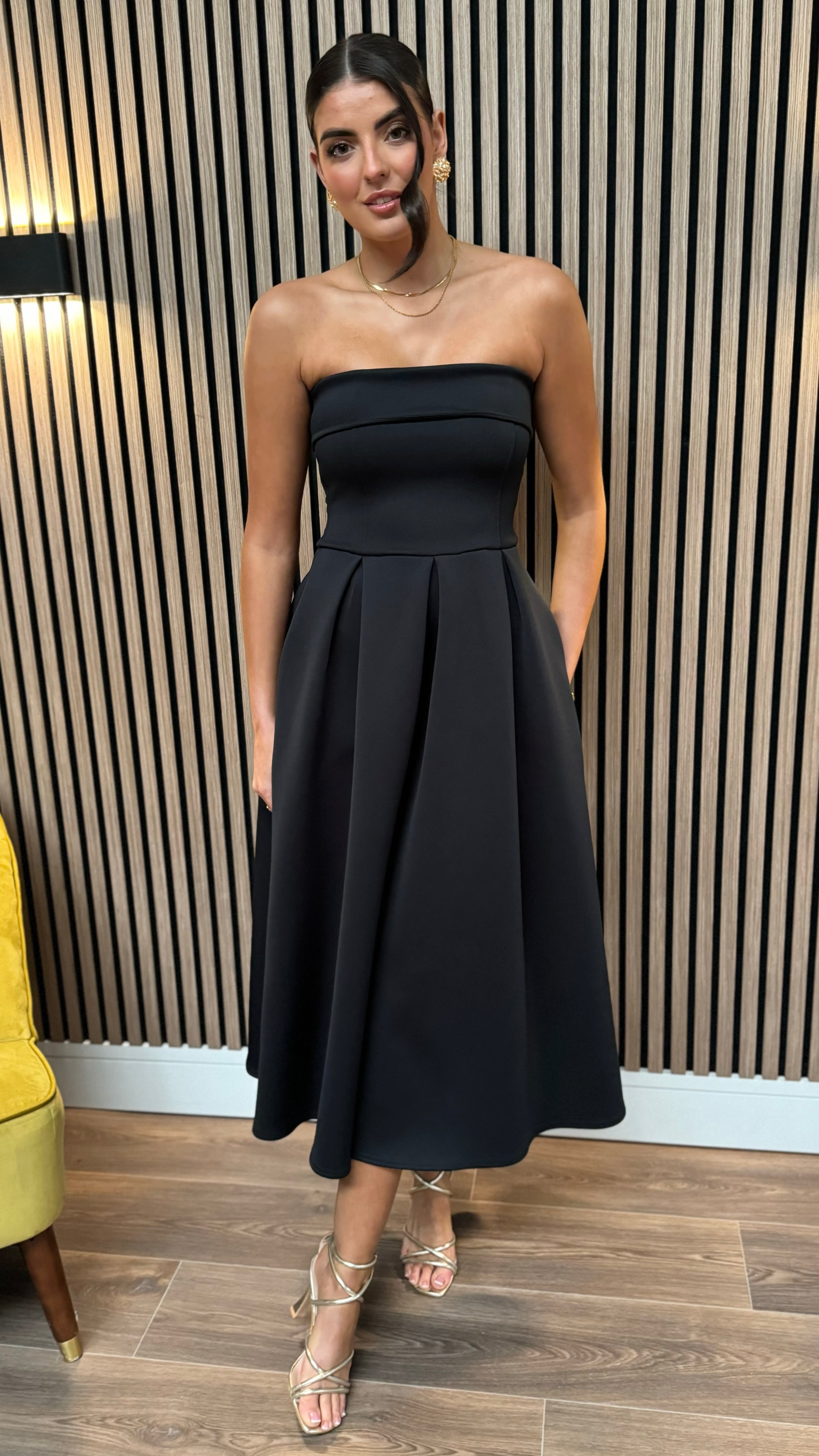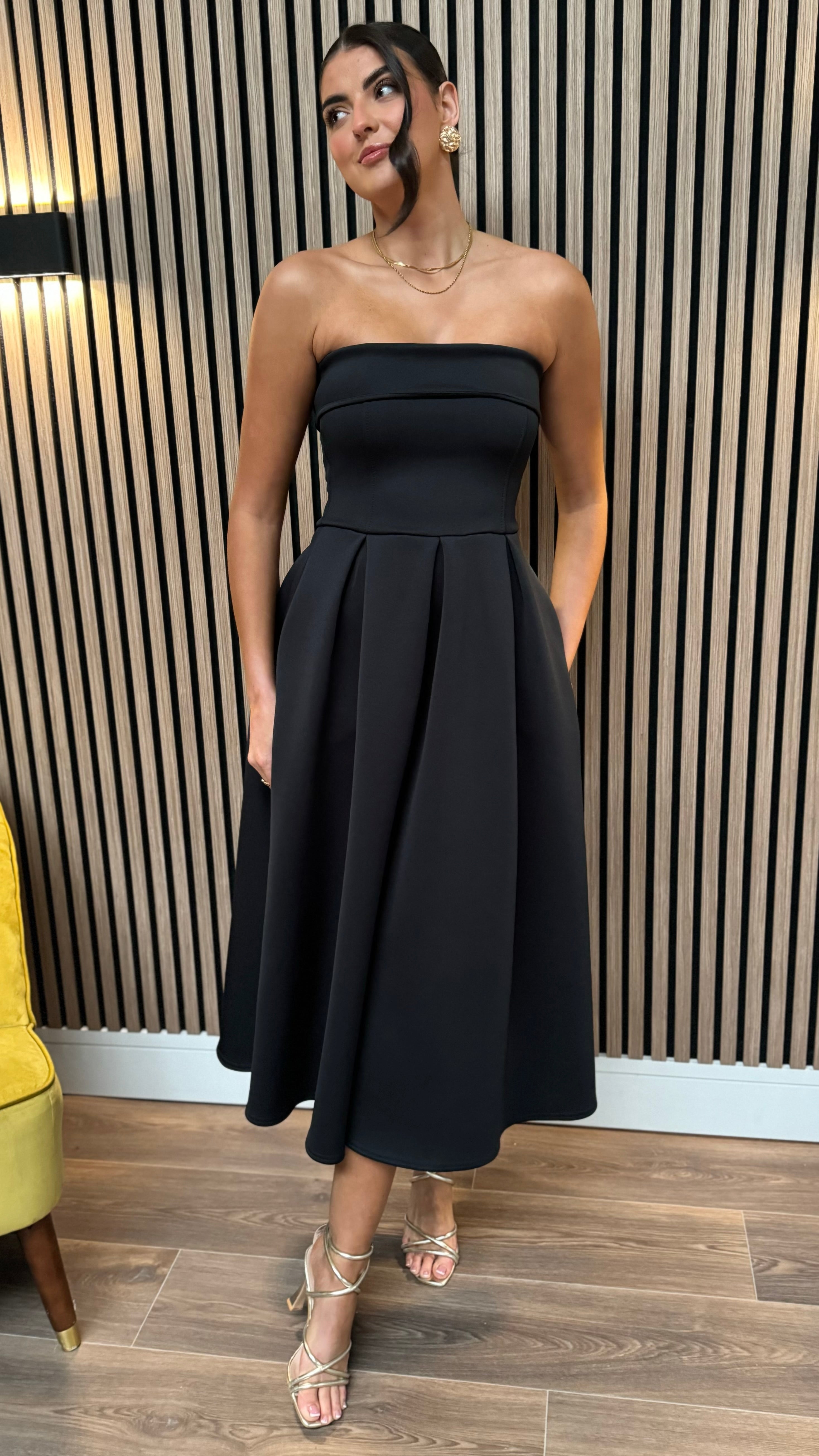Get ready to turn heads in the Ayda Black Strapless Bandeau Midi Dress! This quirky and fun dress features a fitted top to accentuate your curves, while the full skirt adds a touch of playfulness to your look. Perfect for any occasion, this dress will have you feeling confident and stylish. 😍👗💃