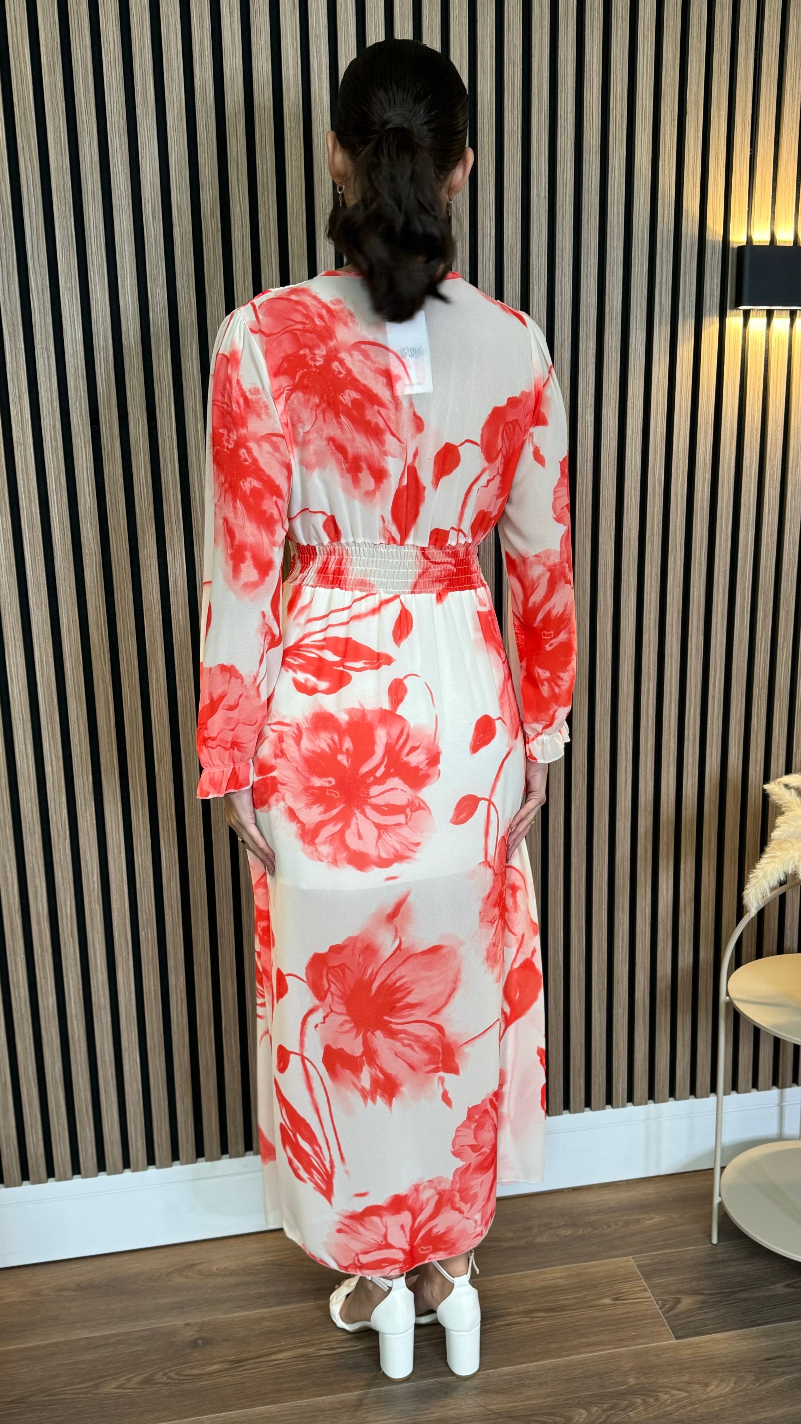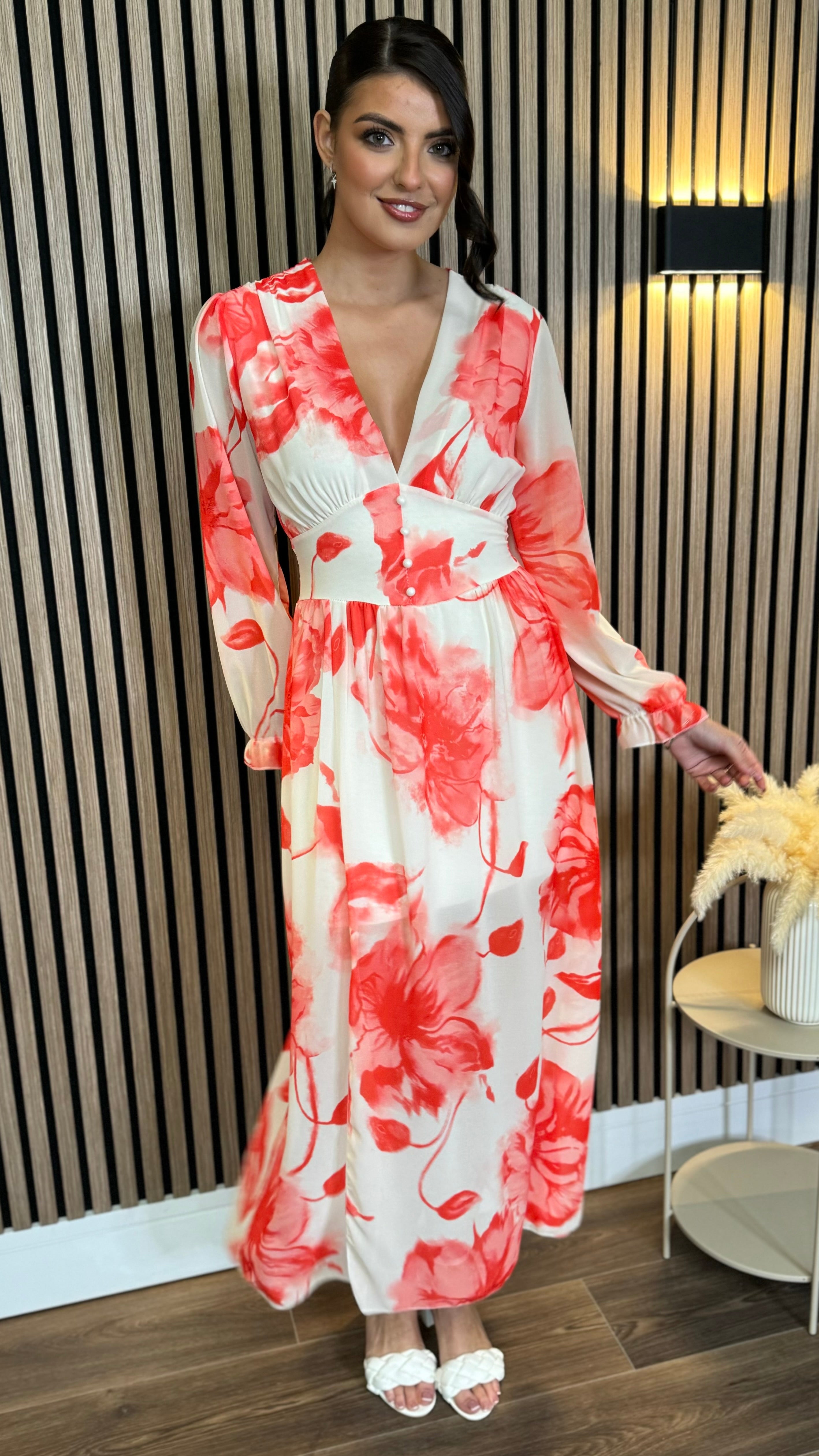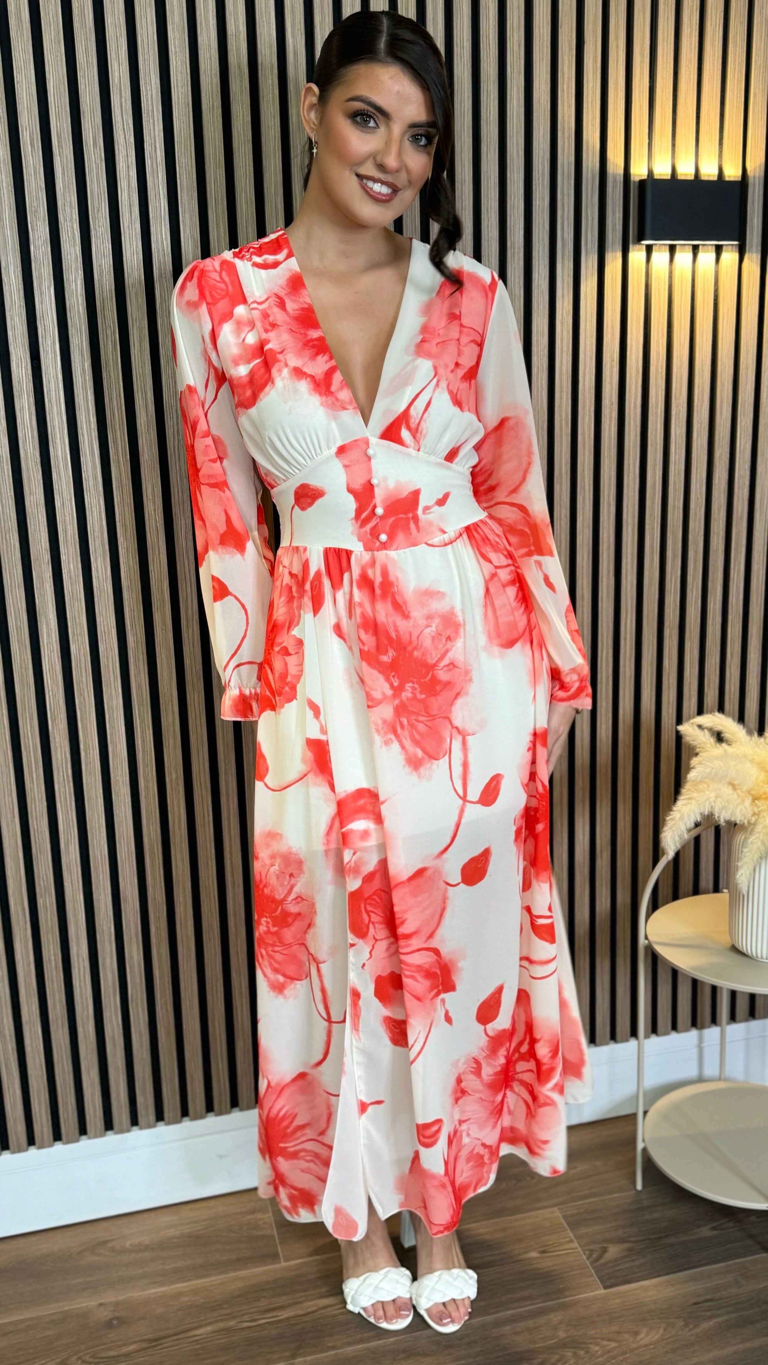 Get ready to turn heads with our Carmen Orange & Cream Printed Printed Midi Dress! This dress features a playful v neckline and a flowy midi length, perfect for any occasion. With its trendy long sleeves, you'll feel chic and stylish all day long.🌸👗