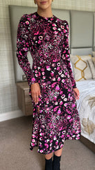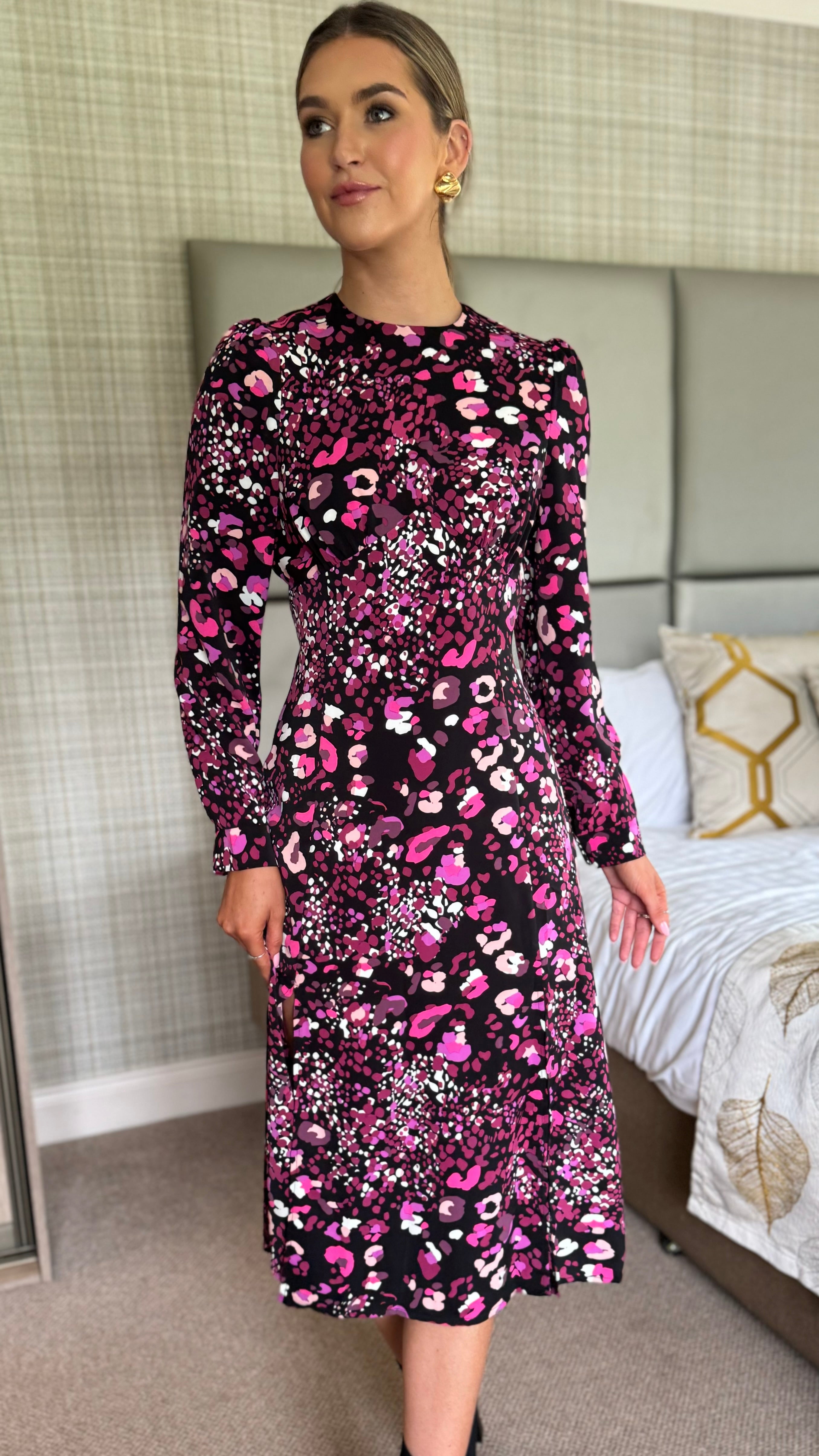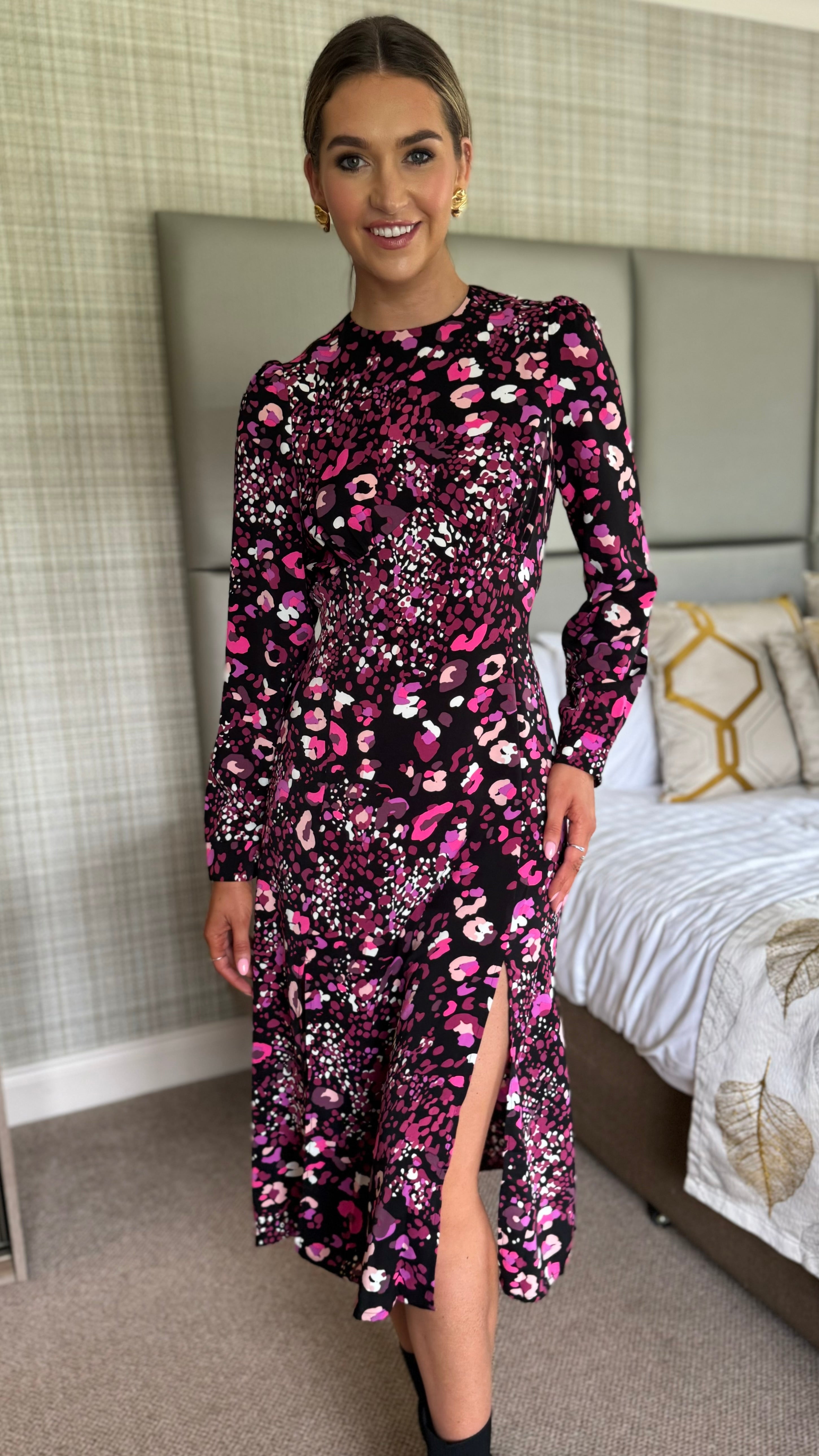 Fabulous is an understatement for our best-selling Cassia Purple Animal Round Neck Midi Dress! 🐆 Featuring a round neckline, long sleeves with cuff details, and intricate bust seams, this quirky animal print dress beautifully hugs your curves for a stunning silhouette. With two thigh-high splits, it’s perfect for every occasion. Pair with trainers or boots for a cool daytime look, or slip on your favourite heels and get party-ready! 💜✨