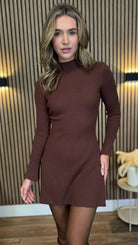 Embrace cozy chic in the Deirdre Brown High Neck Knitted Mini Dress. Crafted from soft ribbed knit, it hugs you comfortably while the playful flute sleeves add a fun twist. The high neckline and skater silhouette create a stylish, flattering look perfect for any occasion where you want to feel both comfy and confident.