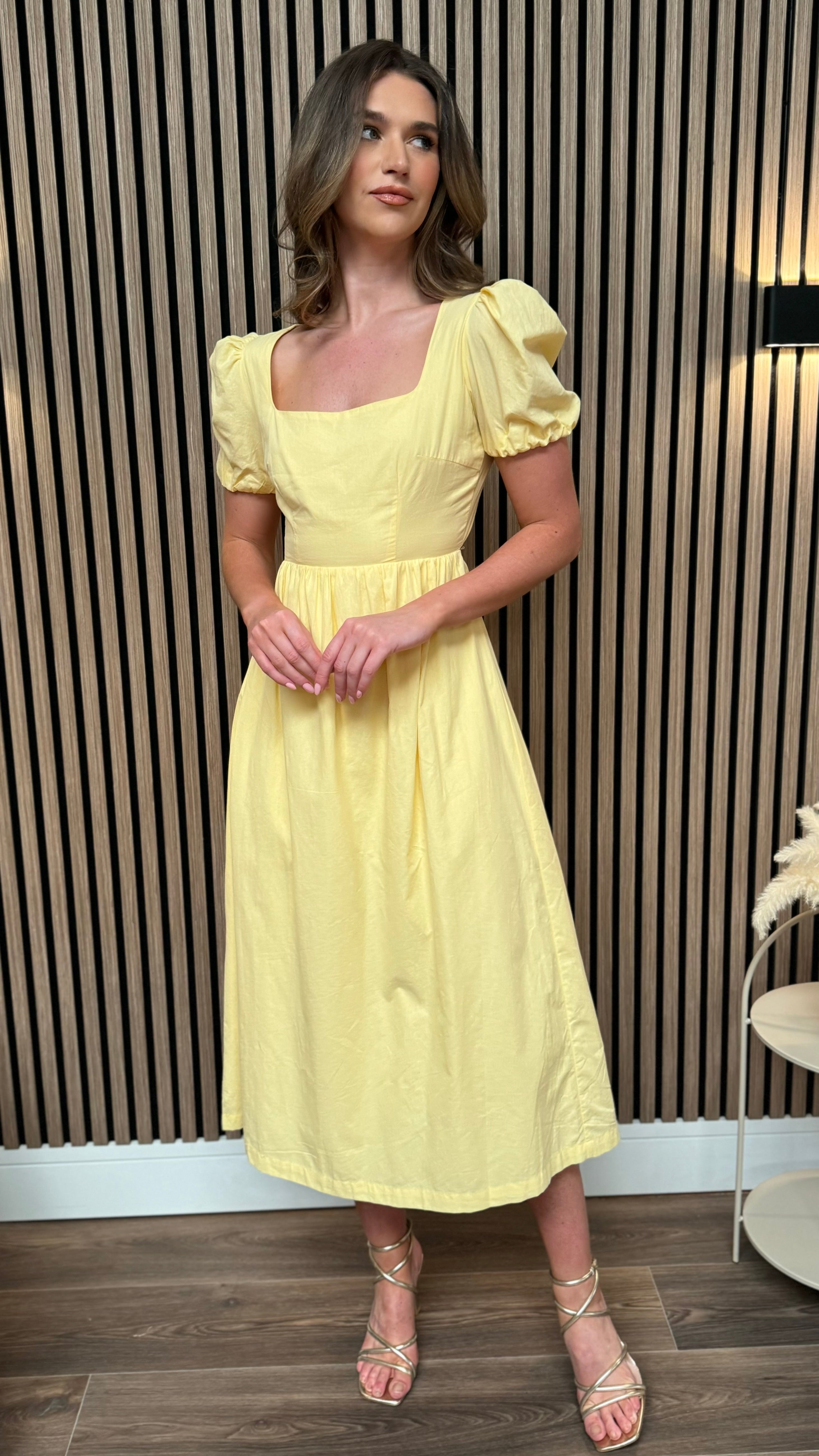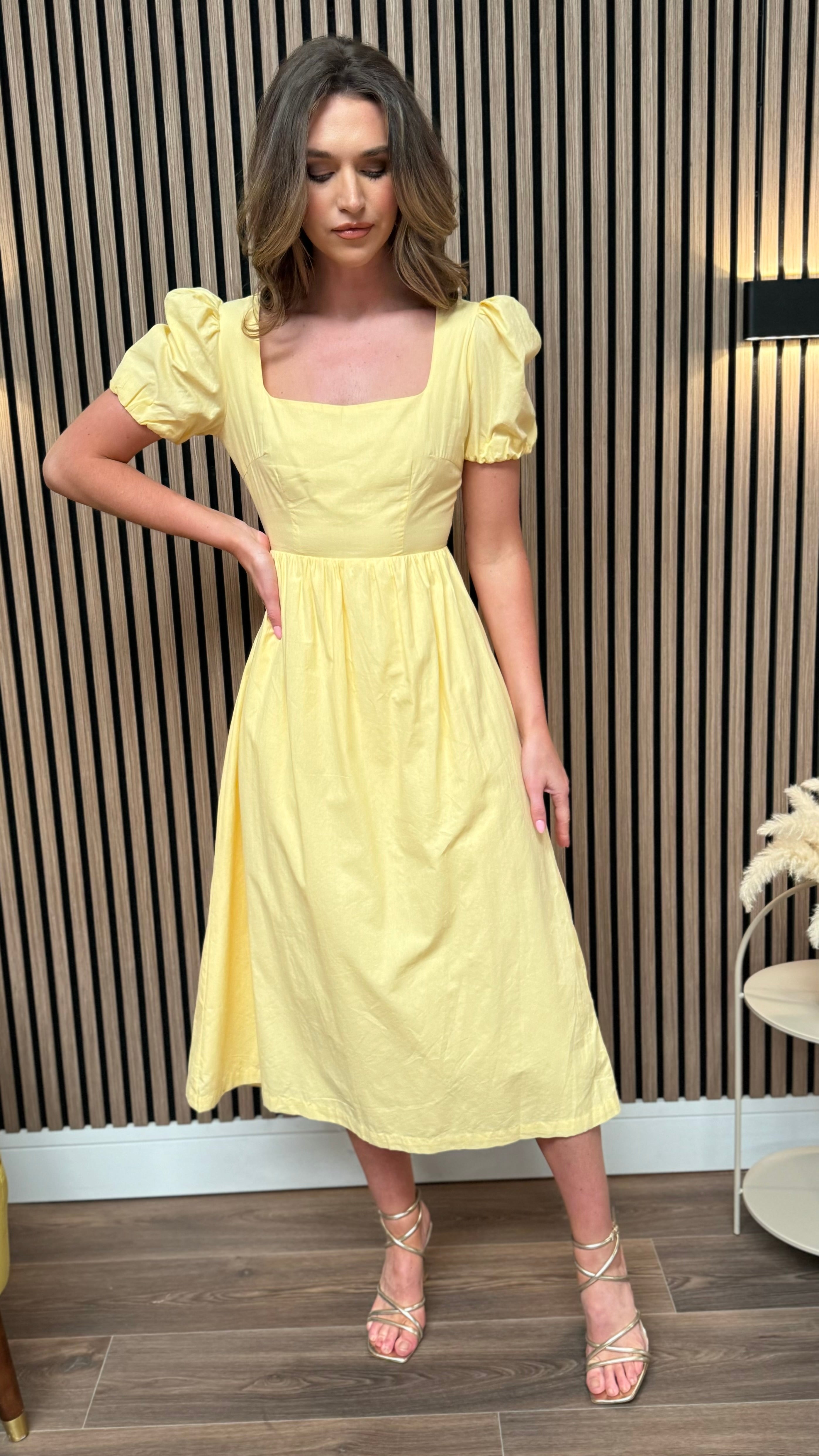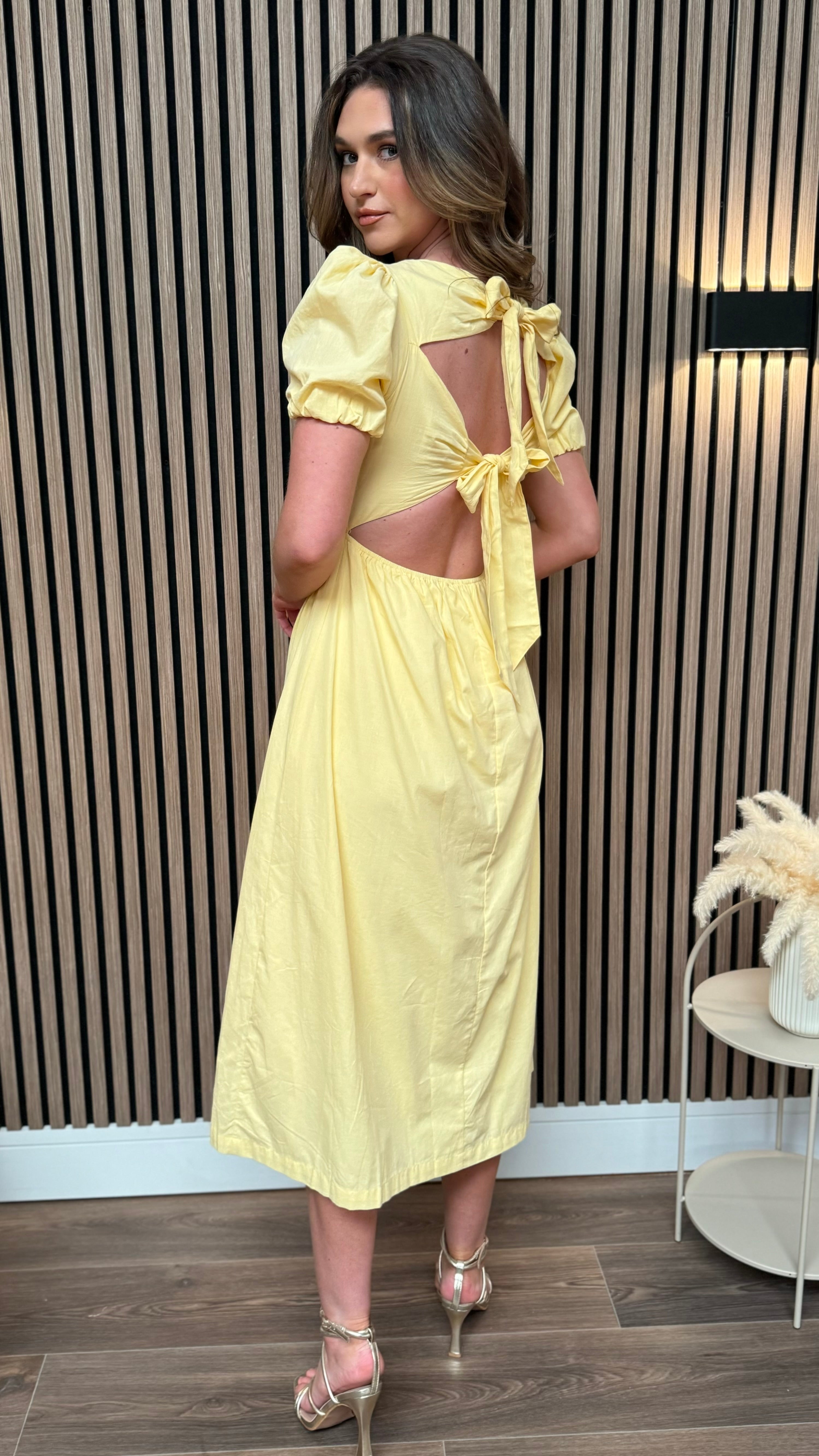 Deren Yellow Puff Sleeve Back Cut Out Midi Dress