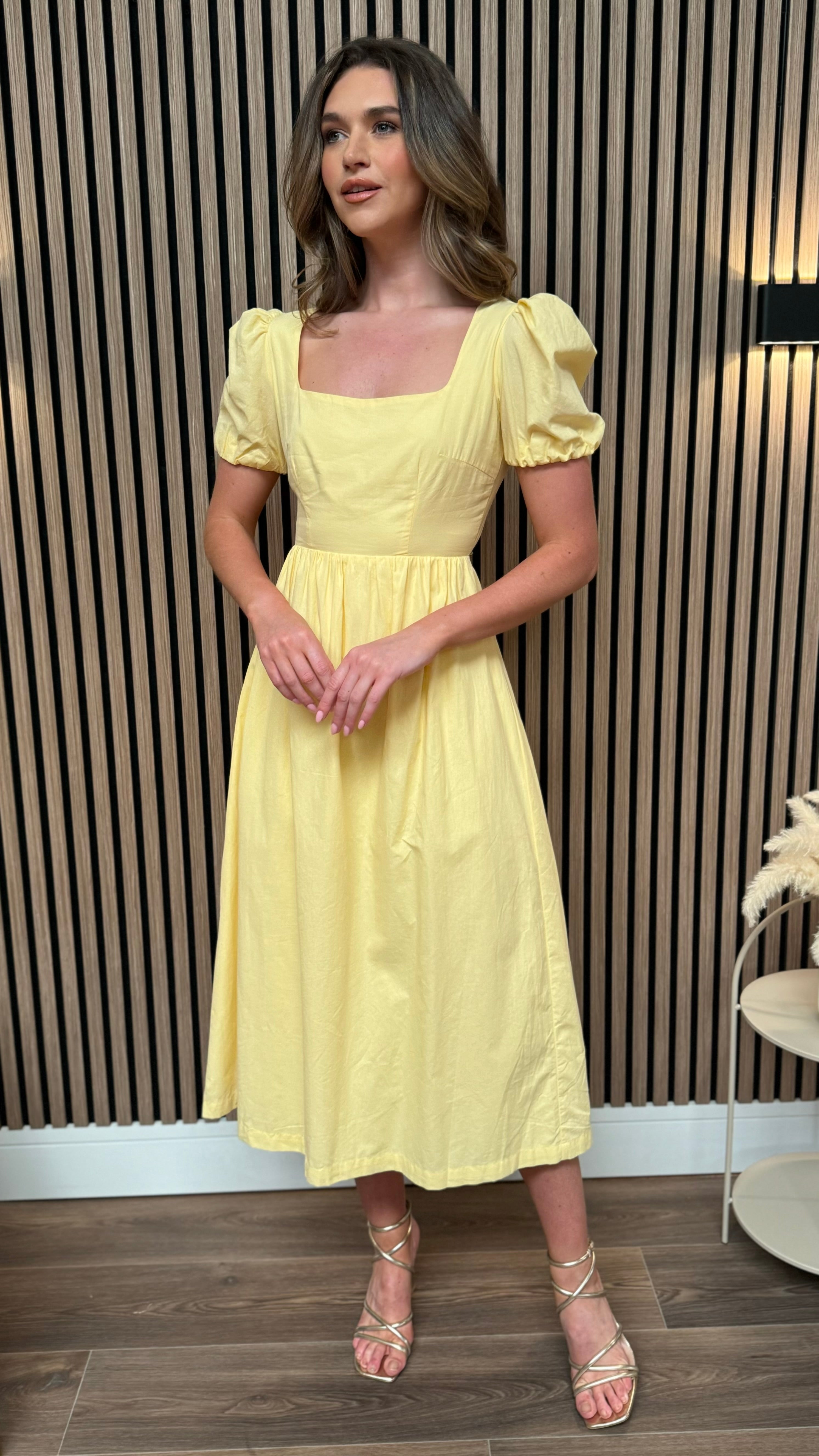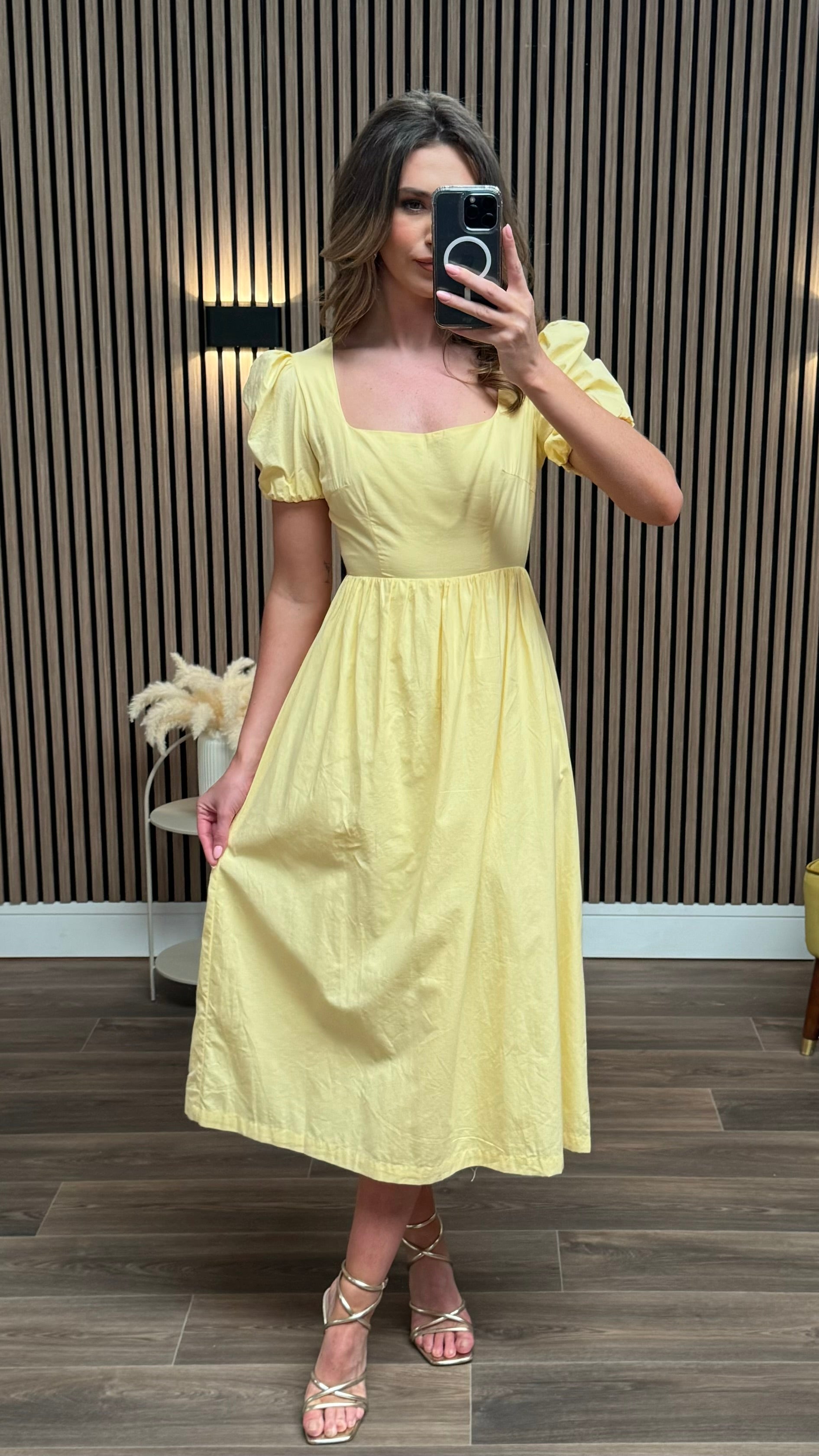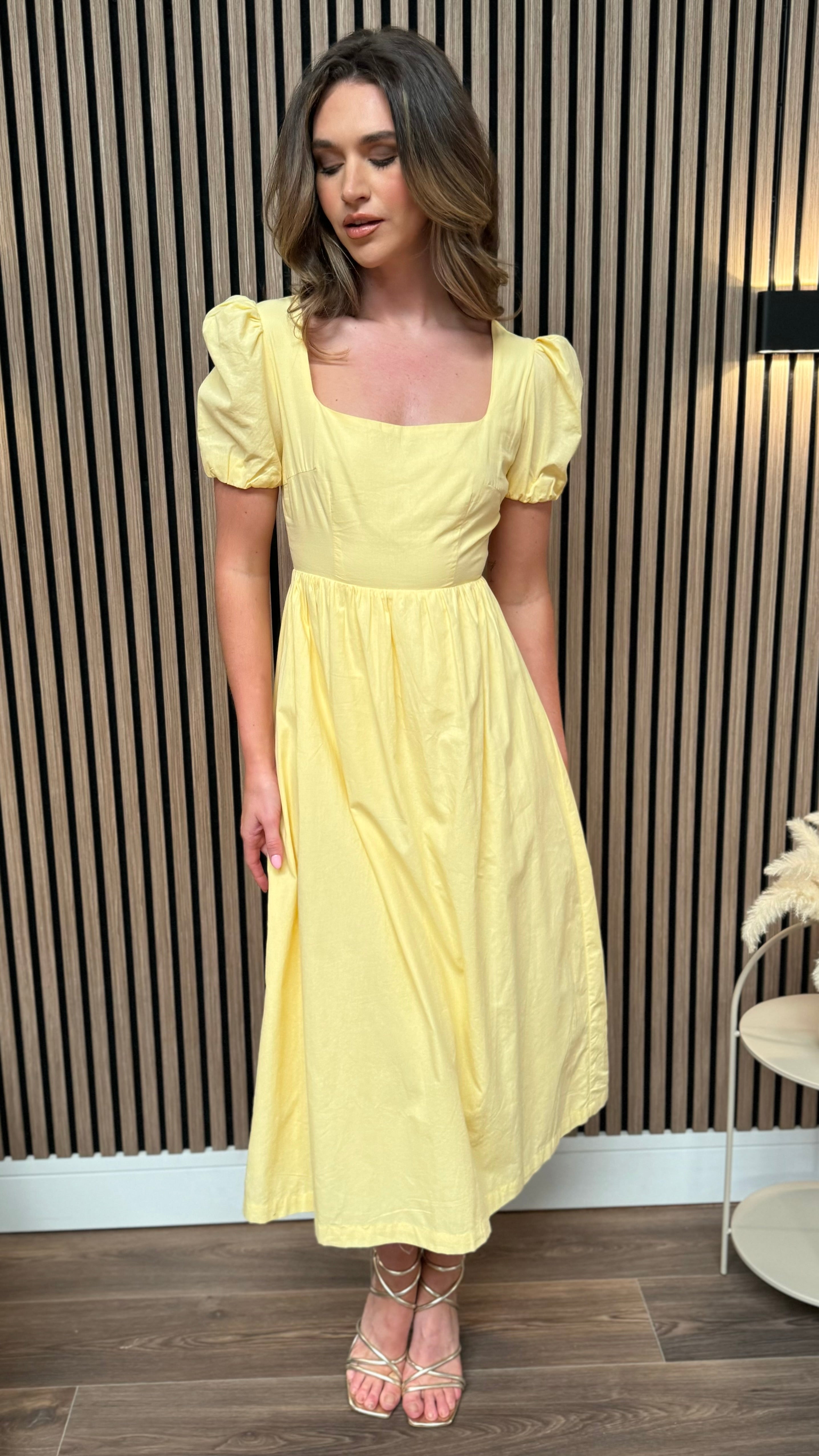 Deren Yellow Puff Sleeve Back Cut Out Midi Dress