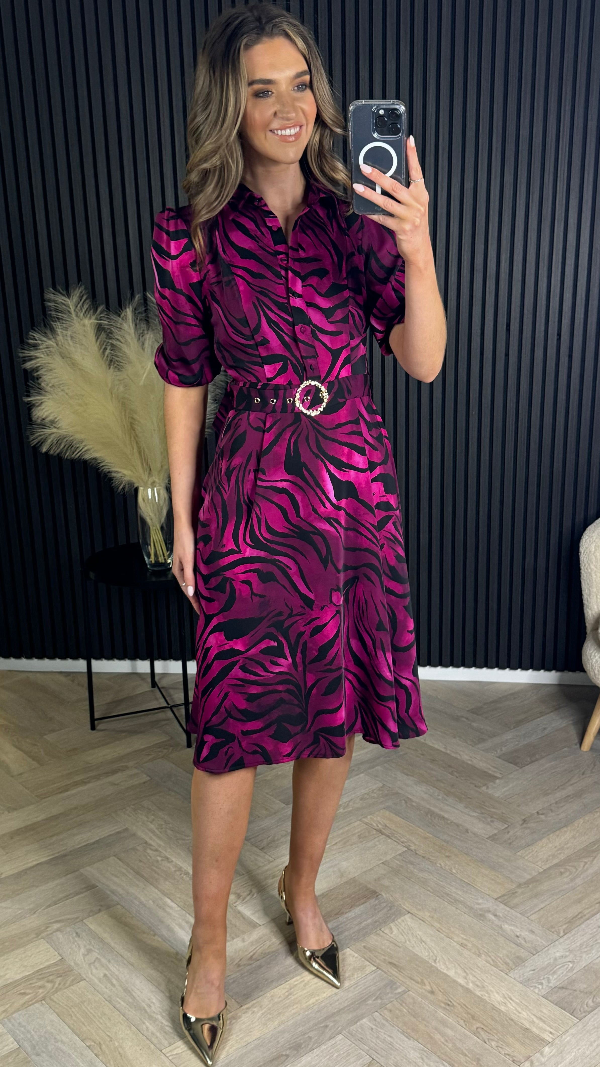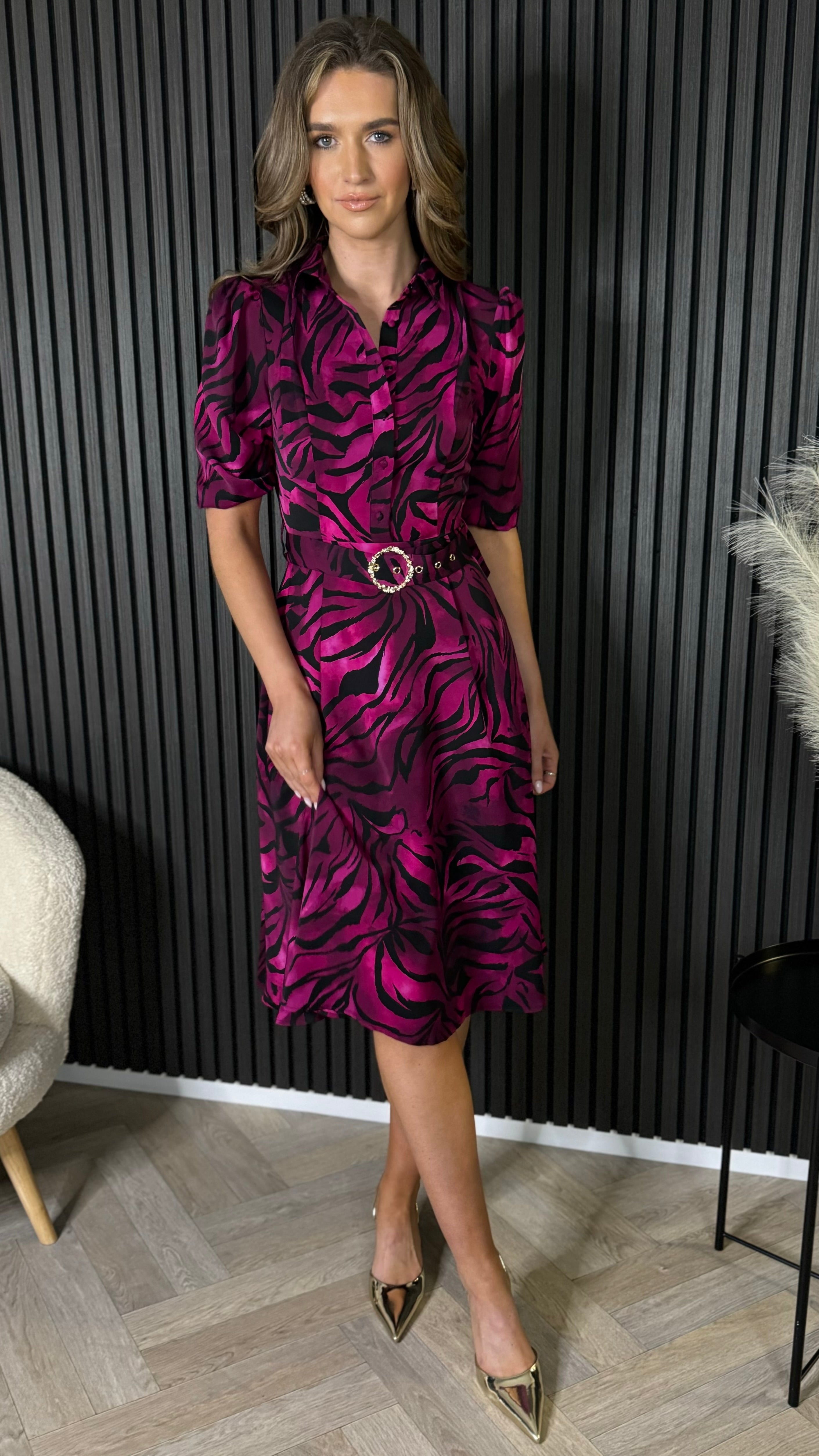 Dervla Pink & Black Leopard Print Collared Midi Dress