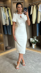 Dionne White Puff Sleeve Bow Detail Midi Dress (PRE-ORDER)