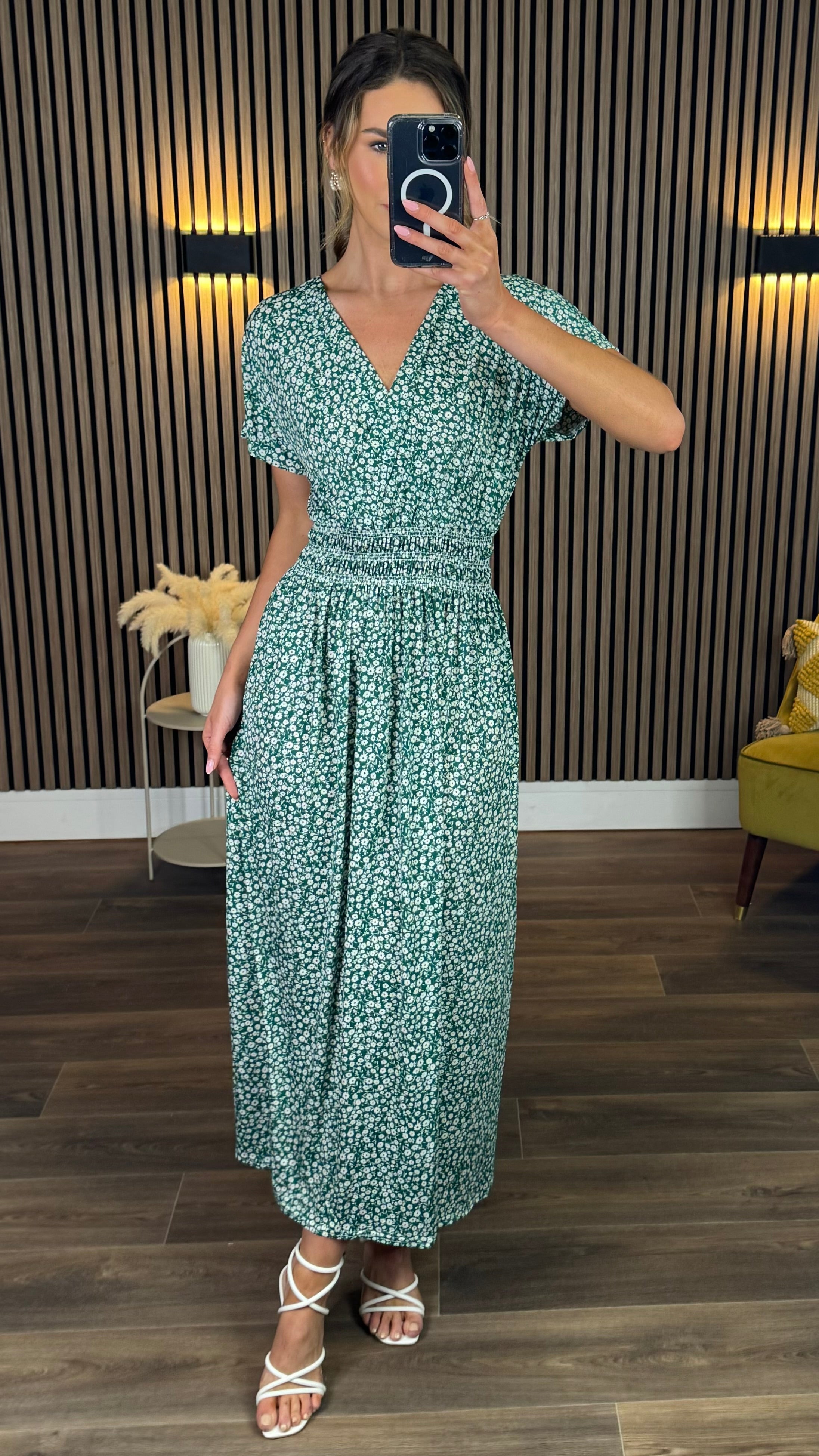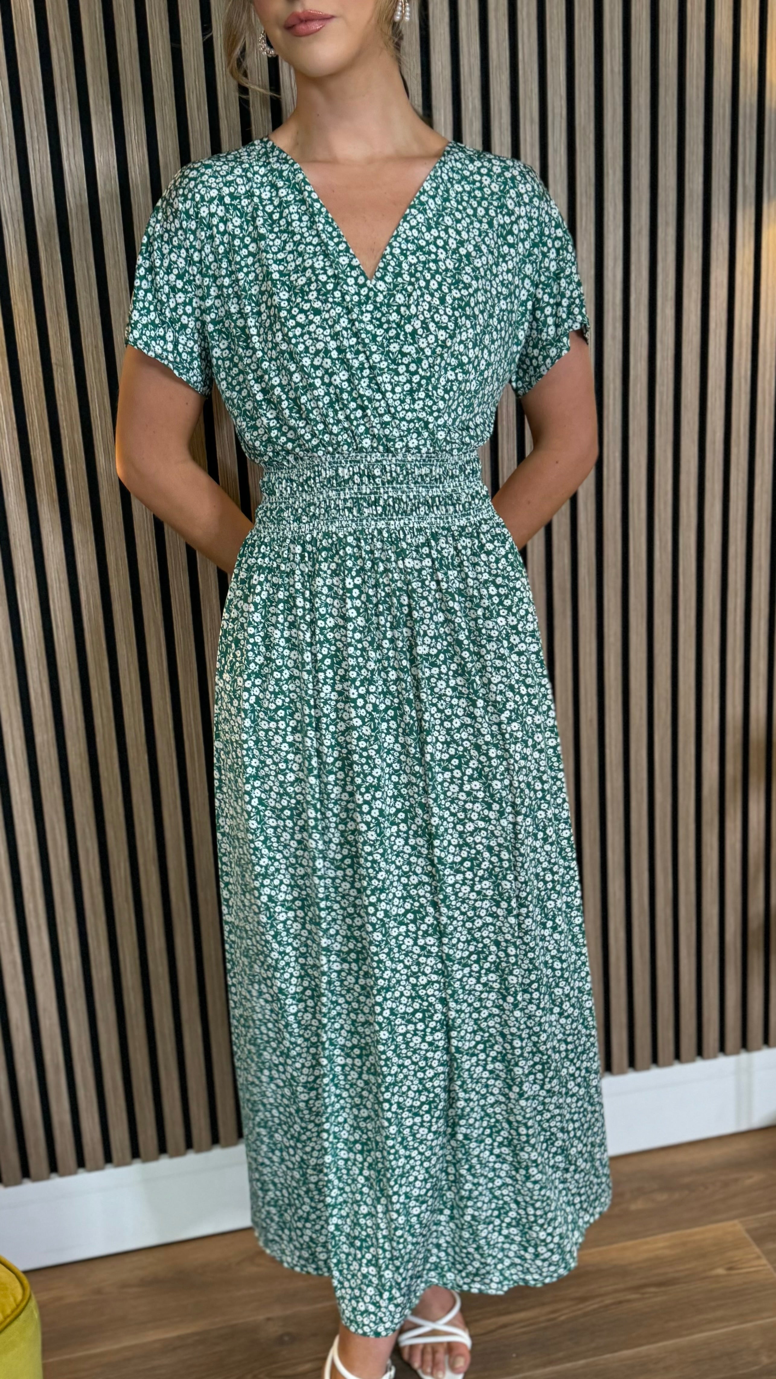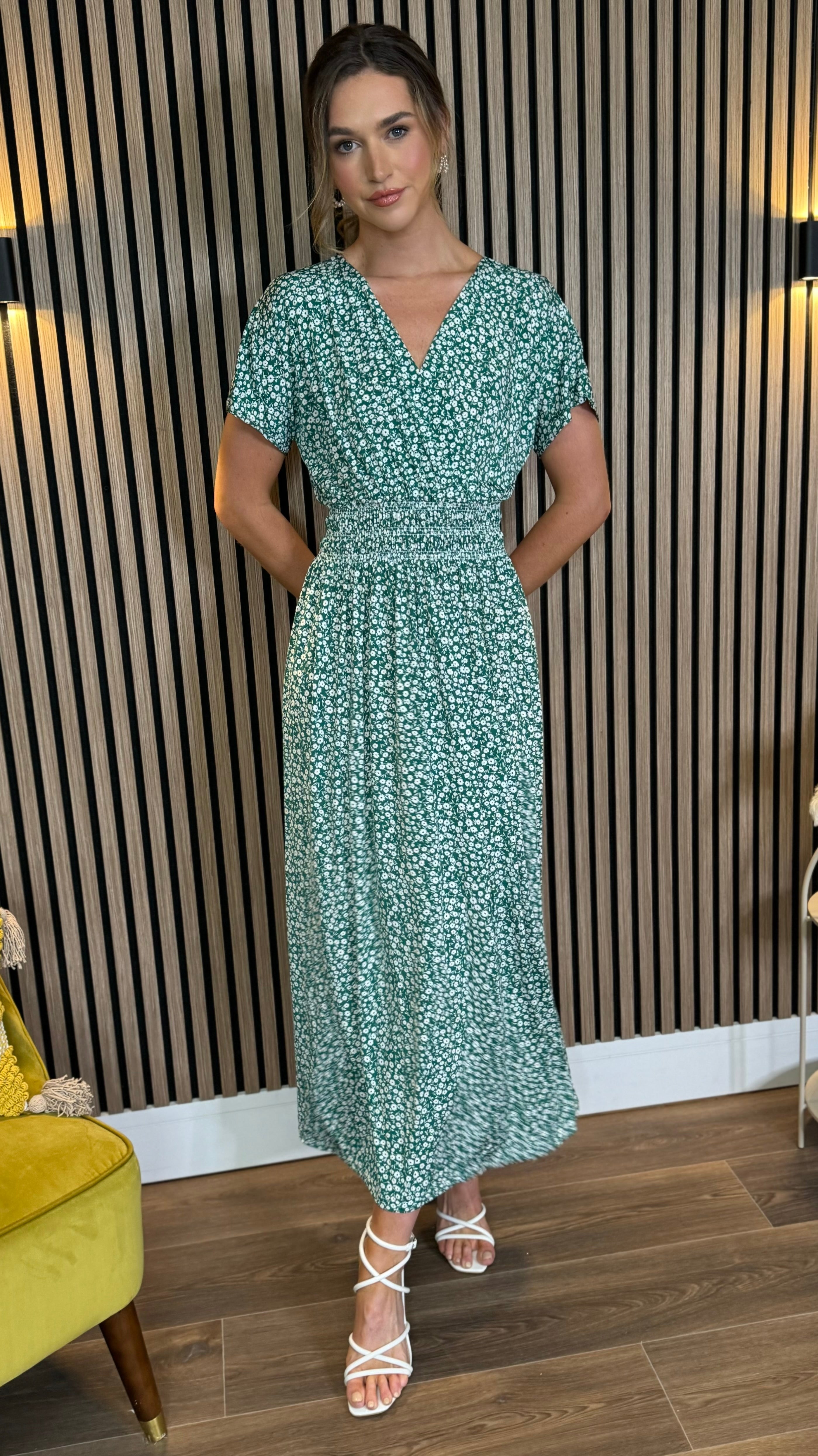 Elowyn Green & White Floral Wrap Top Cap Sleeve Midi Dress