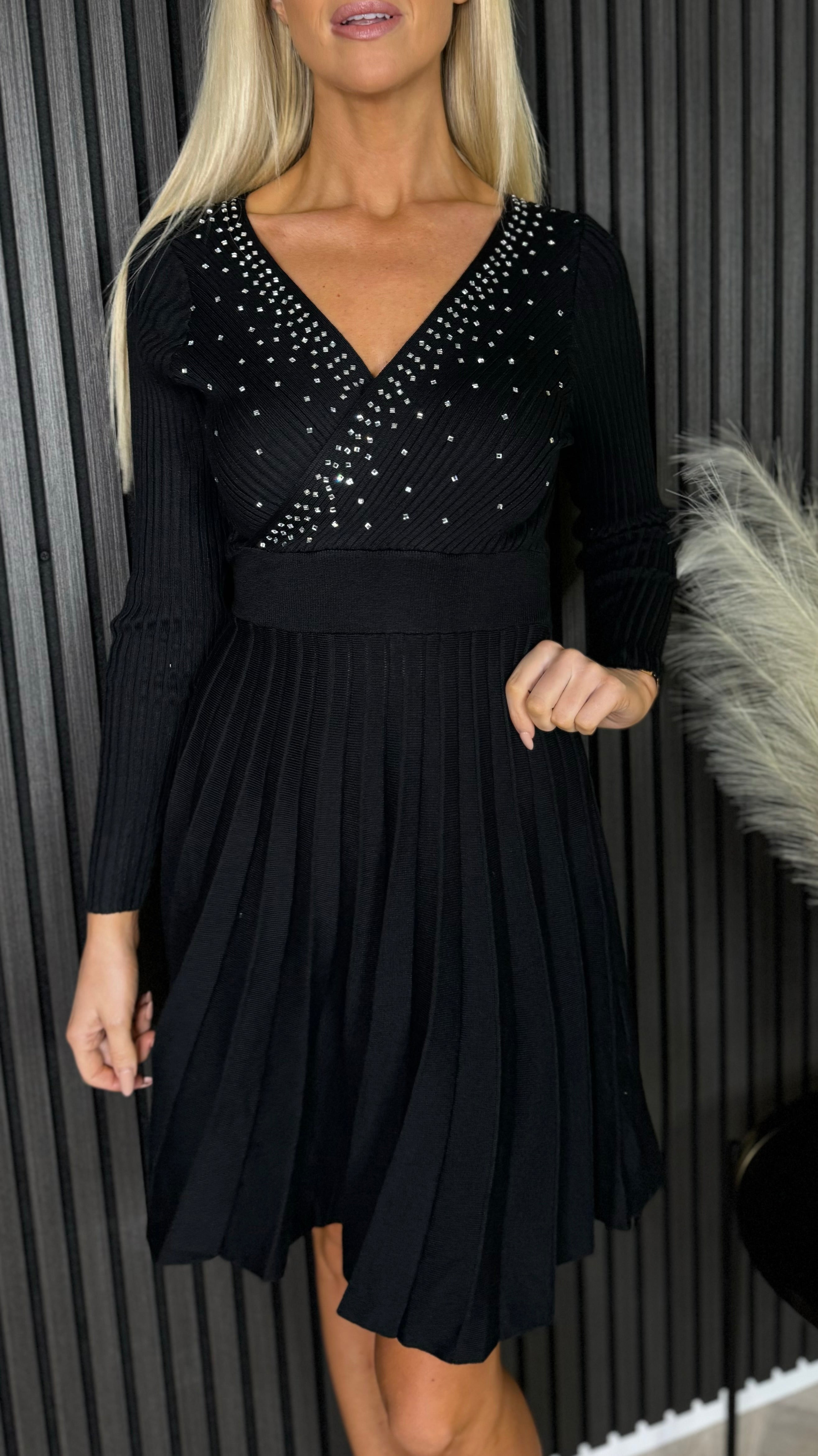 Emily Black Embellished Detail Knit Pleated Mini Dress
