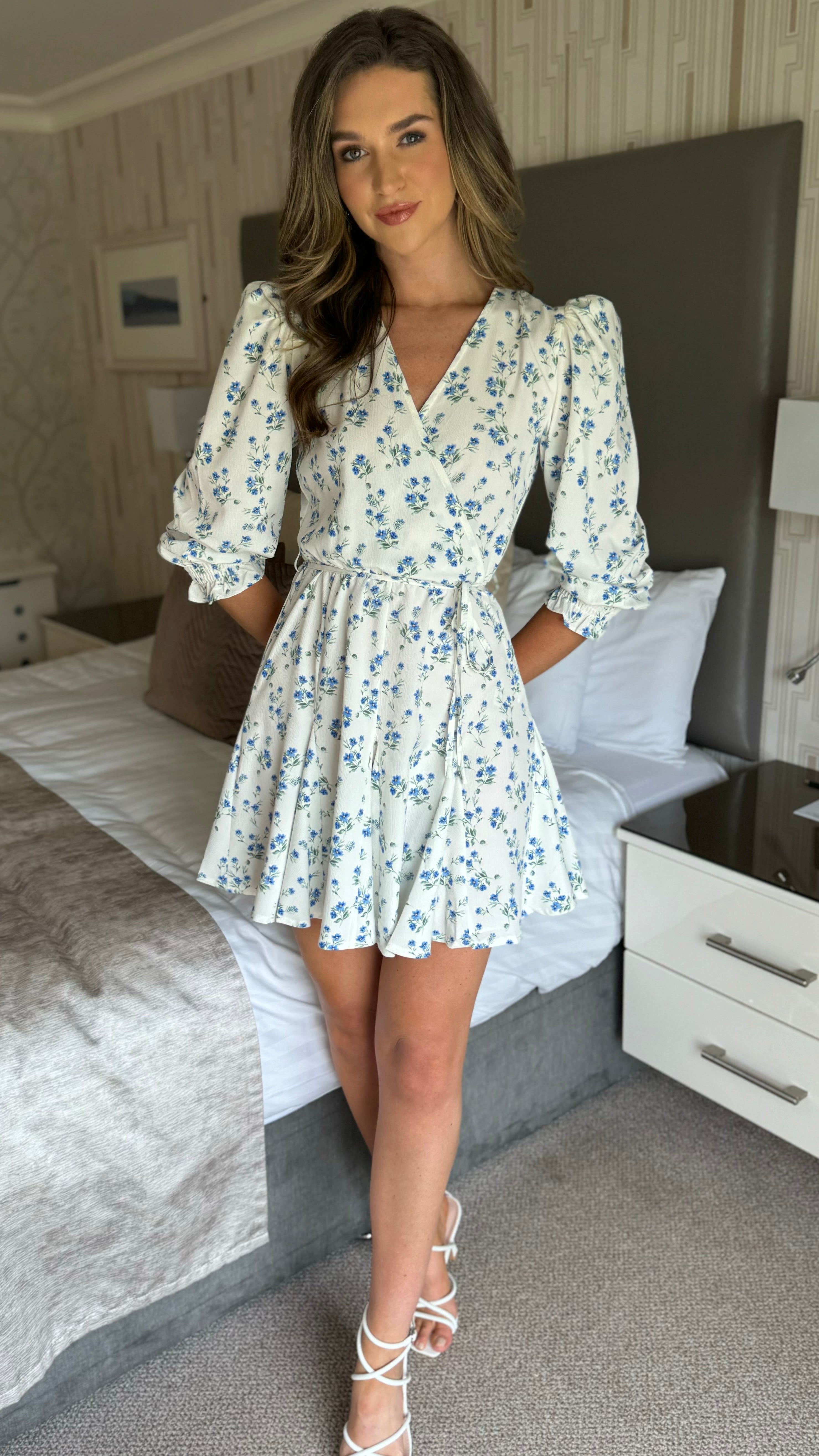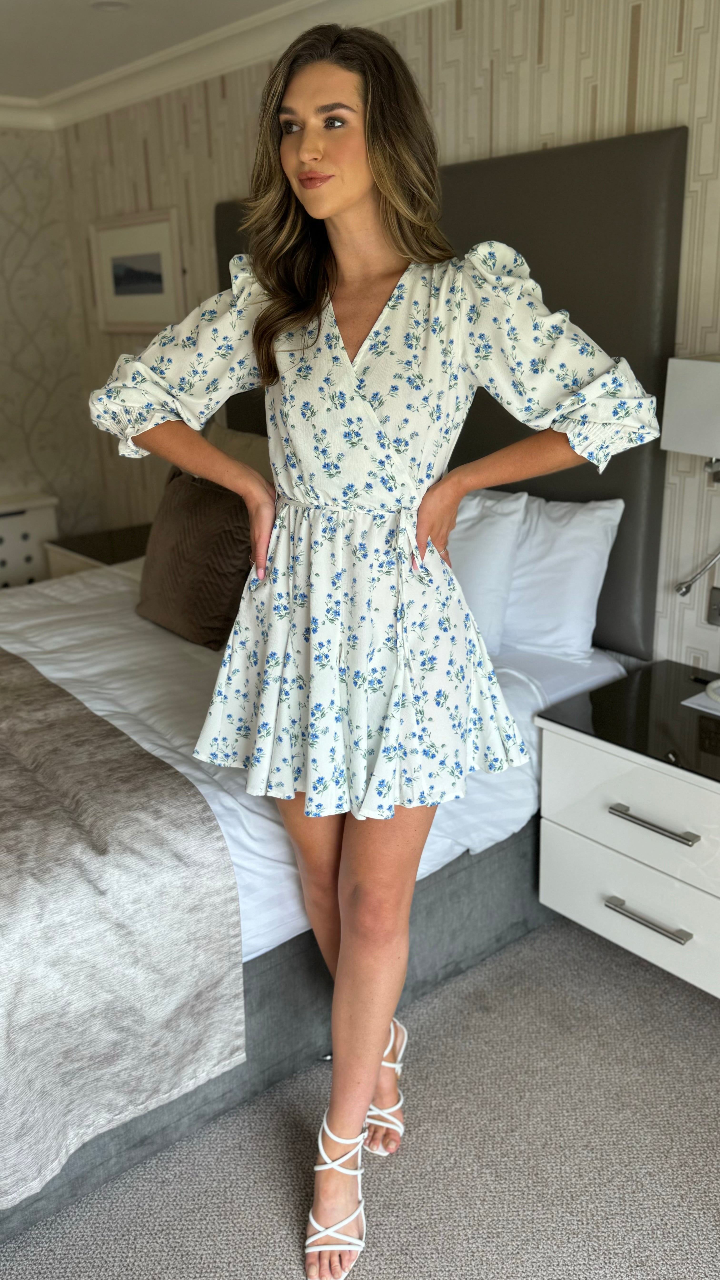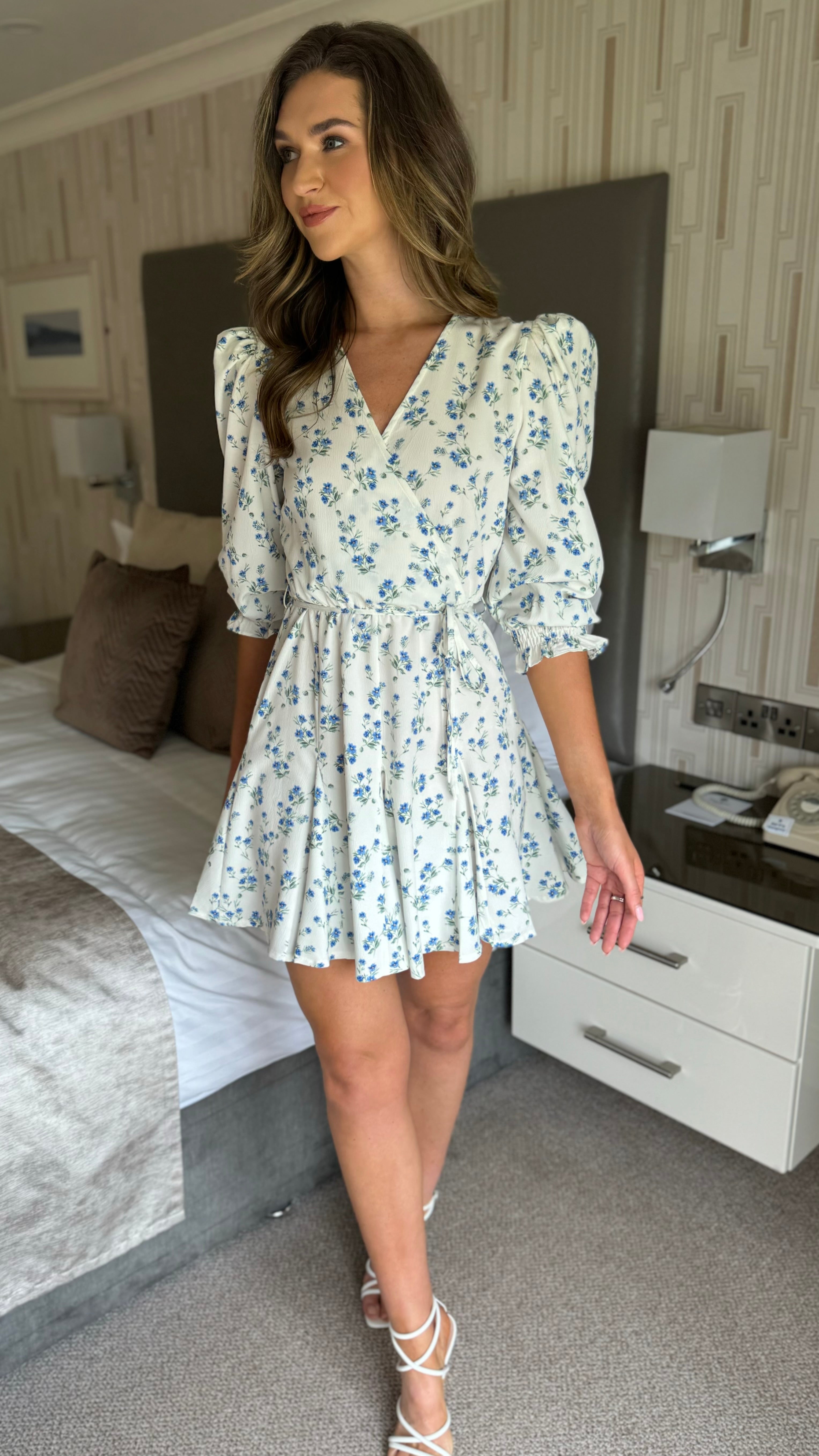 Emma White & Blue Ditsy Floral Print Skater Mini Dress