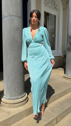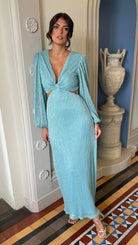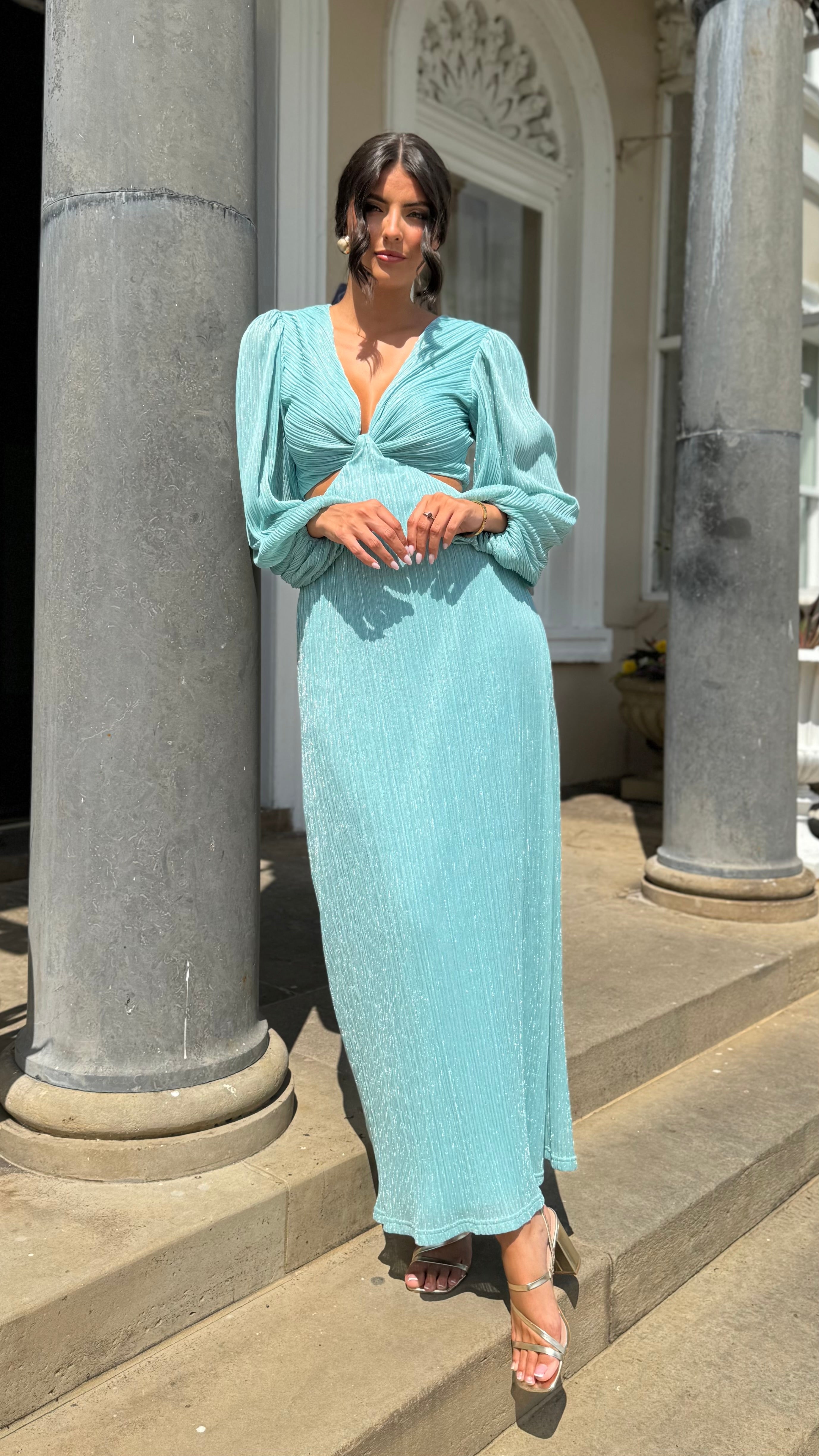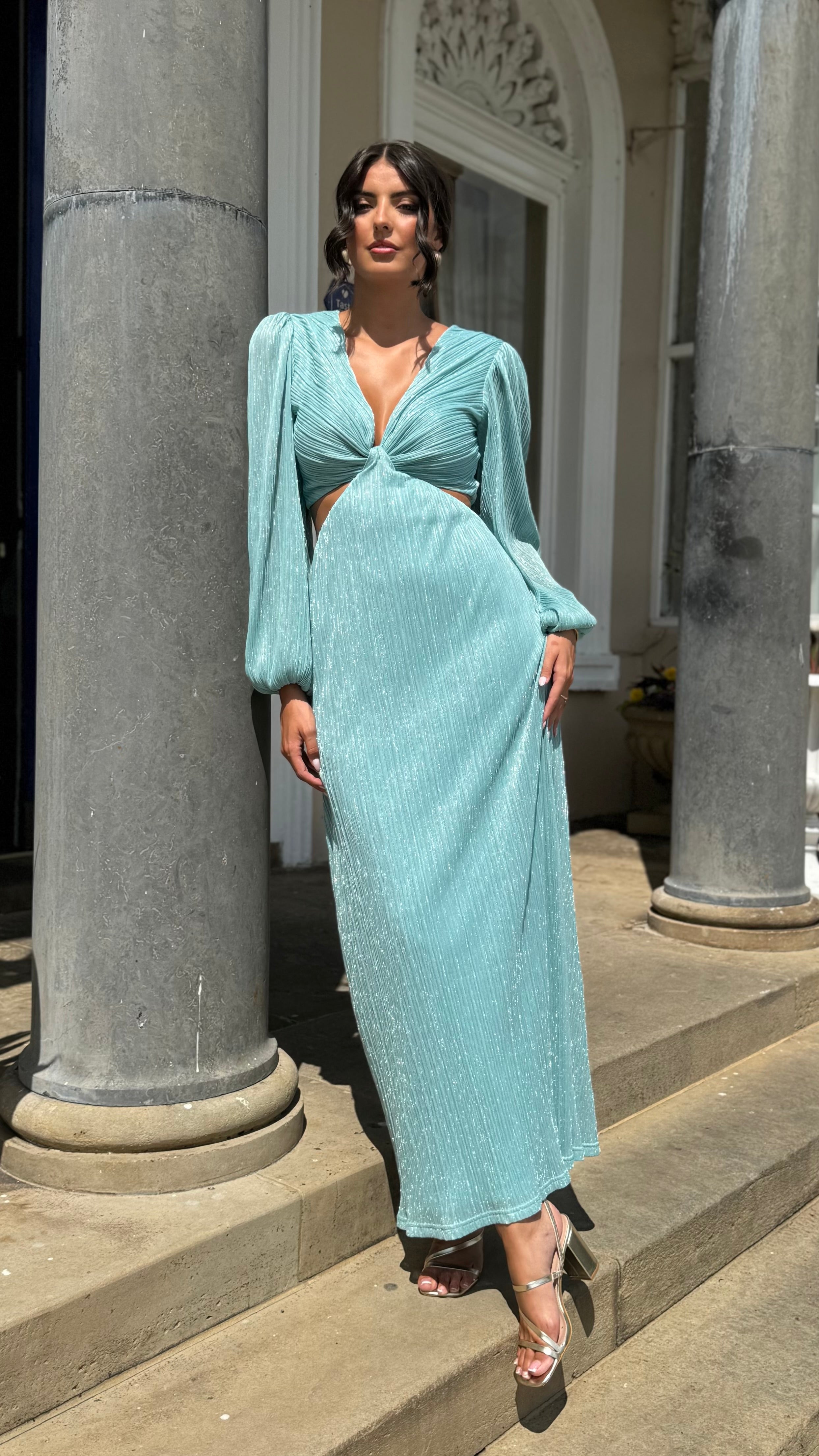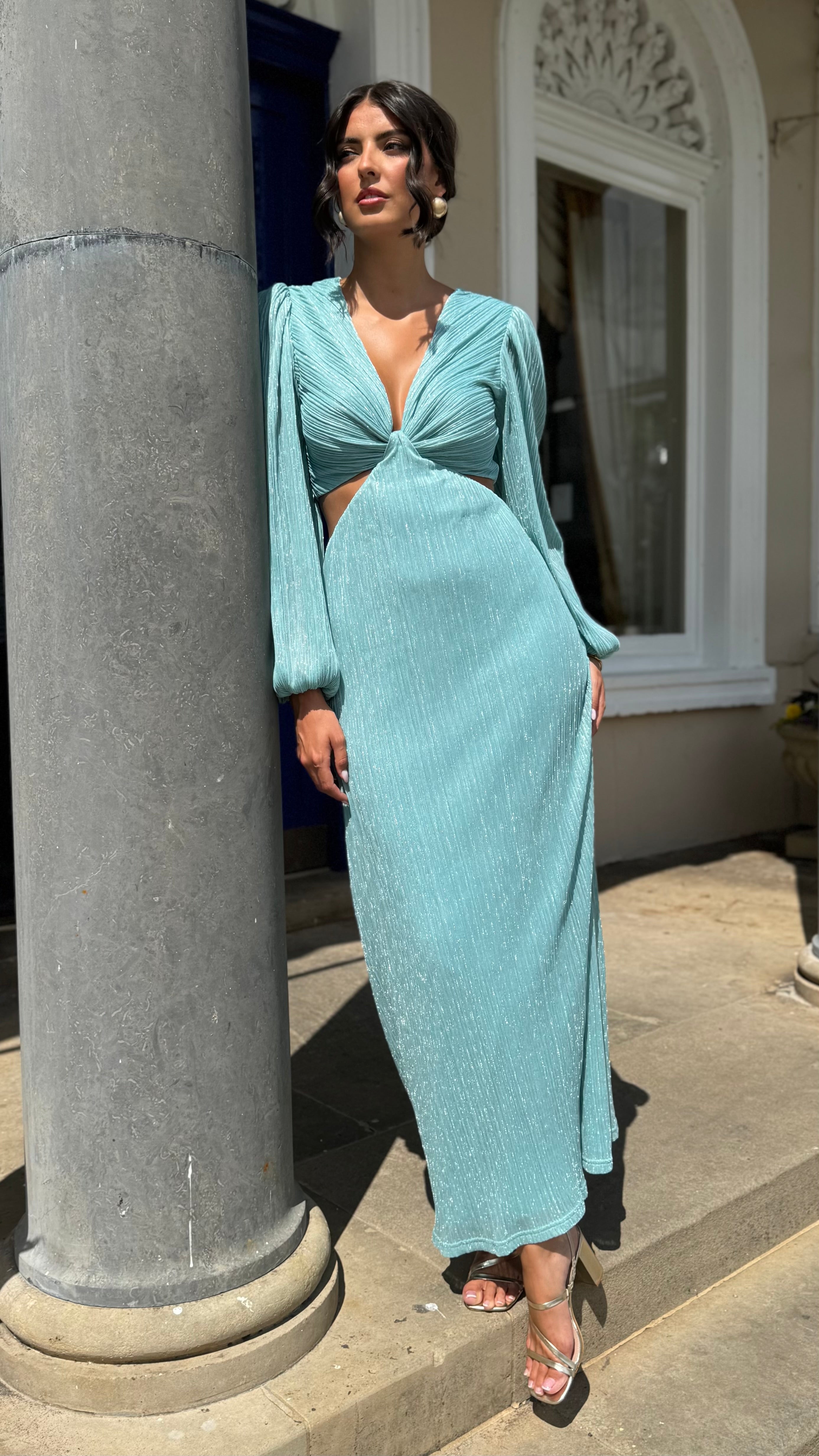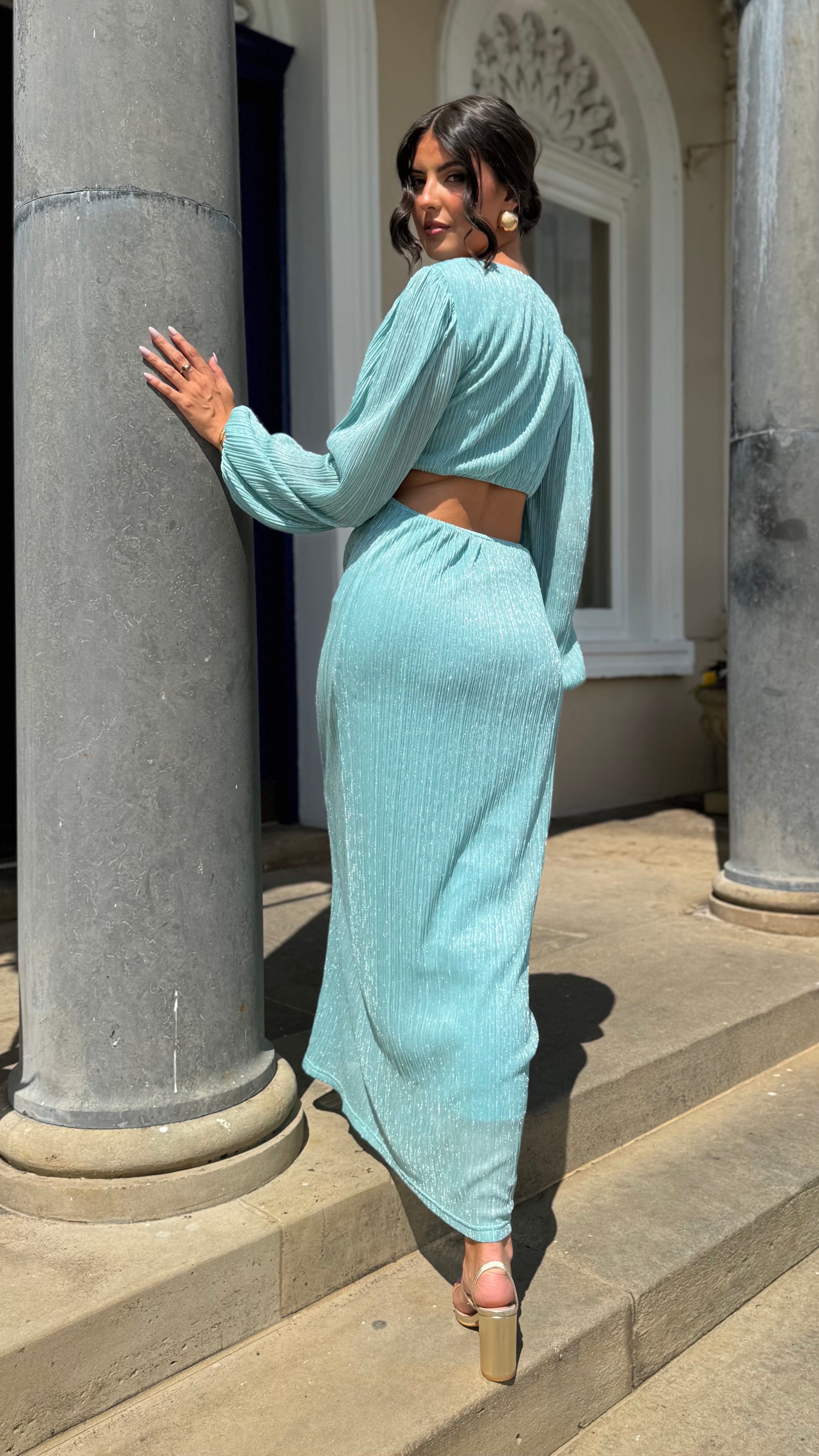 Zaya Metallic Blue Cut Out Long Sleeve Plisse Maxi Dress
