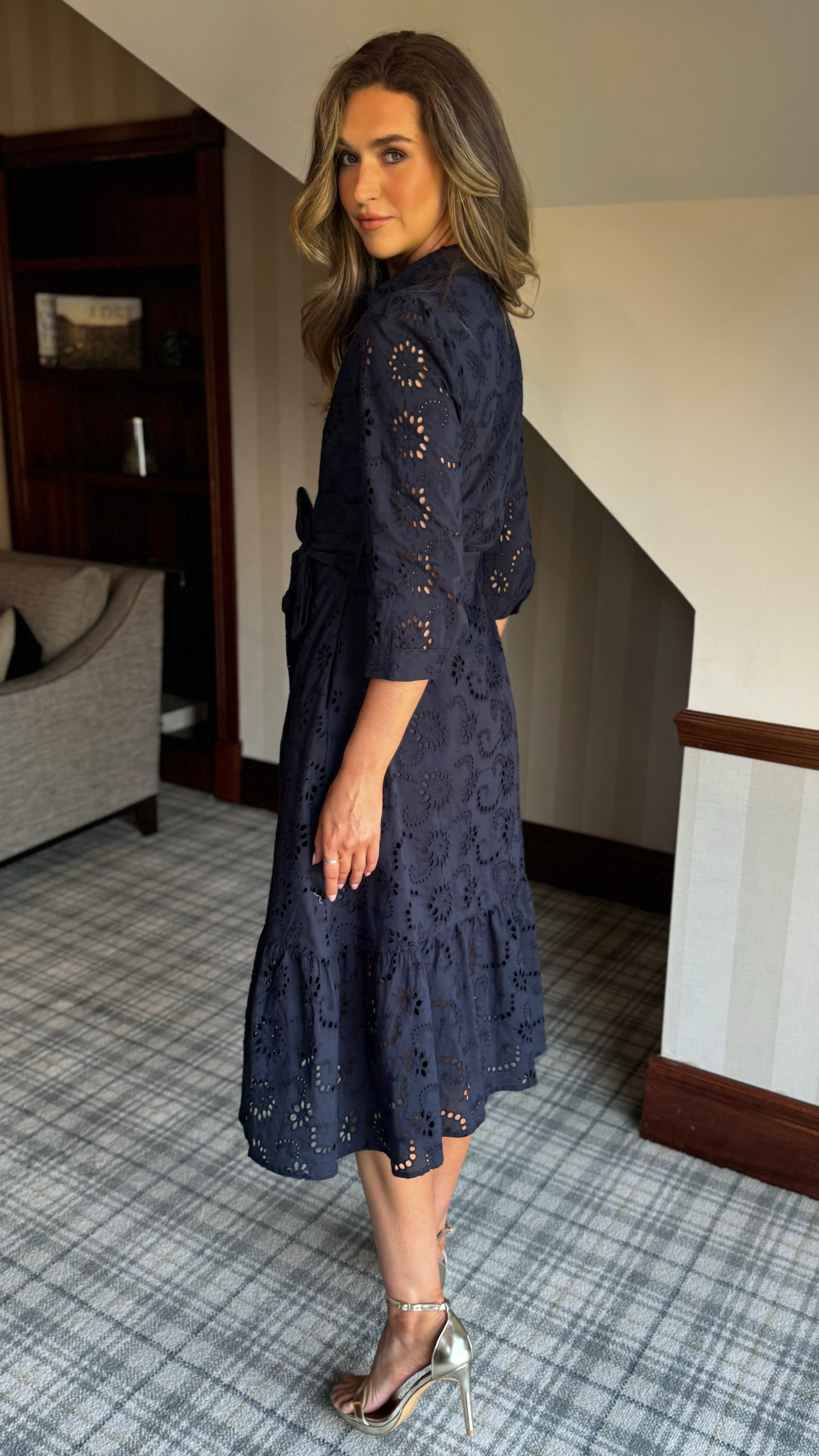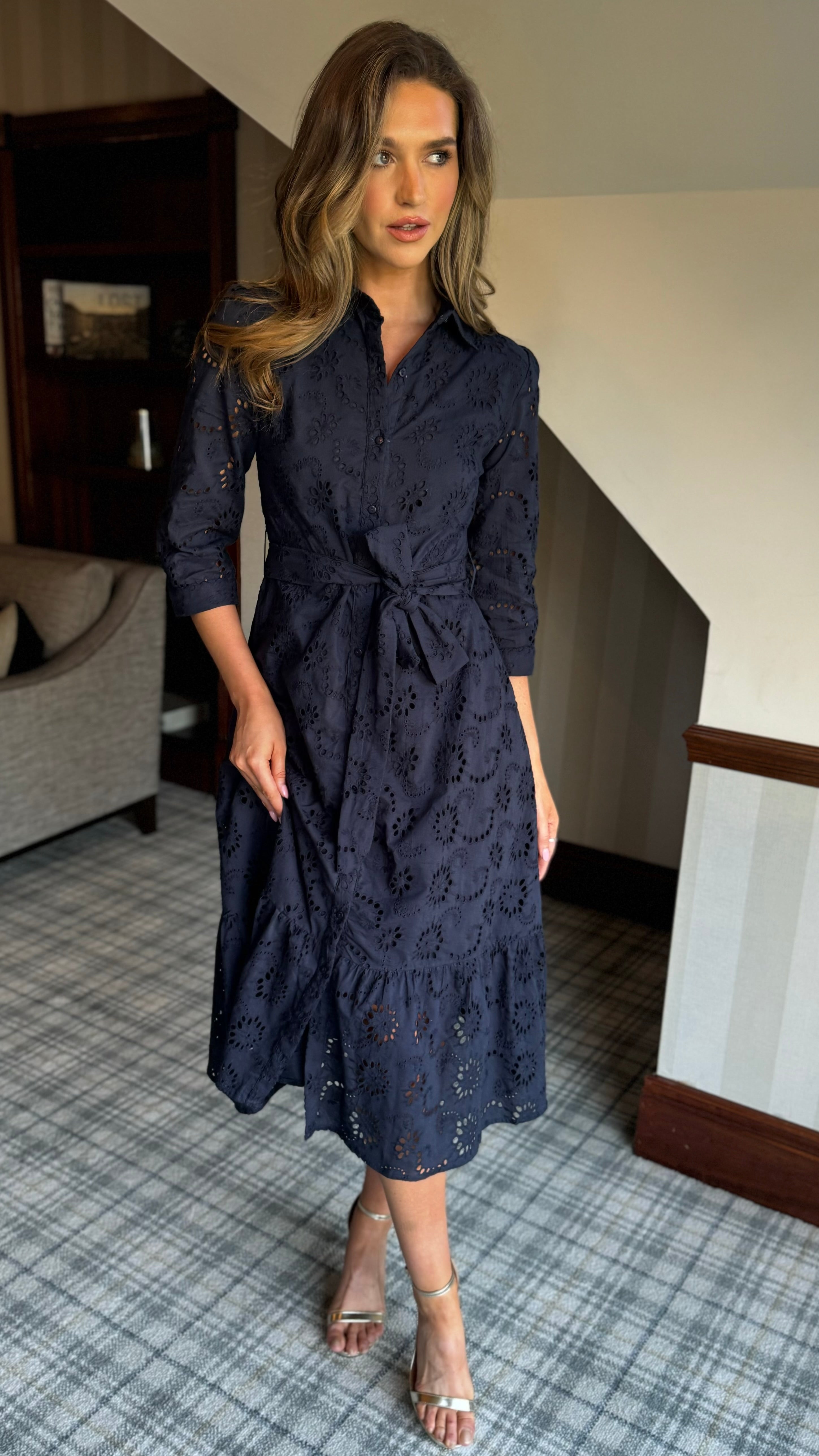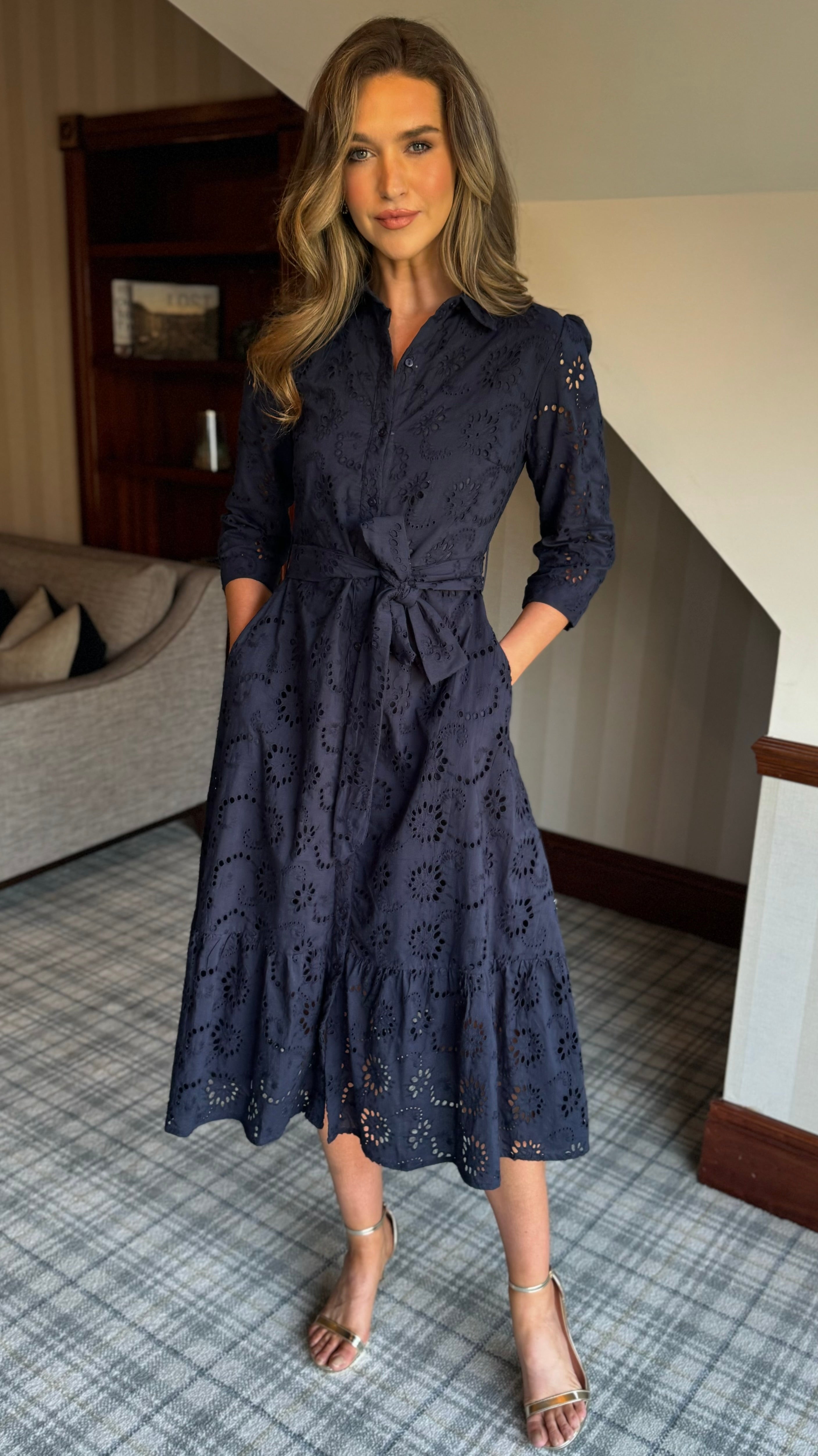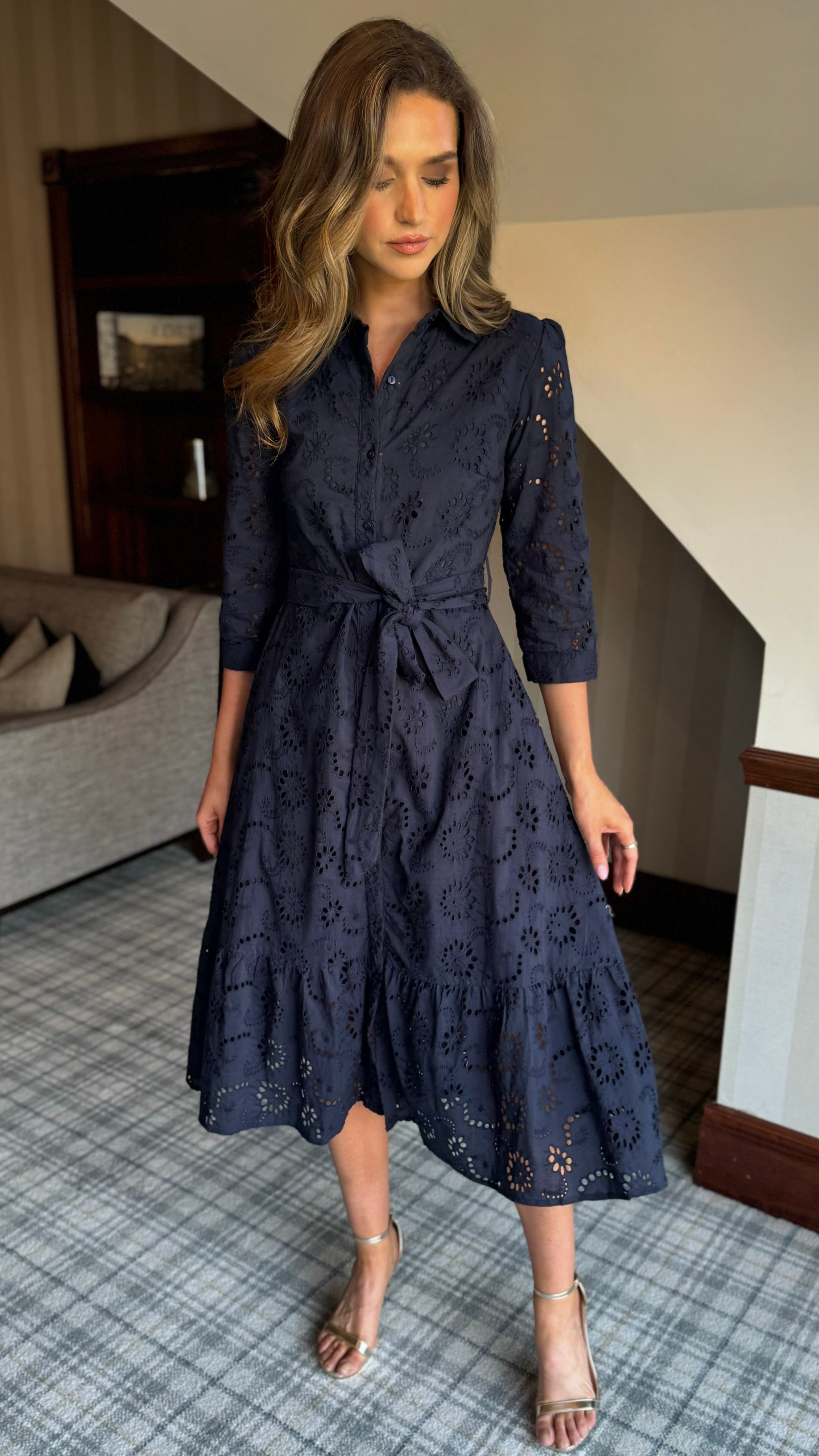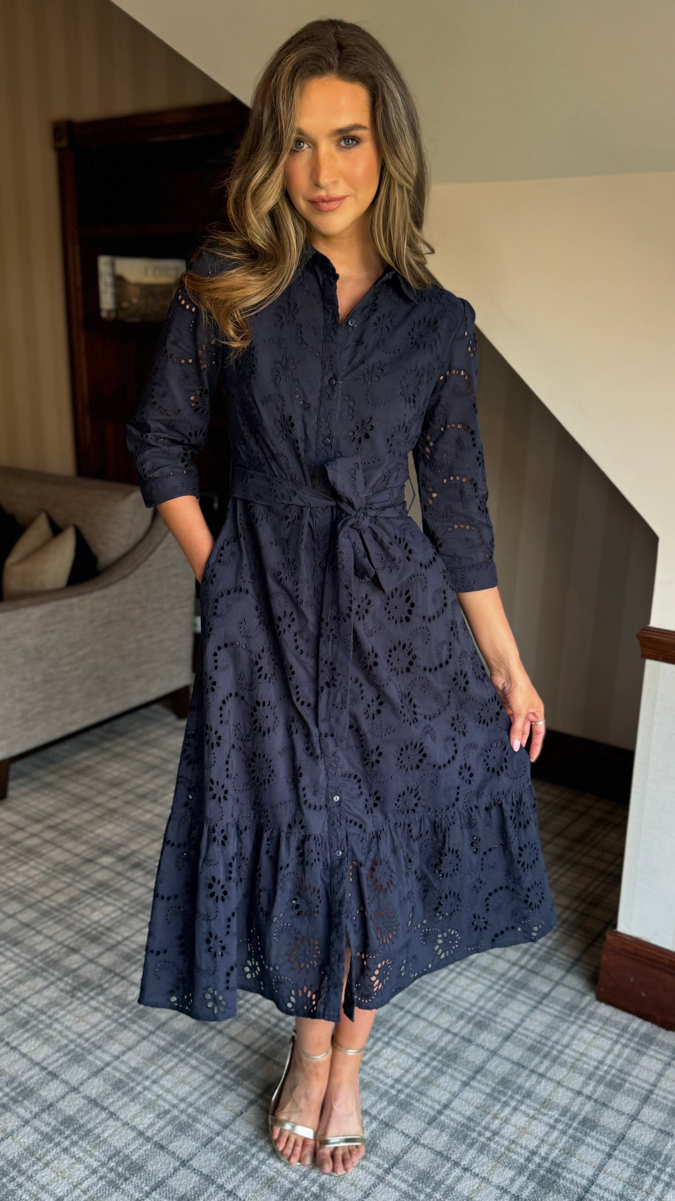 Looking for the perfect city break outfit? Look no further than the Gabby Navy Broidery Shirt Midi Dress! With its button front detailing, Cotton broidery fabric, and convenient pockets, this dress is a must-have in your wardrobe. Dress it up with court heels or down with boots for a versatile and stylish look! 😍